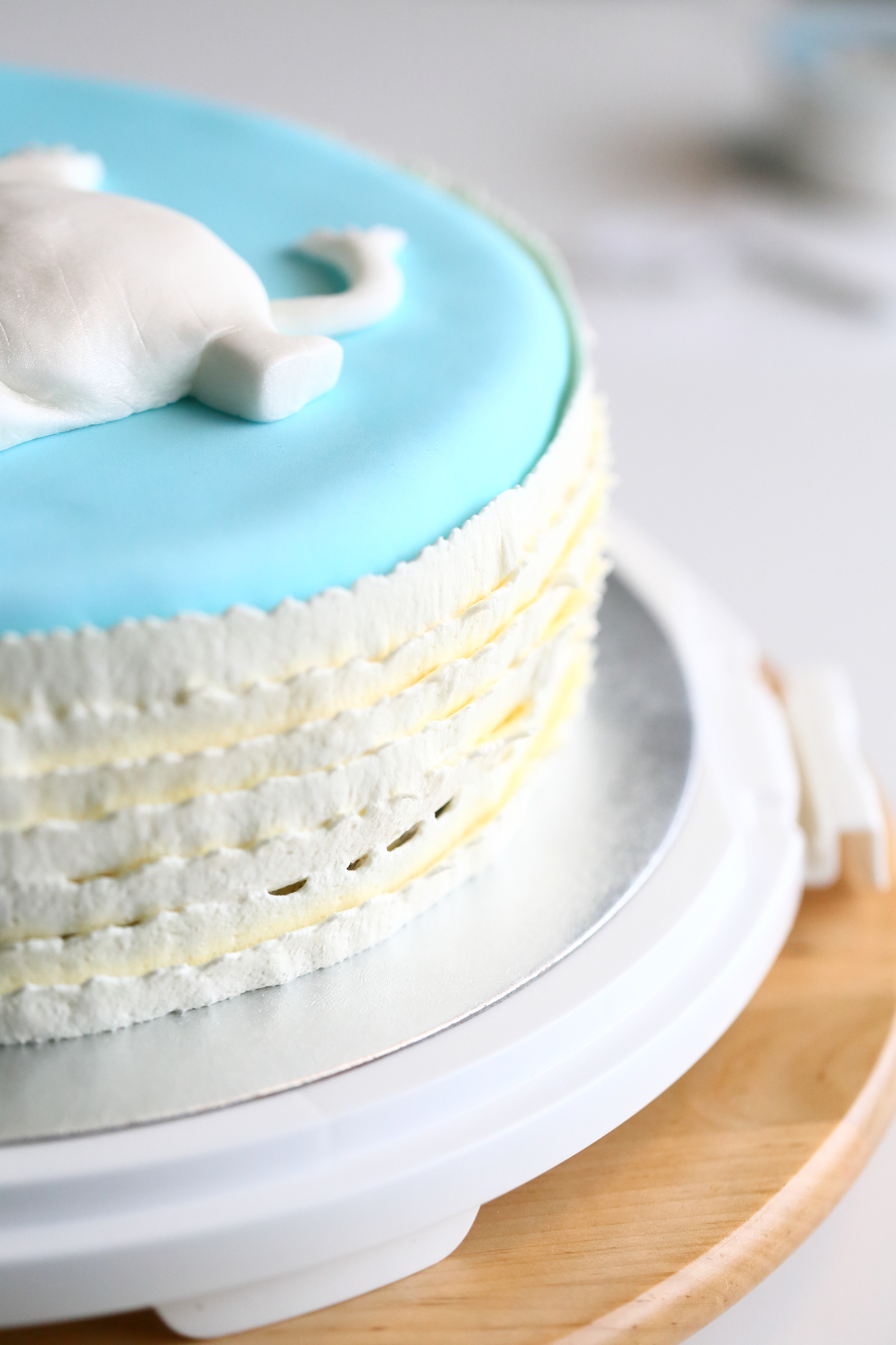 Kun täyte on hyytynyt, poista vuoan reunaosa kakun ympäriltä. Vatkaa 1 dl vispikermaa vaahdoksi. Levitä kermavaahto ohueksi kerrokseksi kakun pinnalle ns. murukerrokseksi. Kaulitse sininen kaulintamassa hieman kakun halkaisijaa isommaksi pyöreäksi levyksi. Nosta levy kakun päälle ja painele kevyesti kakun pintaan tasaisesti kiinni. Vatkaa 4 dl vispikermaa vaahdoksi ja pursottele kakun reunoille lehtityllaa käyttäen.