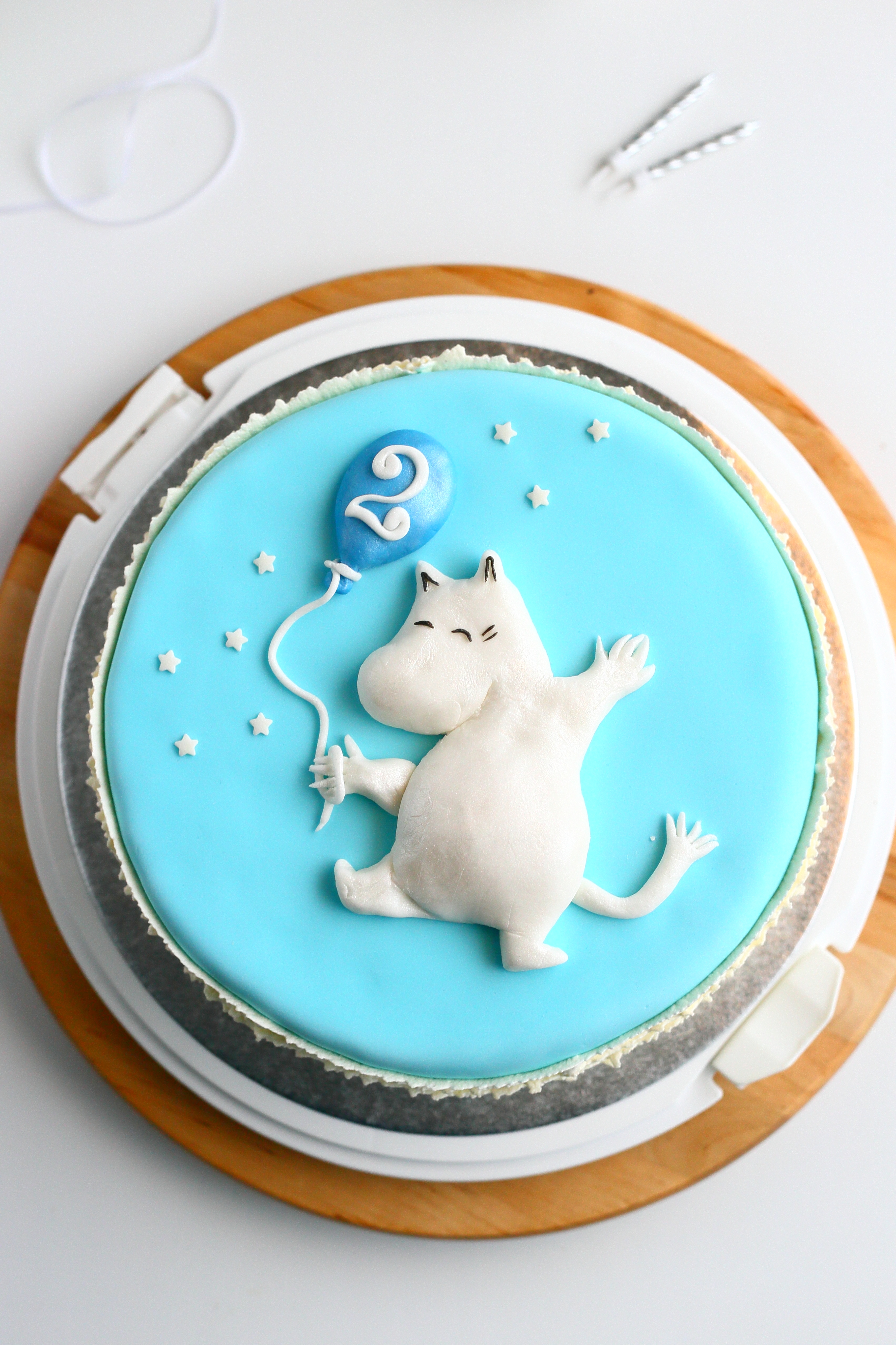 Sain viime vuoden puolella pyynnön tehdä kummipoikani 2-vuotisjuhliin kakun. Yksi pojan lempparihahmoista on muumit, joten sellainen päätyi myös tanssahtelemaan kakun päälle ilmapalloa kädessään pitäen. Kakun sisustan kanssa sekä muun koristelun suhteen sain vapaat kädet. Kakun sisältä löytyikin lopulta suklaata ja appelsiinia. Kakkupohja syntyi ilman kananmunaa Mielettömän mehevää suklaakakkupohjan tyylisellä taikinalla. Sanon jo heti, että tulipas hyvä pohja! Ja kakku muutenkin