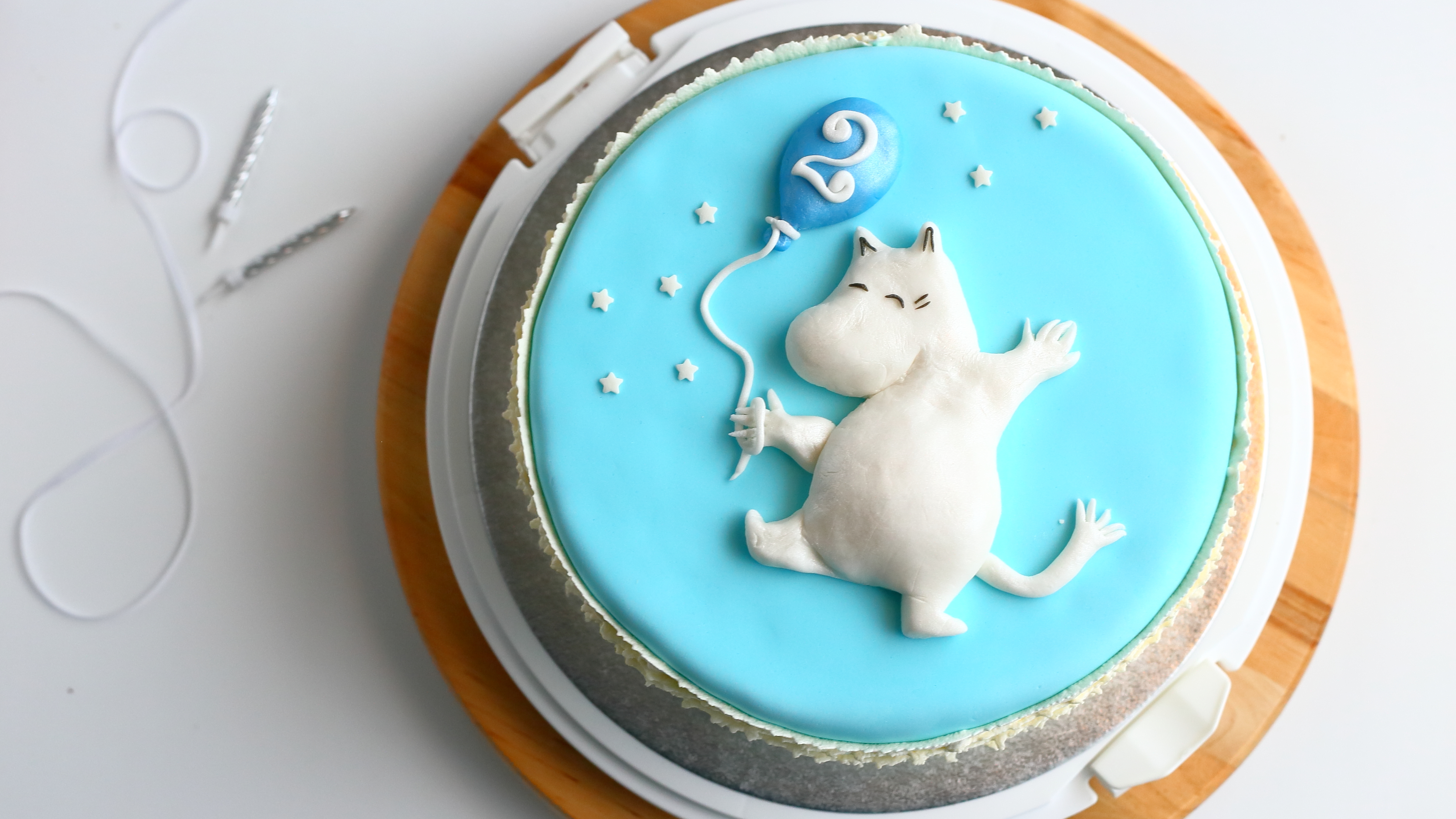 Tee koristeet eli muumi, ilmapallot ja tähdet kaulintamassasta ja nosta kakun pinnalle.