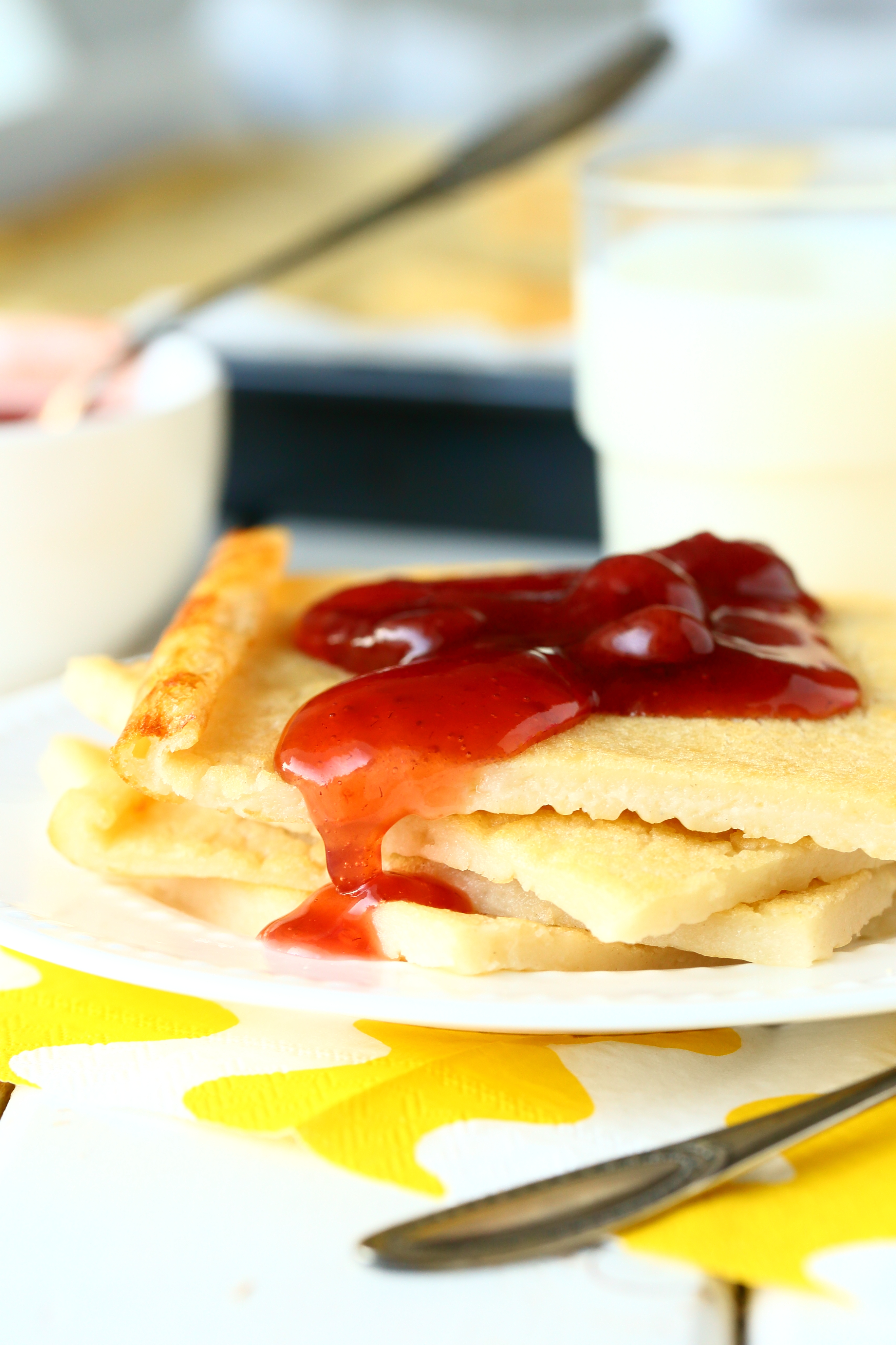 Enpä olisi ikinä uskonut, että munaton pannukakku voi olla näin hyvää ja että sen koostumus voi olla näin likellä tavallista pannaria! Tämä ohje on lillunut luonnosten joukossa jo vaikka kuinka pitkään. Ohje on muokkaantunut matkan varrella useamman testikerran jälkeen juuri tällaiseksi, joten nyt on hyvä heti julkaista ohje. Alunperin kehittelin ohjeen mein muna-allergista poikaa ajatellen. Nykyään näyttää tosin siltä, että pojan allergia on hellittämässä (ja toivottavasti katoamassa kokonaan) ja vatsa kestää jo hieman munaa sisältäviä leivonnaisia. Tästä huolimatta en ole vielä uskaltanut tarjota tavallista pannukakku ja olemmekin tehneet kaikki pannukakut tämän ohjeen kanssa.