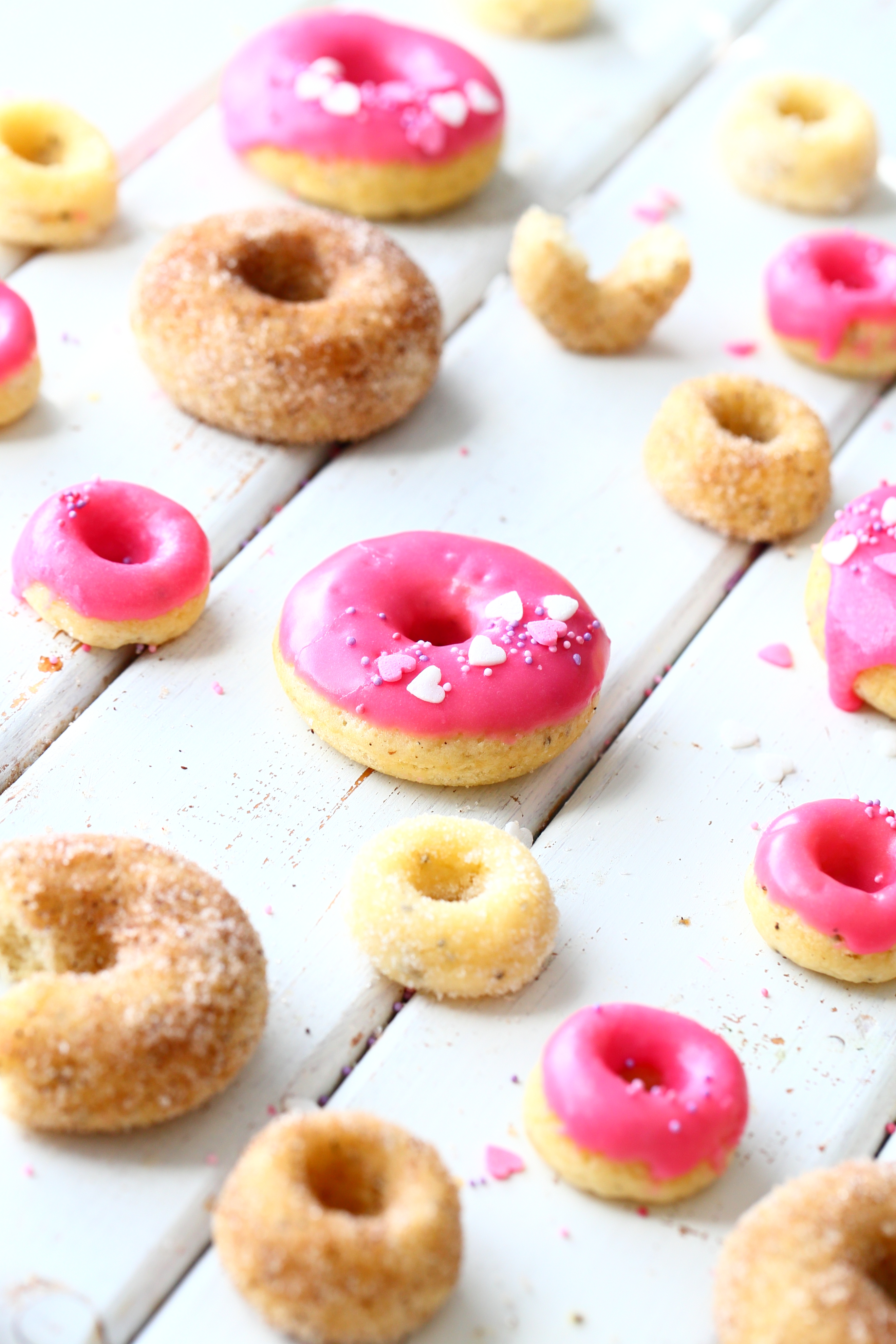 Paista 200 asteessa koosta riippuen noin 7 minuuttia, kunnes donitsit tuntuvat kevyesti koitettuna kiinteiltä. Varo kuitenkin paistamasta liikaa, etteivät ne kuivu suotta. Donitsit jäävät uunissa paistettaessa vaaleiksi, mutta niihin saa väriä ja makua esim. kaneli-sokerikuorrutteella tai tomusokerikuorrutteella.