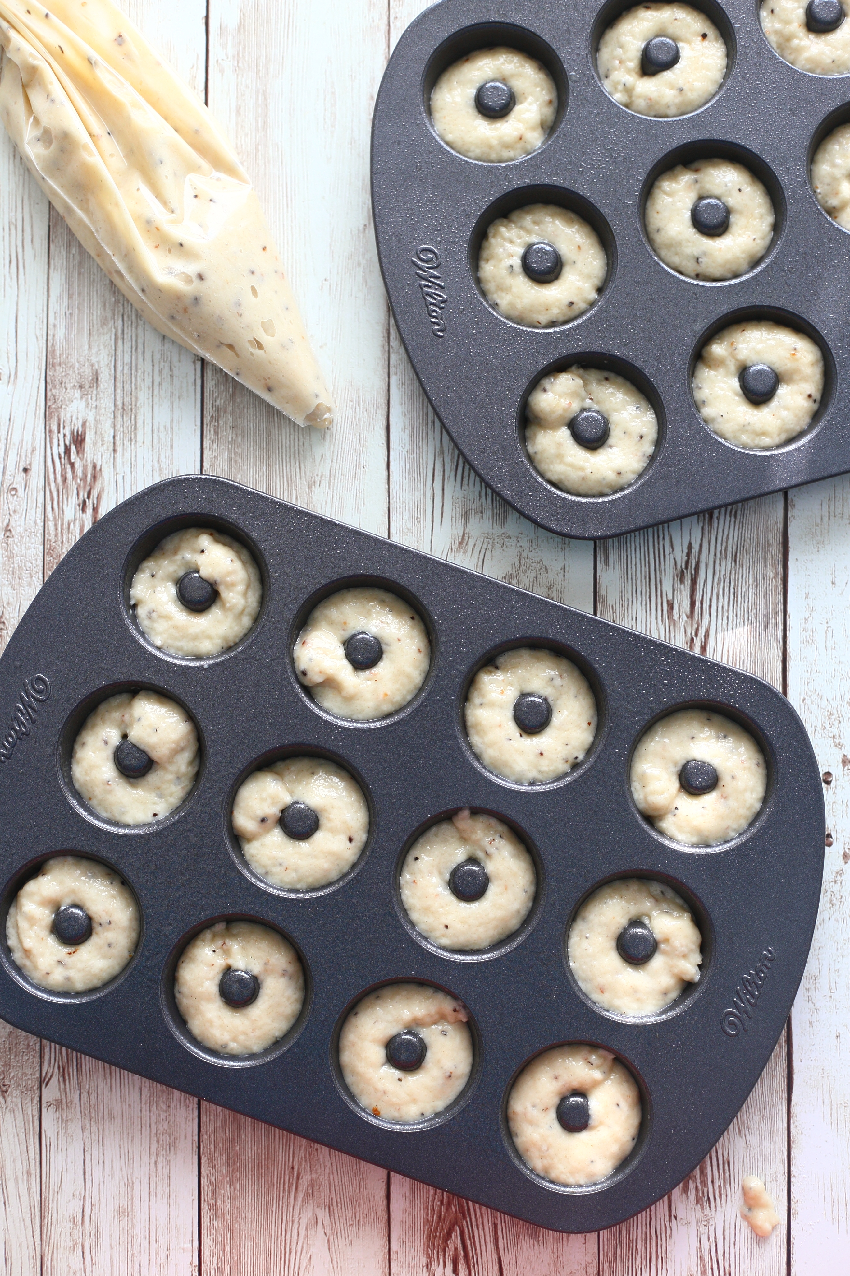 Sekoita kuivat aineet keskenään sekaisin. Lisää joukkoon öljy, vesi ja etikka. Sekoita aineet keskenään sekaisin nopeasti. Sekoita vain sen verran, että kaikki ovat juuri ja juuri sekoittuneet, älä siis vaivaa taikinaa. Lusikoi taikina pursotuspussiin (tai paksuhkoon pakastepussiin). Leikkaa pussin kulmaan reikä. Pursota taikinaa kevyesti voidellun donitsipellin koloihin noin puoleen väliin saakka.