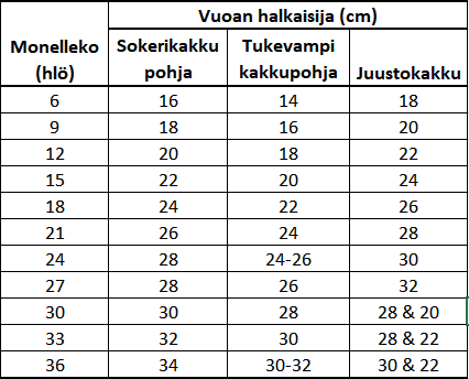 Vuoan koko saattaa erota ilmoitetusta koosta, joten mittaa pyöreän vuoan halkaisija vuoan sisäpuolelta senttimetreinä (cm). Tämä sisämitta on se, jota käytetään alla olevissa taulukoissa.