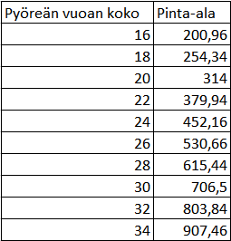 Pyöreiden vuokien pinta-alat: