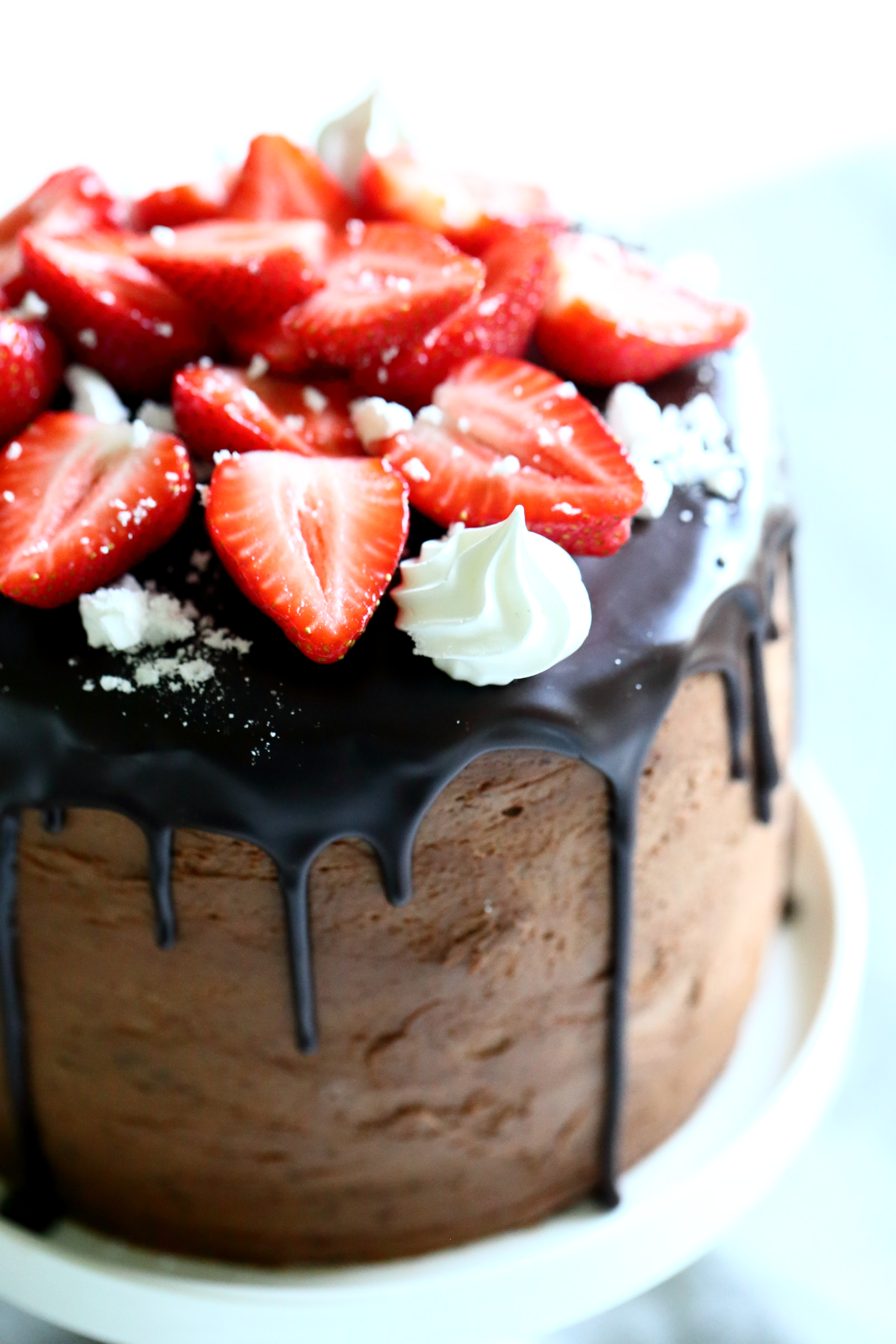 Tee vielä suklaaganache. Pilko tumma suklaa mikron kestävään kulhoon ja mittaa joukkoon myös vispikerma. Lämmitä mikrossa, kunnes kaikki suklaa on sulanut. Sekoita joukkoon vielä glukoosisiirappi. Jäähdytä suklaaseosta, kunnes se hieman paksenee, mutta pysyy edelleen sen verran juoksevana, että se levittyy kauniisti. Kaada suklaaganache kakun päälle, levitä sitä varovasti tasaiseksi ja anna samalla valua ohuina noroina reunoilta alas. Laita kakku jääkaappiin hyytymään.