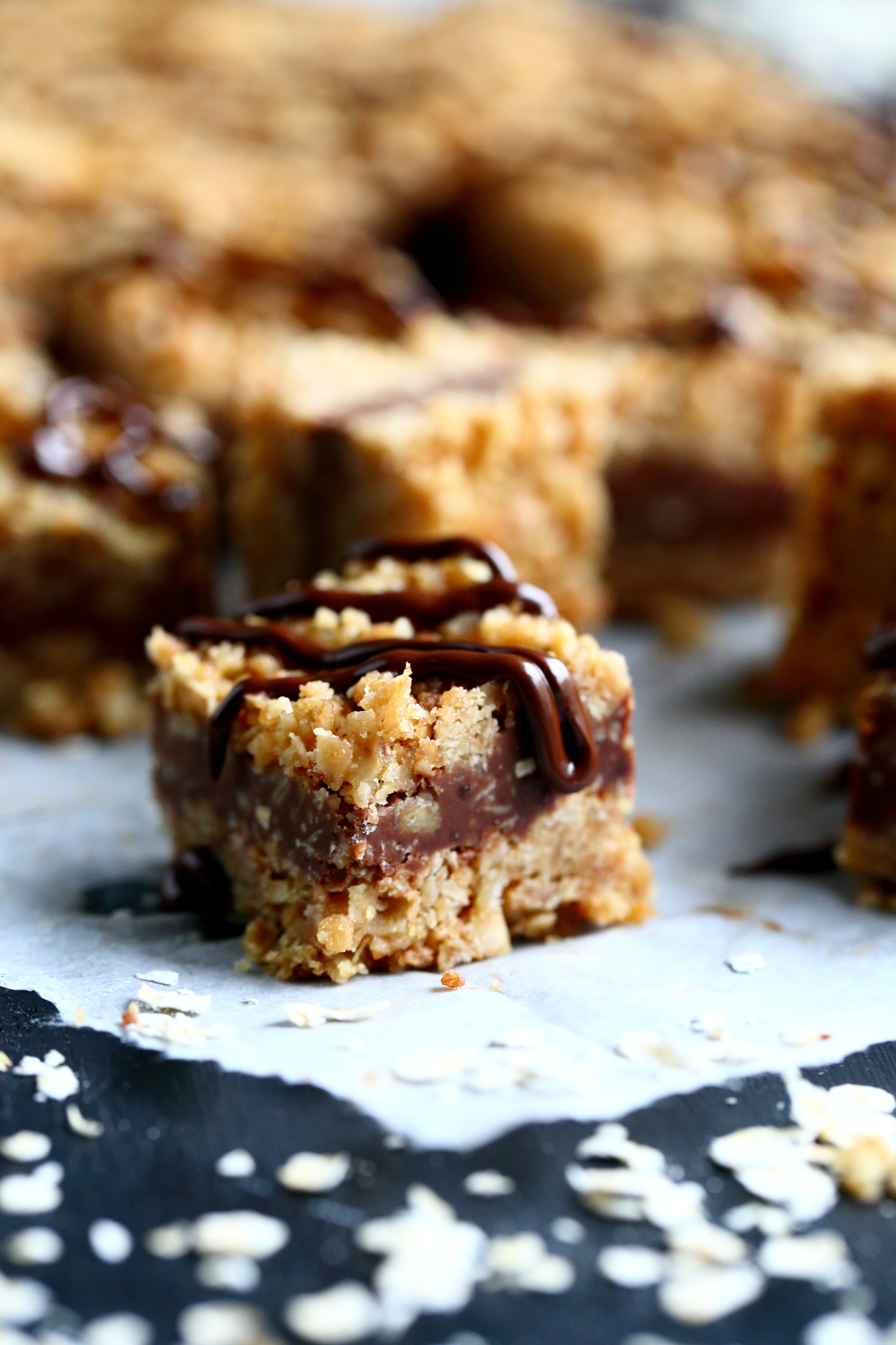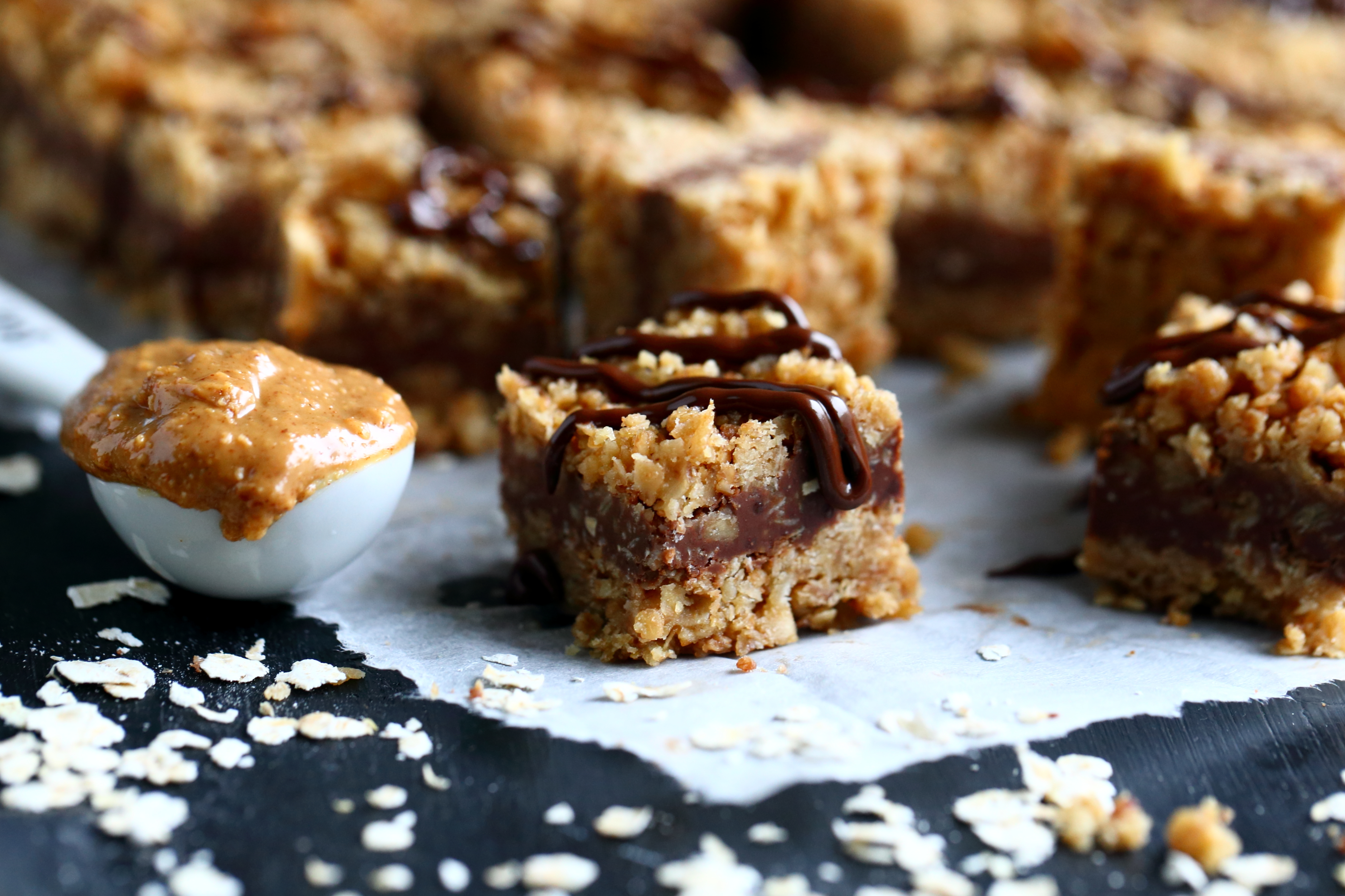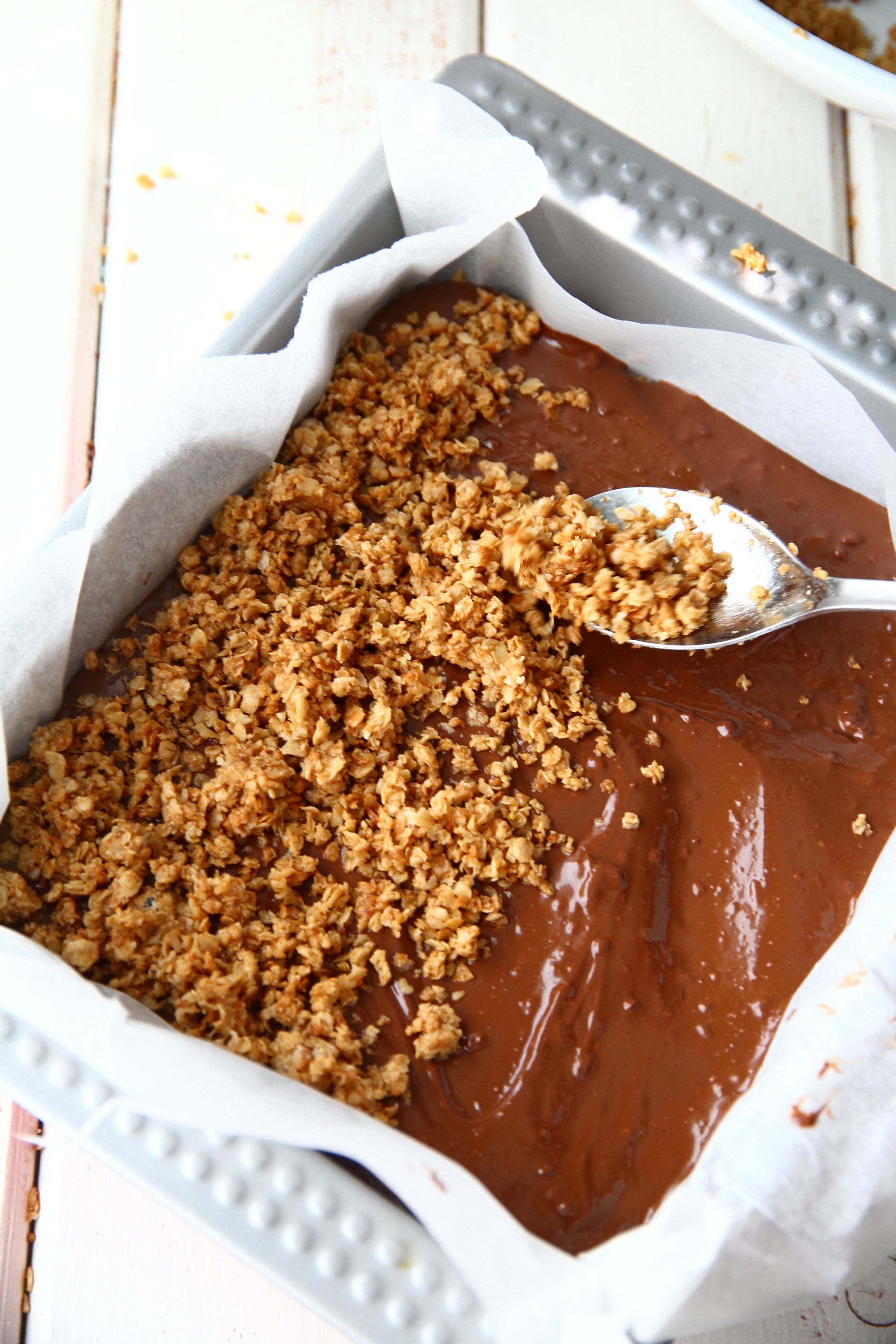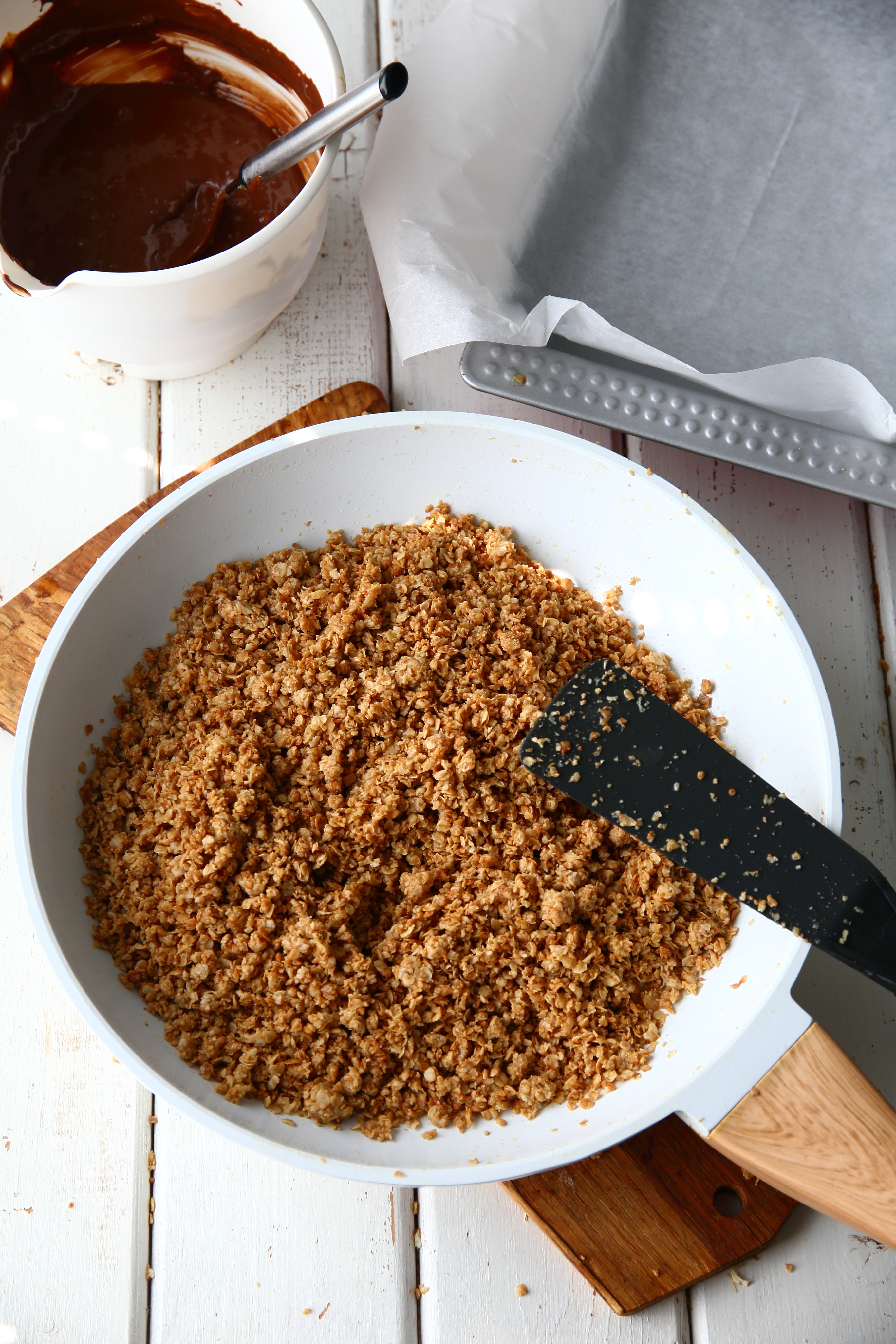 Levitä puolet kauramurusta leivinpaperoituun n. 20 cm x 20 cm vuokaan ja paina tiiviisti pohjalle. Kaada päälle suklaa-maapähkinävoiseos ja levitä tasaiseksi.