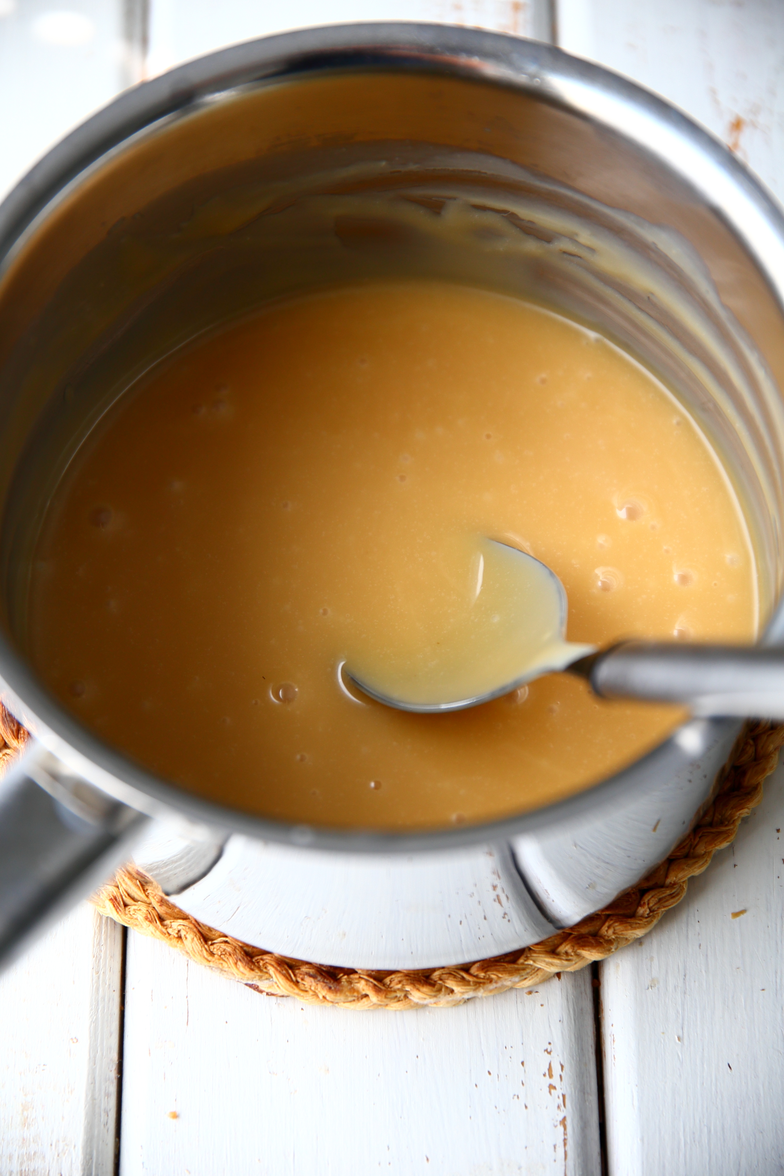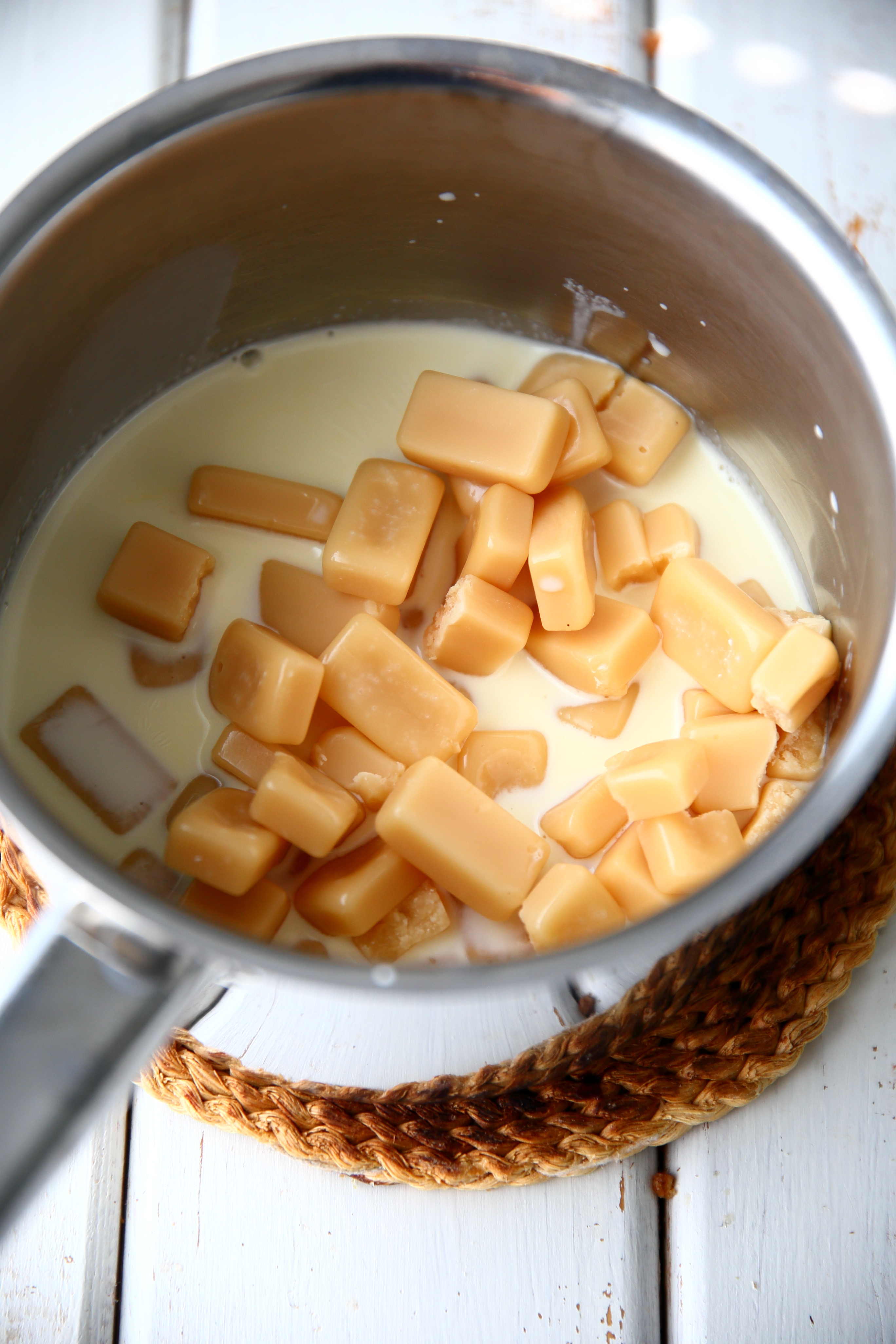 Jos karkit eivät ala sulamaan tai sulavat erittäin hitaasti, nosta kattila levylle ja lämmitä miedolla lämmöllä koko ajan sekoitellen, kunnes kaikki karkit ovat sulaneet. Laita kattila kylmää vettä sisältävään altaaseen, niin kastike jäähtyy nopeammin.