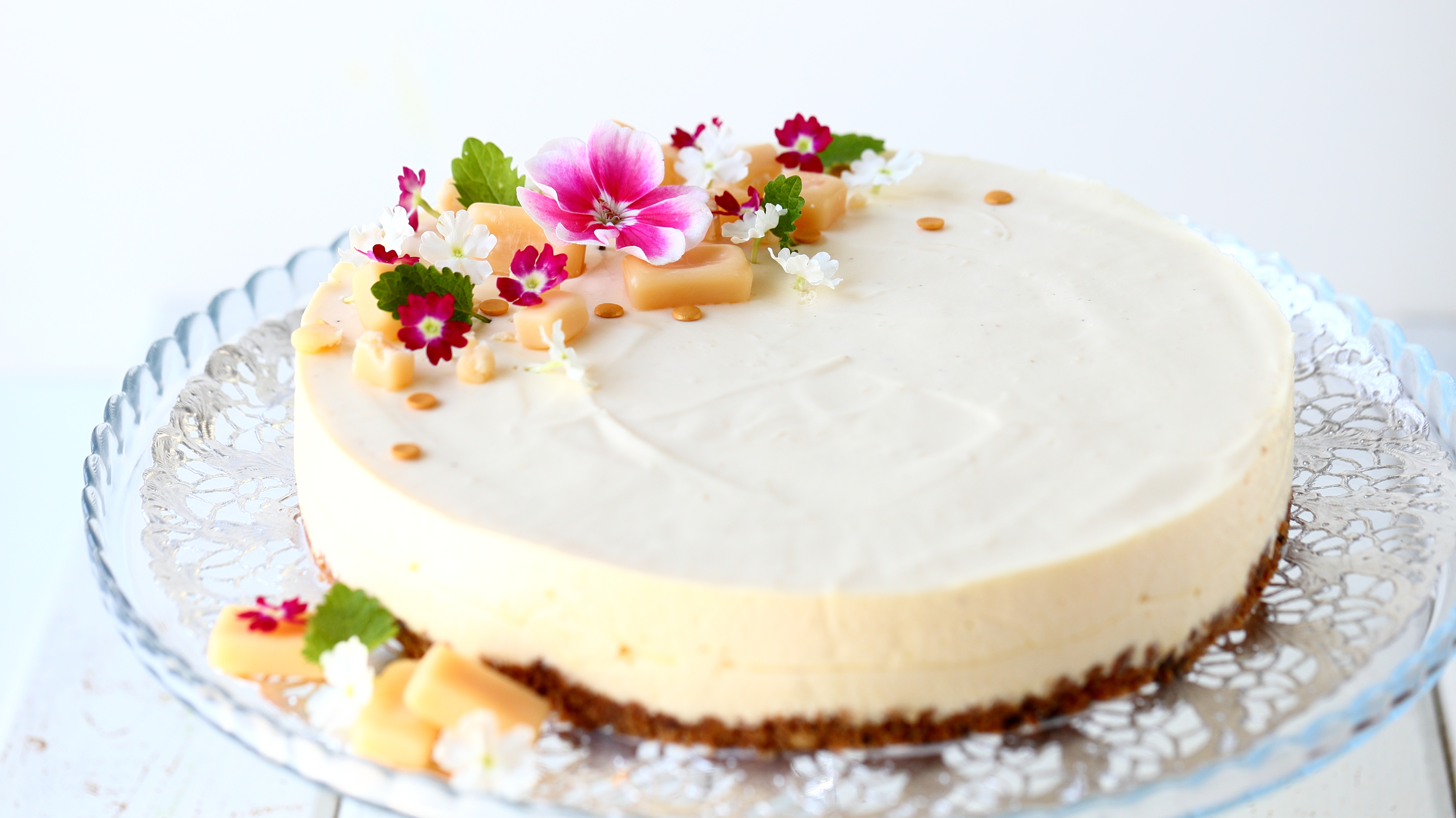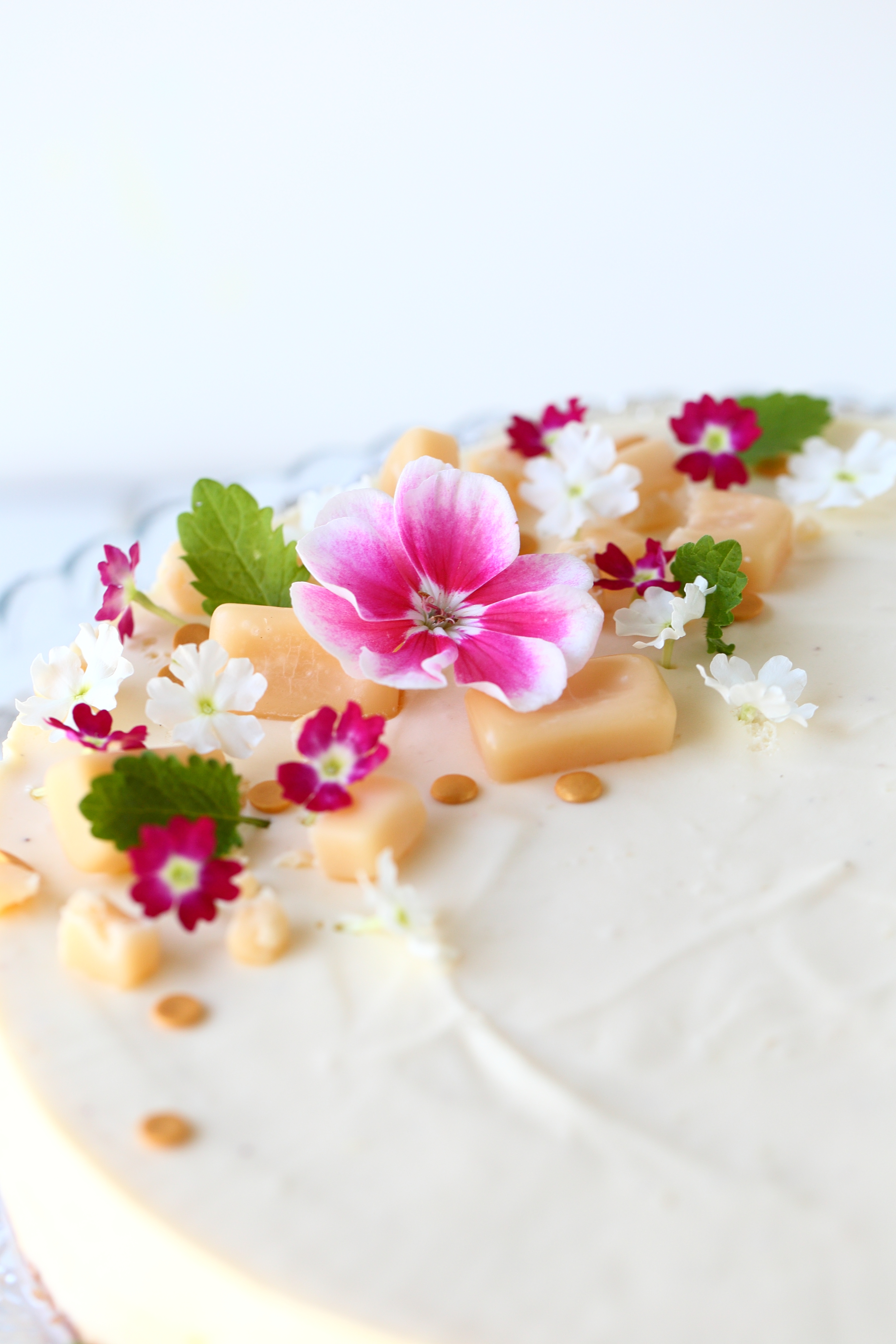 Syötavia kukkia kakun päällä, rautayrtti pelargonia