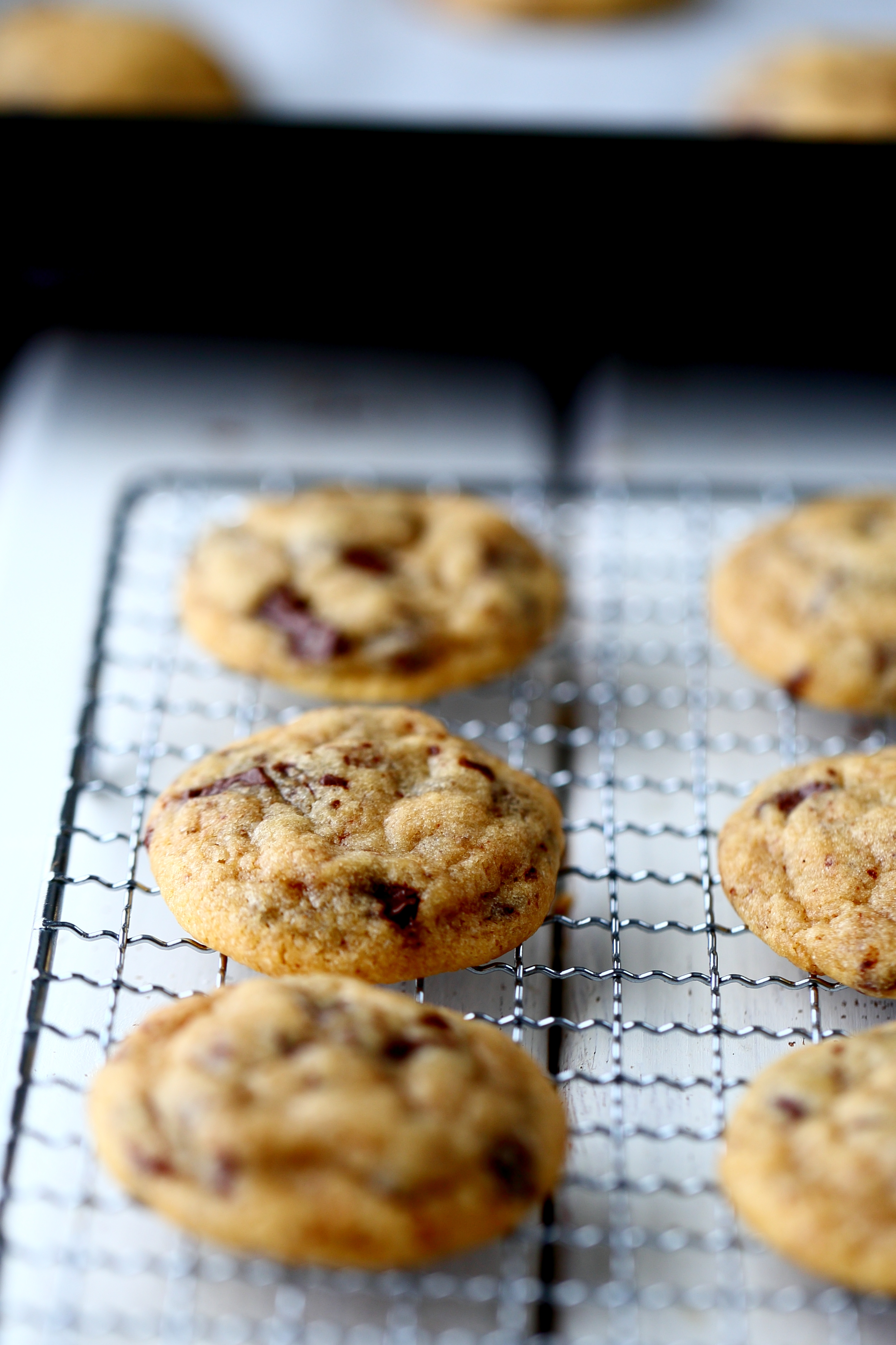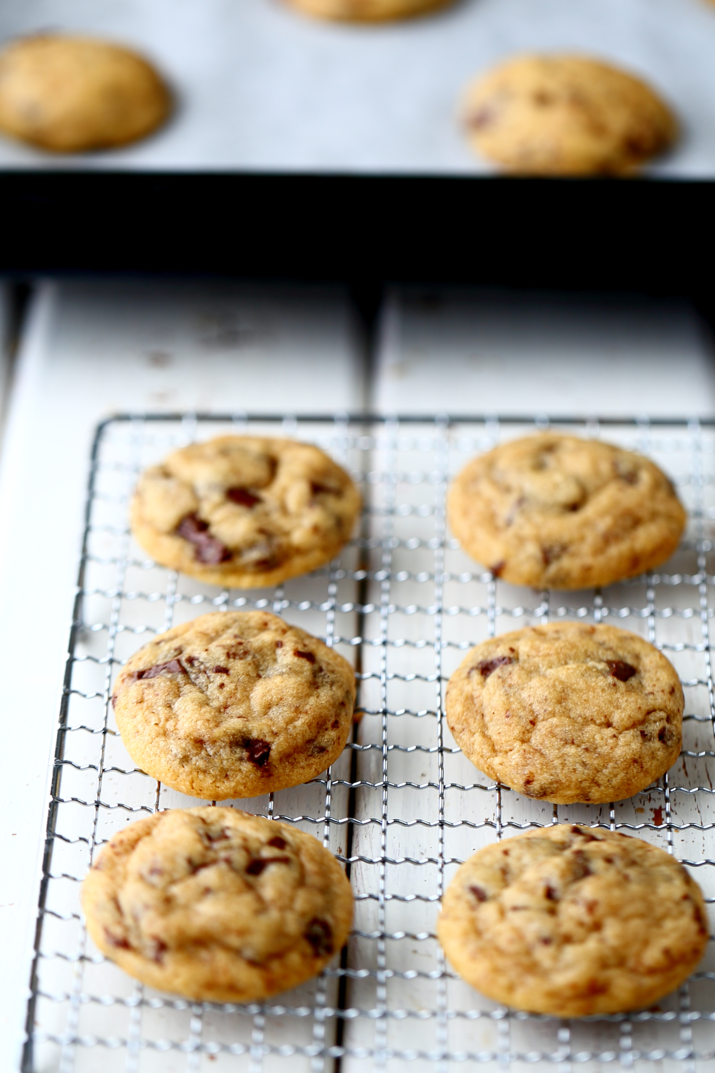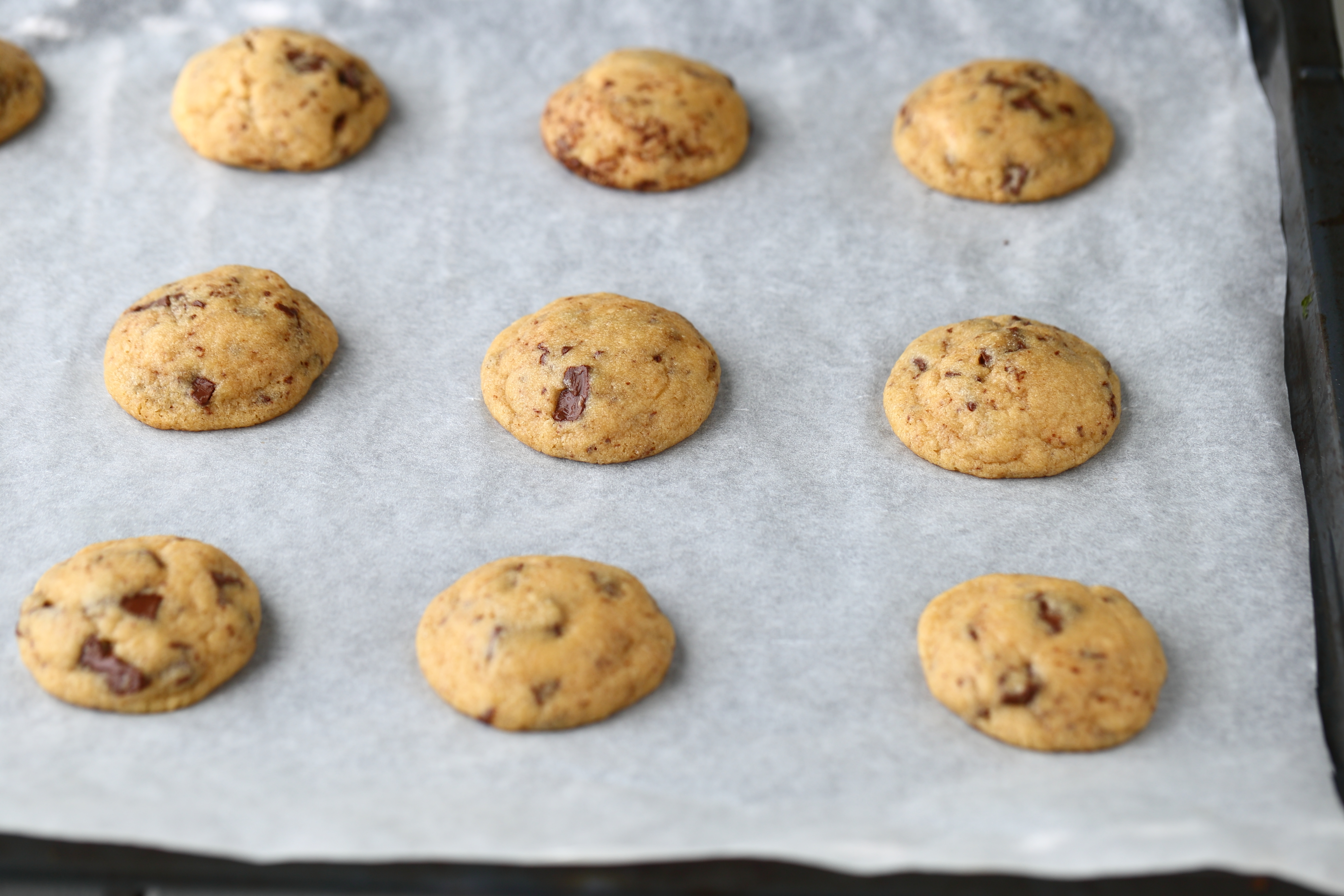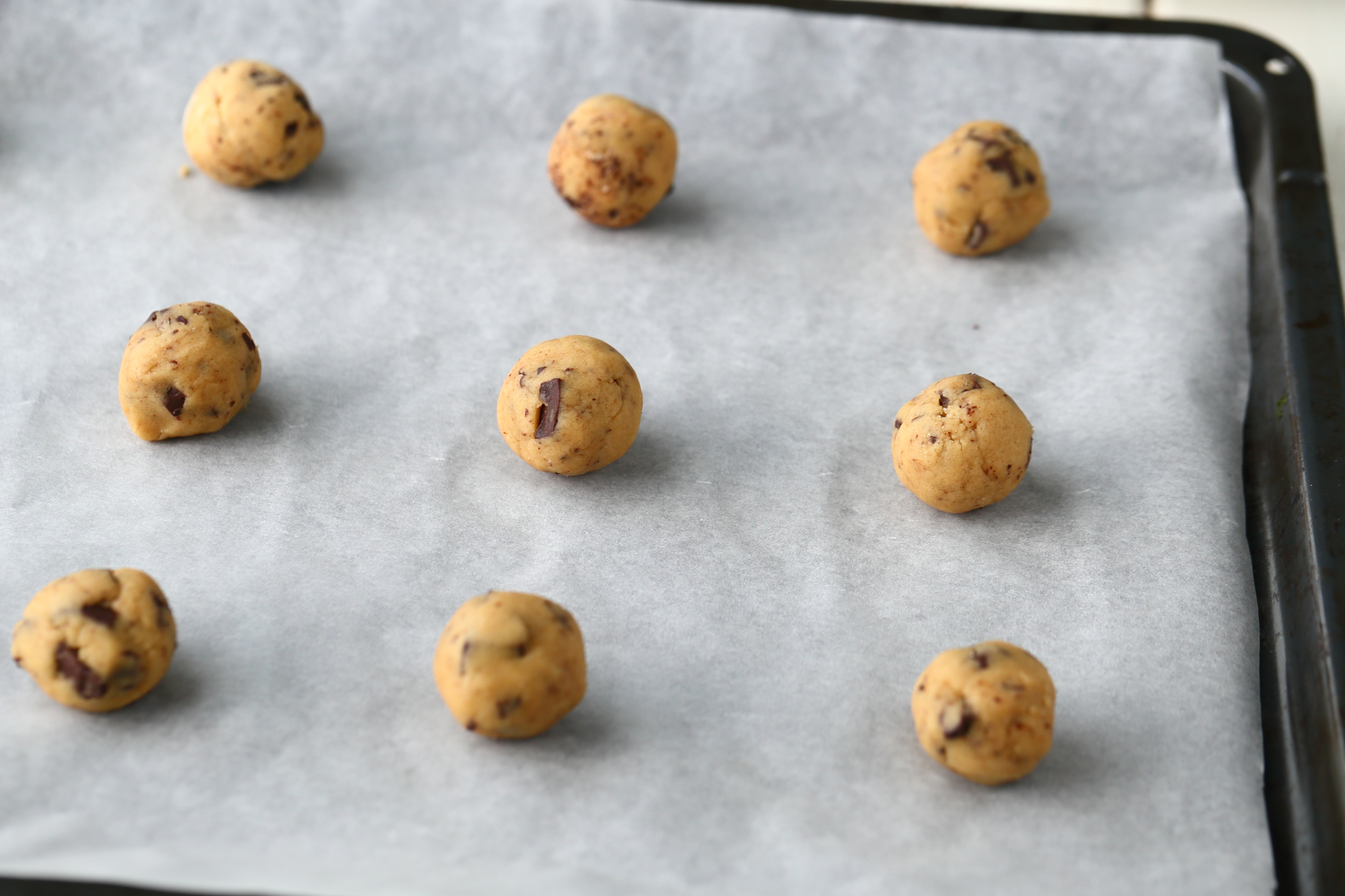 Laita tällä välin uuni lämpeämään 175 asteeseen ja valmistele kaksi uunipeltiä laittamalla niiden päälle leivinpaperit. Jaa kylmä taikina kahteen osaan. Laita toinen puoli taikinaa takaisin jääkaappiin. Pyörittele toisesta taikinasta noin 10 palloa ja laita pallot leivinpaperin päälle uunipellille niin, että niiden väliin jää tilaa levitä.