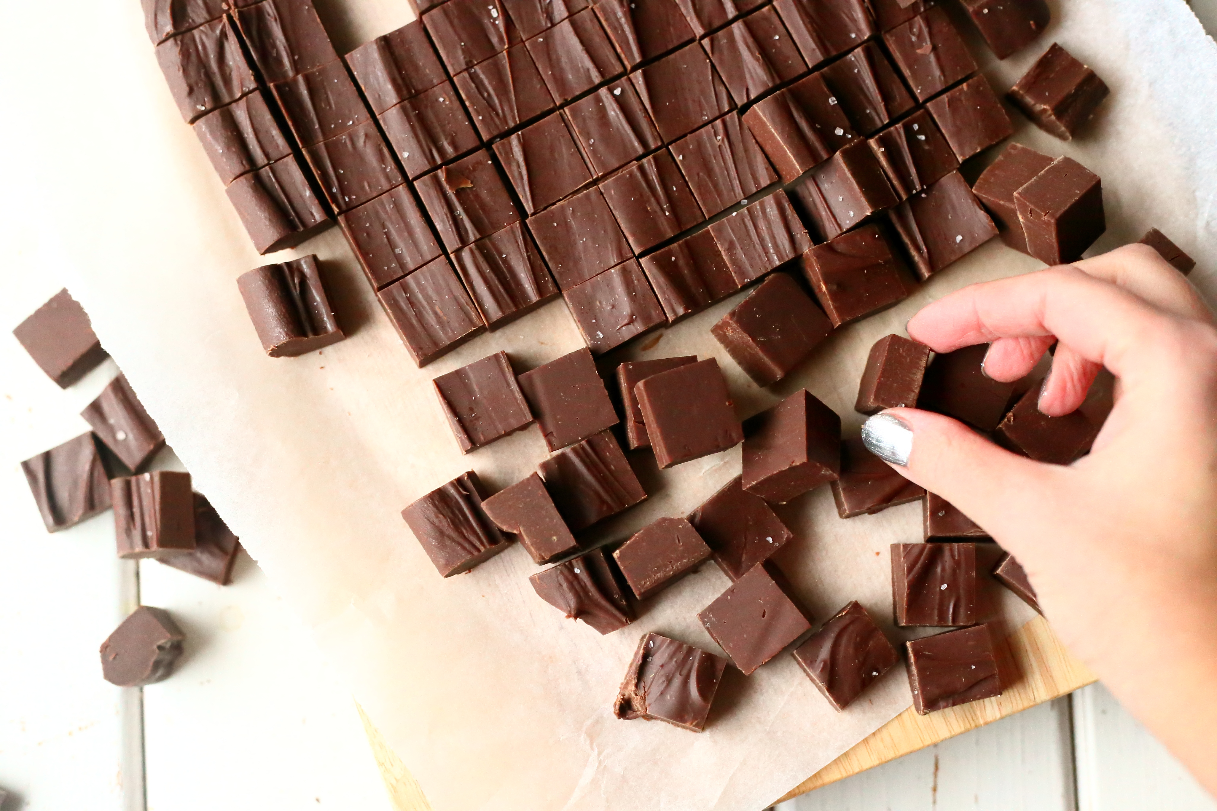 Levitä suklaaseos noin 20 cm x 25 cm alalle. Mitä pienemmälle alalle levität sen, sitä paksumpia fudgeista tulee. Ja päinvastoin, mitä laajemmalle alalle suklaaseos levittyy, sitä ohuempia fudgeista tulee. Jätä fudge ensin huoneenlämpöön jäähtymään ja nosta jäähdyttyään jääkaappiin jähmettymään. Leikkaa jähmettynyt suklaafudgelevy paloiksi ja eikun nautiskelemaan.