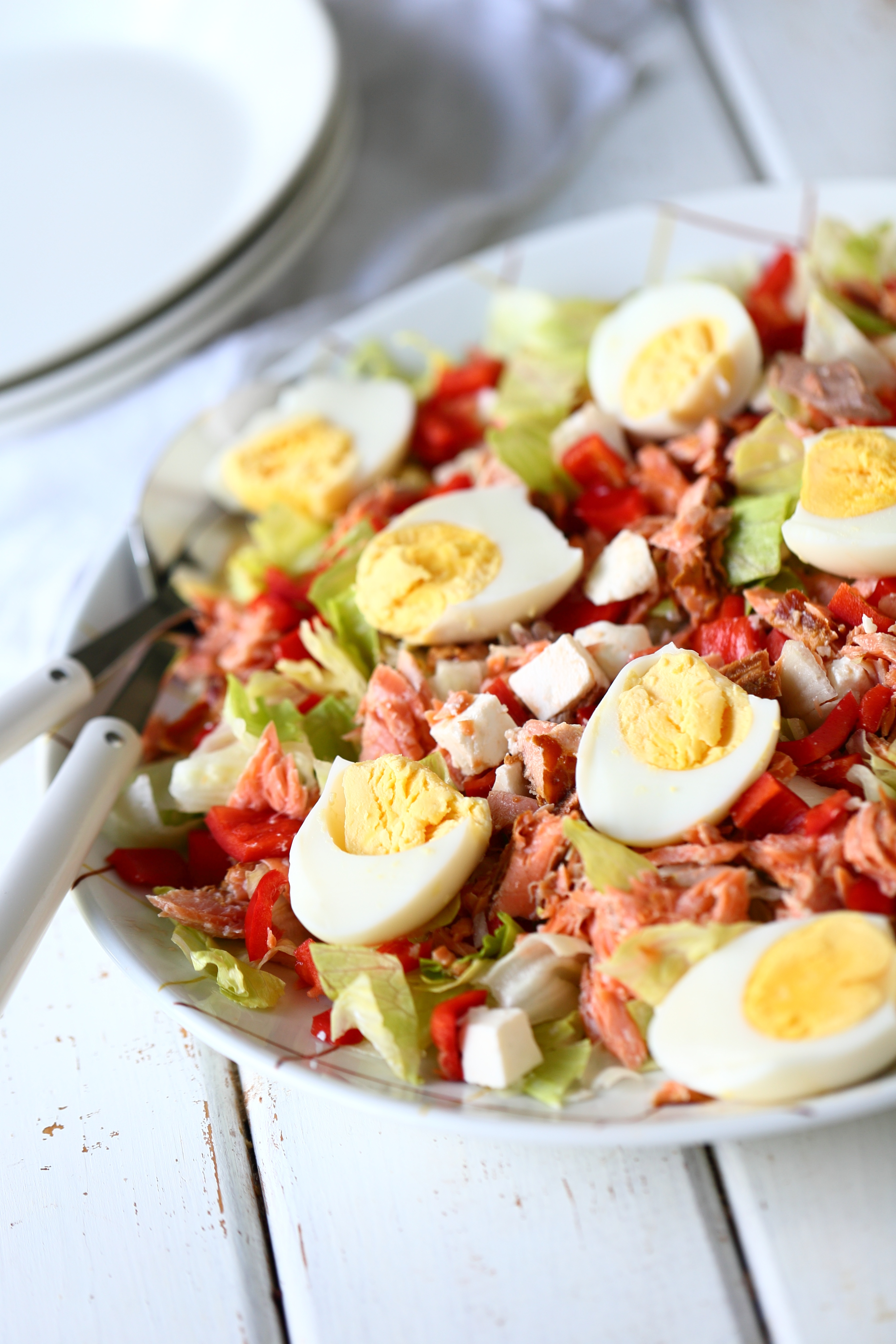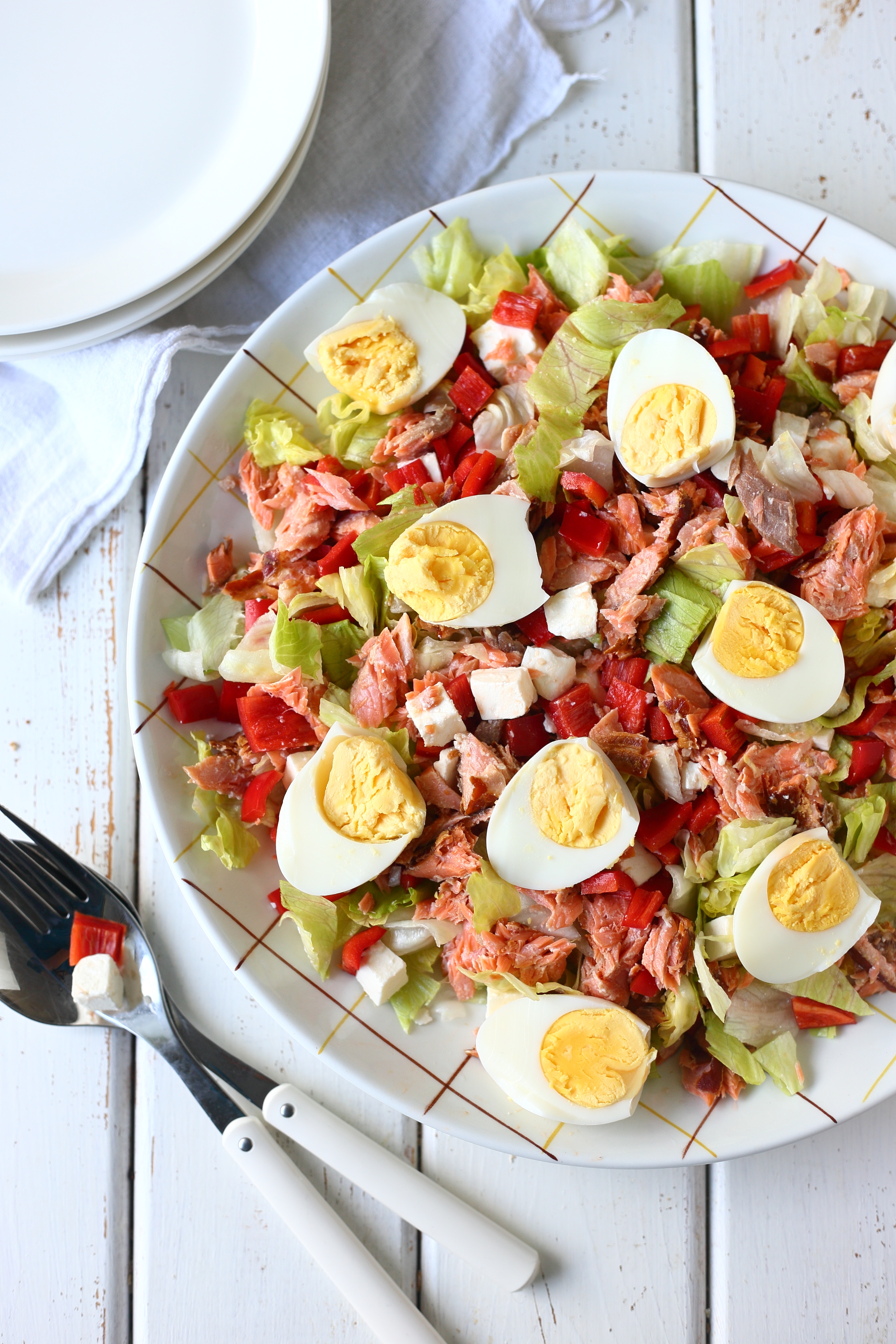 Salaatti syntyi vähän kuin vahingossa, kun ruoka-aika kolkutteli ovelle ja poika huuteli jo nälkäänsä. Katsoin jääkaappiin ja huomasin siellä muusta ruoanlaitosta ylijääneen lämminsavulohen ja fetajuuston ja niistä se ajatus sitten lähti. Salaatti olisi ollut aivan mainio jo noilla proteiininlähteillä, mutta lisäsin joukkoon vielä muutaman kananmunan puolikkaan tuomaan lisää ruokaisuutta. Jos on kiire, niin salaatin tekee nopeammin ilman munaa, mutta jos niiden keittämiseen on aikaa, niin itse ainakin tykkään laittaa myös niitä joukkoon.