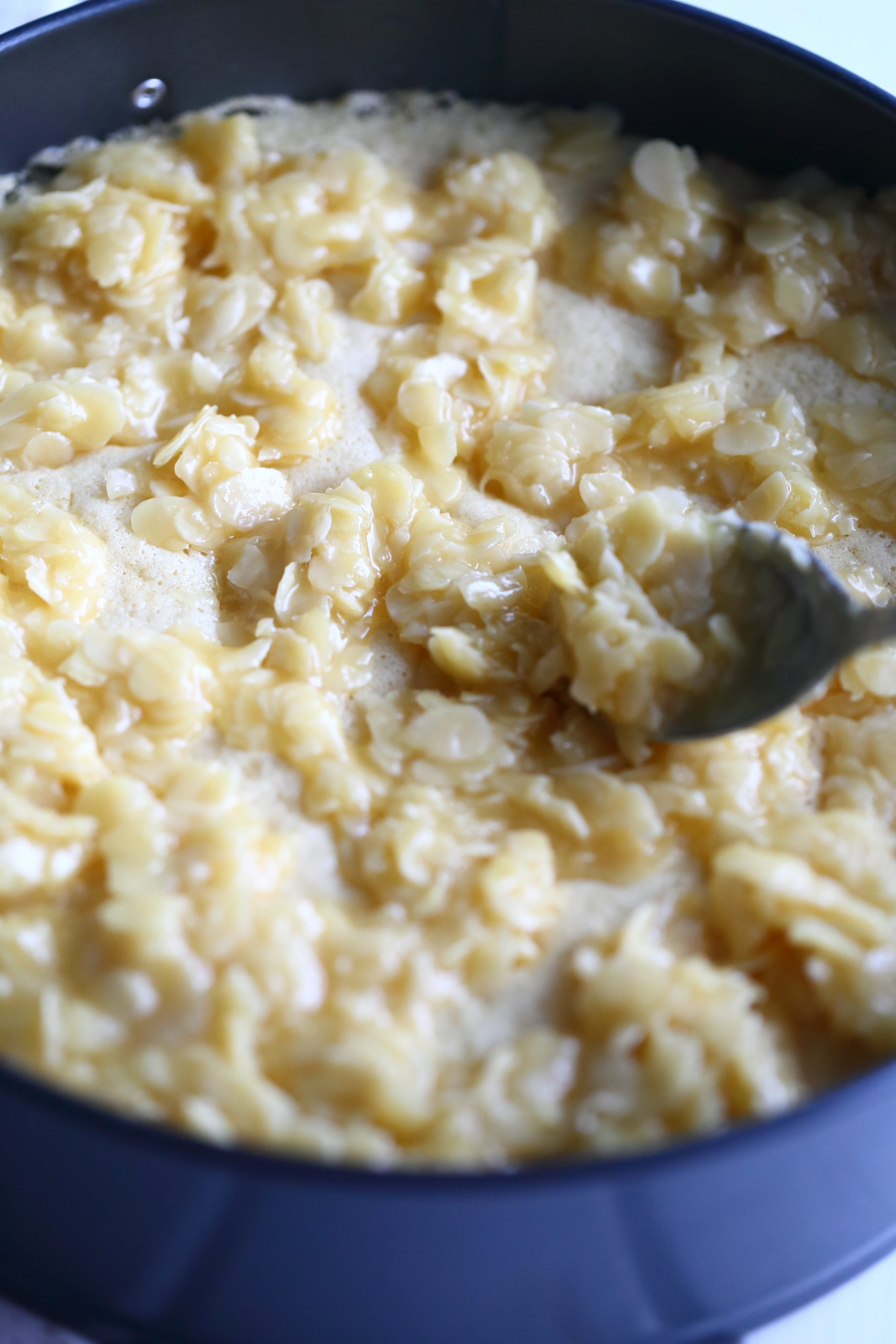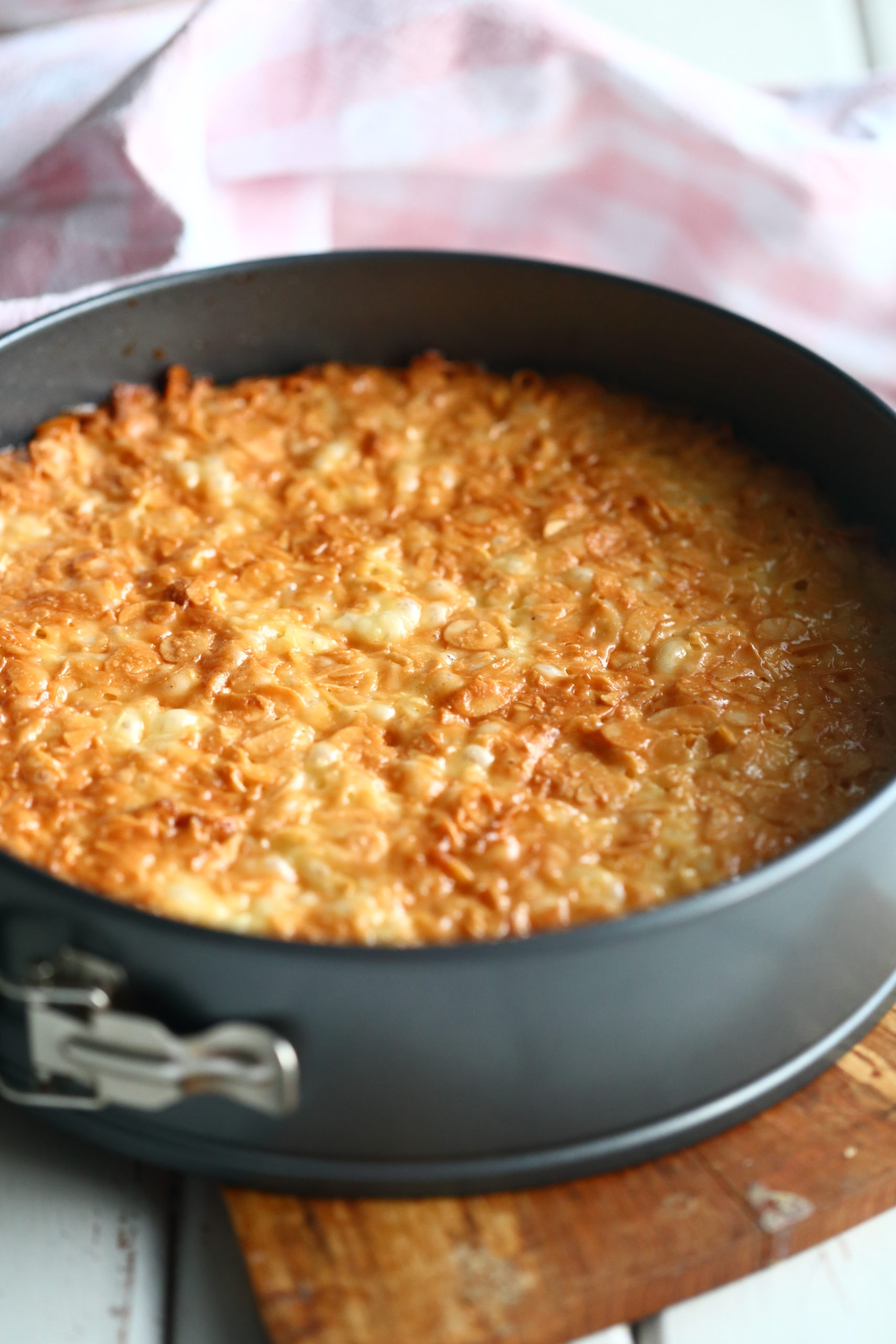 Tämä on siis hieman erilainen, kuin Siken alkuperäisohjeen kakku. Tämä johtuu siitä, että huomasin jo ennen leipomista, että taikinaan käytettävä vuoka oli melko pieni, jolloin kypsymisen kanssa saa olla tarkkana. Pienessä vuoassa paistettuna pohja kypsyy epätasaisemmin eli on jo melko kypsä reunoilta, mutta jää helposti keskeltä liiankin raa’aksi ennen toscan lisäämistä. Tämä johtaa siihen, että kuorrute painuu kakun sisään helposti liikaa juuri keskeltä. Tämän takia paistoin kakun isommassa vuoassa ja tiputin pohjataikinassa olevan maidon määrää hieman.