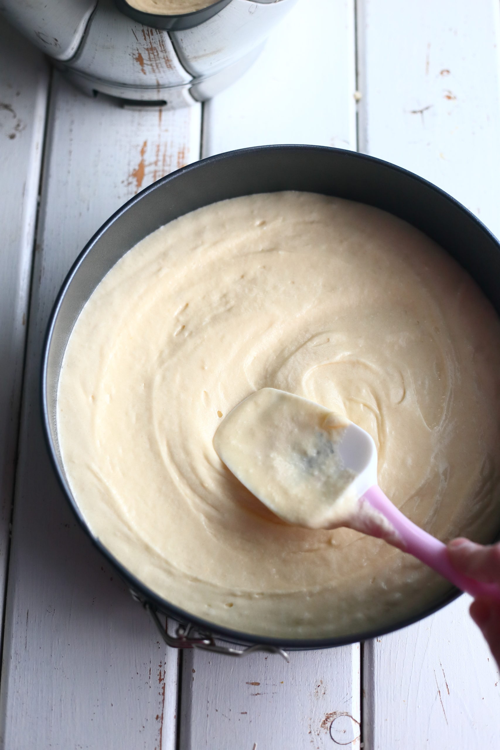 Vaahdota munat ja sokeri paksuksi vaaleaksi vaahdoksi. Sekoita sulatetun voin joukkoon ripaus suolaa ja sekoita voi muna-sokerivaahtoon. Sekoita leivinjauhe vehnäjauhoihin ja lisää seos muna-sokerivaahtoon kevyesti käännellen. Lisää lopuksi maito nopeasti sekoittaen. Kaada taikina voideltuun irtopohjavuokaan ja tasoita.