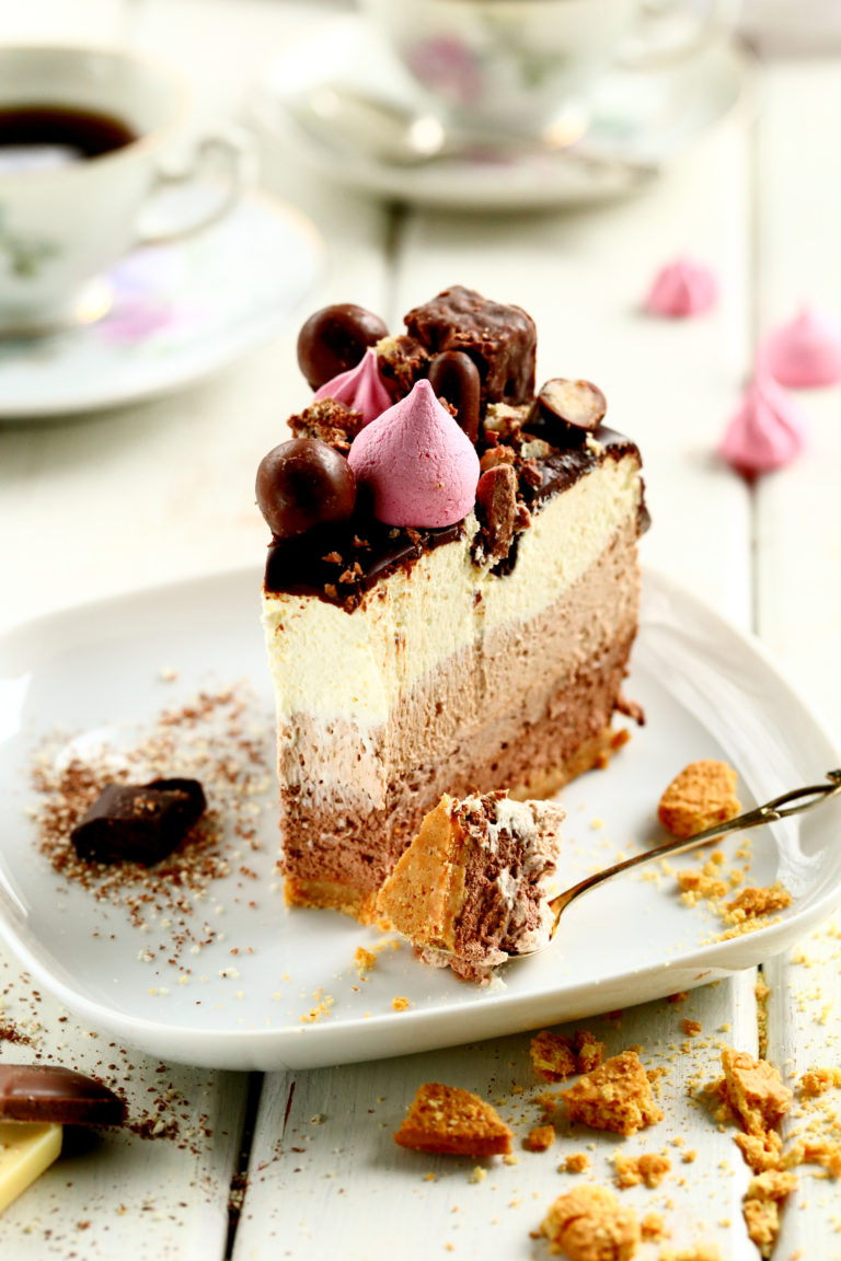 Kolmen suklaan juustokakkussa maistuu nimensä veroisesti kolme suklaata. Makea valkosuklaa tasapainottuu hieman karvaamman tumman suklaan ansiosta. Ja päinvastoin, tumma suklaamousse ei ole liian tuju miedompien suklaiden rinnalla. Tämä on liivatteettomista kakuista vaativin, mutta siltikin helppo.