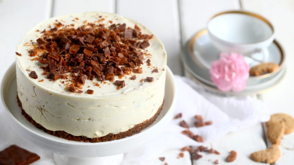 Daim-juustokakku maistuu i-ha-nal-ta! Se on juuri sopivan makea tarjottava. Tämä tuhoutuminen onnistuu miltei yhtä nopeasti mitä valmistaminen. Ellei jopa nopeammin. Nam!