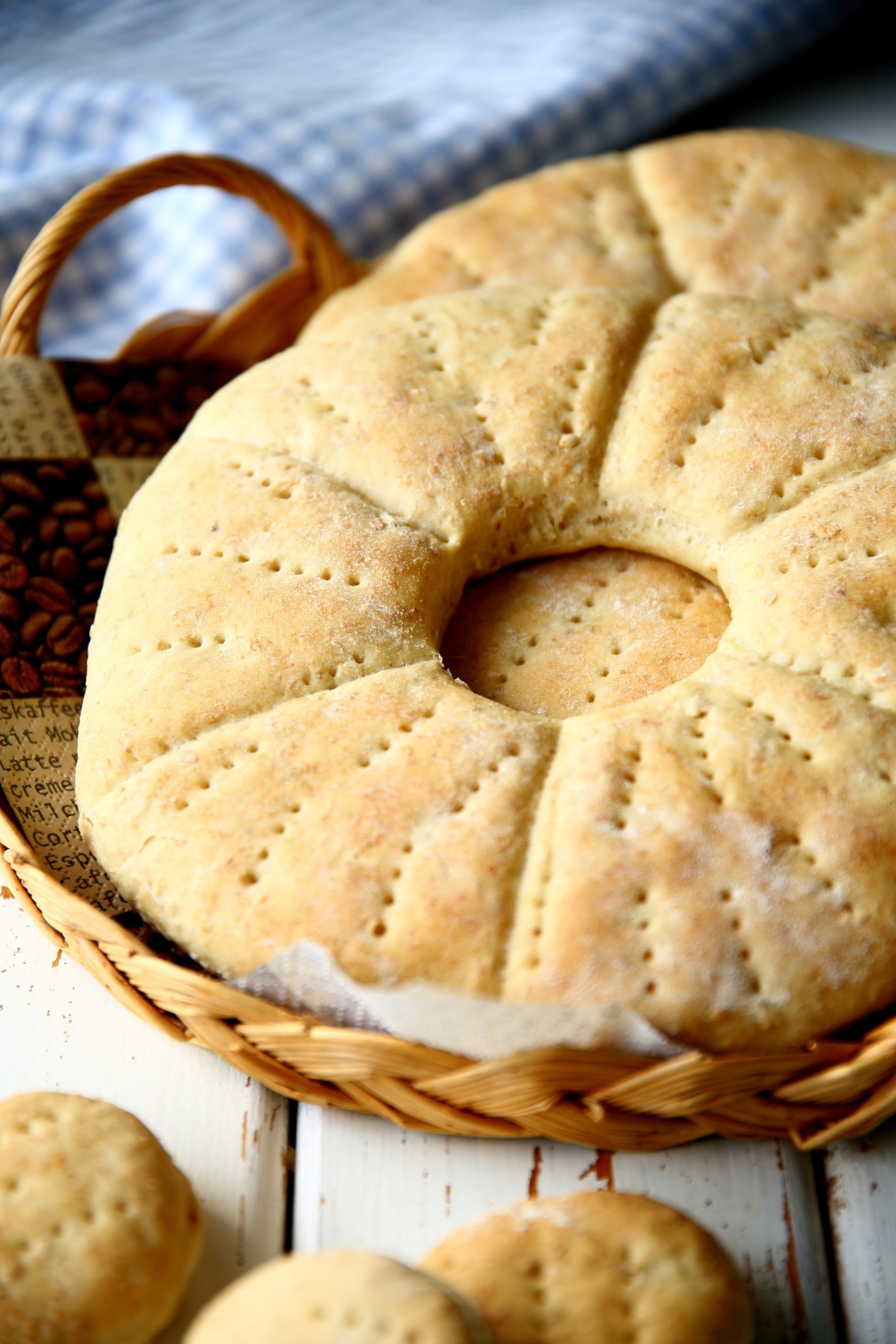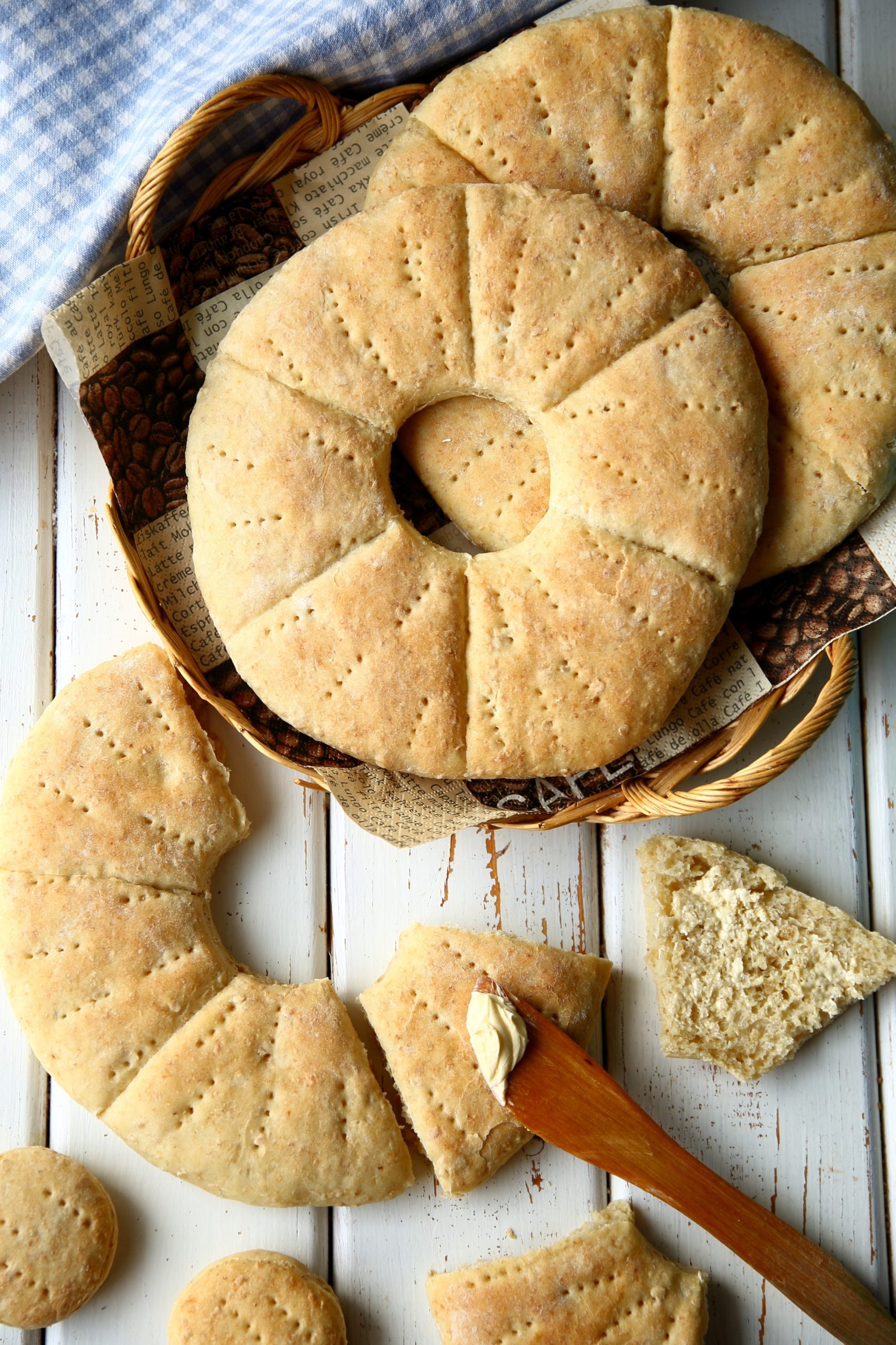 Jaa taikina kolmeen osaan. Pyörittele palat palloiksi ja taputtele pallot pyöreiksi, litteiksi leiviksi (halkaisija noin 20 cm). Siirrä ne uunipellillä olevaan leivinpaperin päälle. Paina kunkin leivän keskelle reikä juomalasilla tai muulla pyöreällä esineellä. Voit paistaa nämä ”reiät” samalla pellillä leipien kanssa. Pistele leivät vielä haarukalla ja paina leipään viiltoja, joita pitkin valmiit leivät voi taittaa paloiksi.
