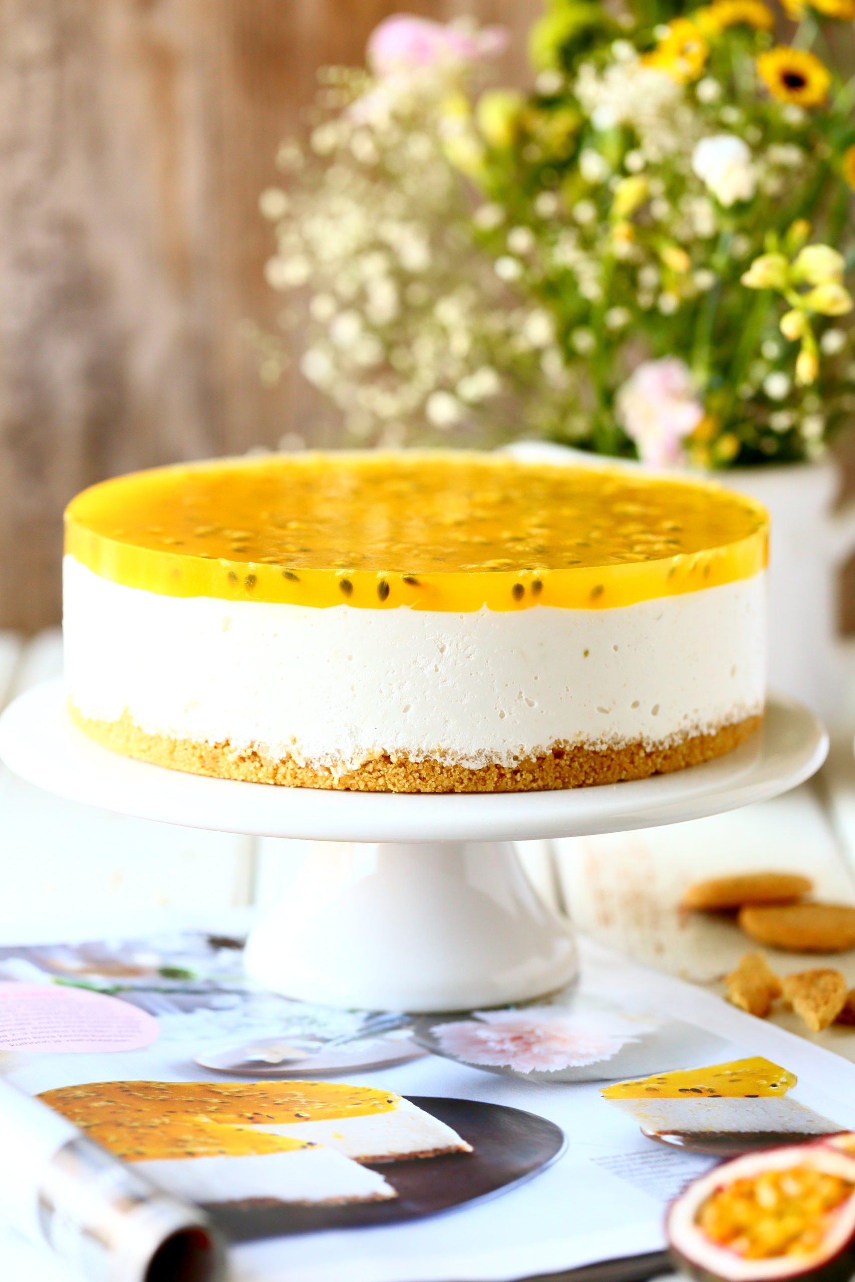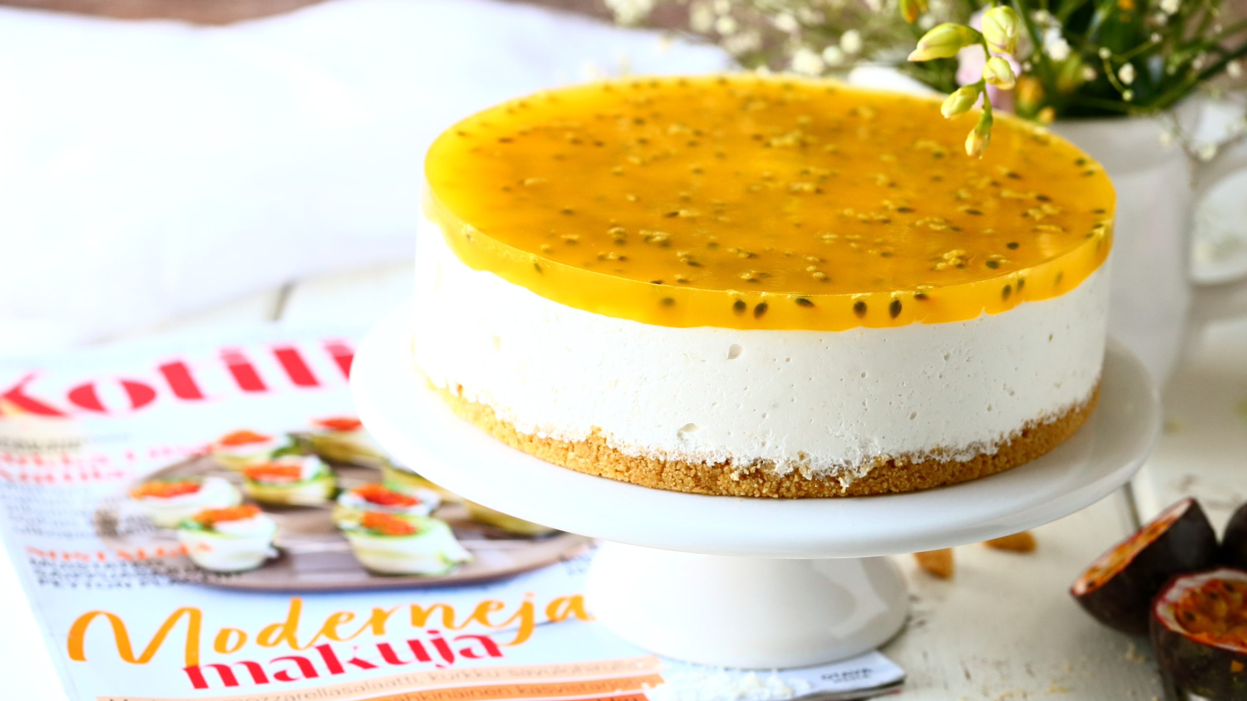 Tee vielä kiille. Laita liivatelehdet kylmään veteen likoamaan. Laita kattilaan appelsiininmehu, passionhedelmien sisus sekä sokeri. Kuumanna kiehuvaksi. Purista liivatteista vesi pois ja liuota liivatteet kattilaan. Jäähdytä kiille melkein huoneenlämpöiseksi. Kaada kiille kakun päälle varovasti lusikan kautta valuttaen. Nosta kylmään vielä muutamaksi tunniksi, kunnes kiille on jähmettynyt. Poista vuoan reunaosa ja nosta kakku tarjolle.