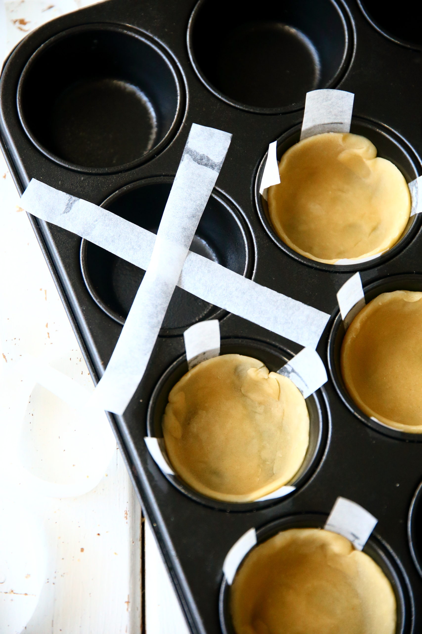 2.) Kun kiisseli on valmis ja pohjataikina on ollut jääkaapissa vähintään puoli tuntia, tee pohjat valmiiksi. Voitele leivosvuoat tai muffinssipellin kolot kevyesti. Jos käytät muffinssivuokia, varmista pohjien irtoaminen laittamalla leivinpaperista tehdyt pitkät suikaleet kolojen päälle. Näiden avulla valmiit pohjat on helpompi nostaa pois koloista.