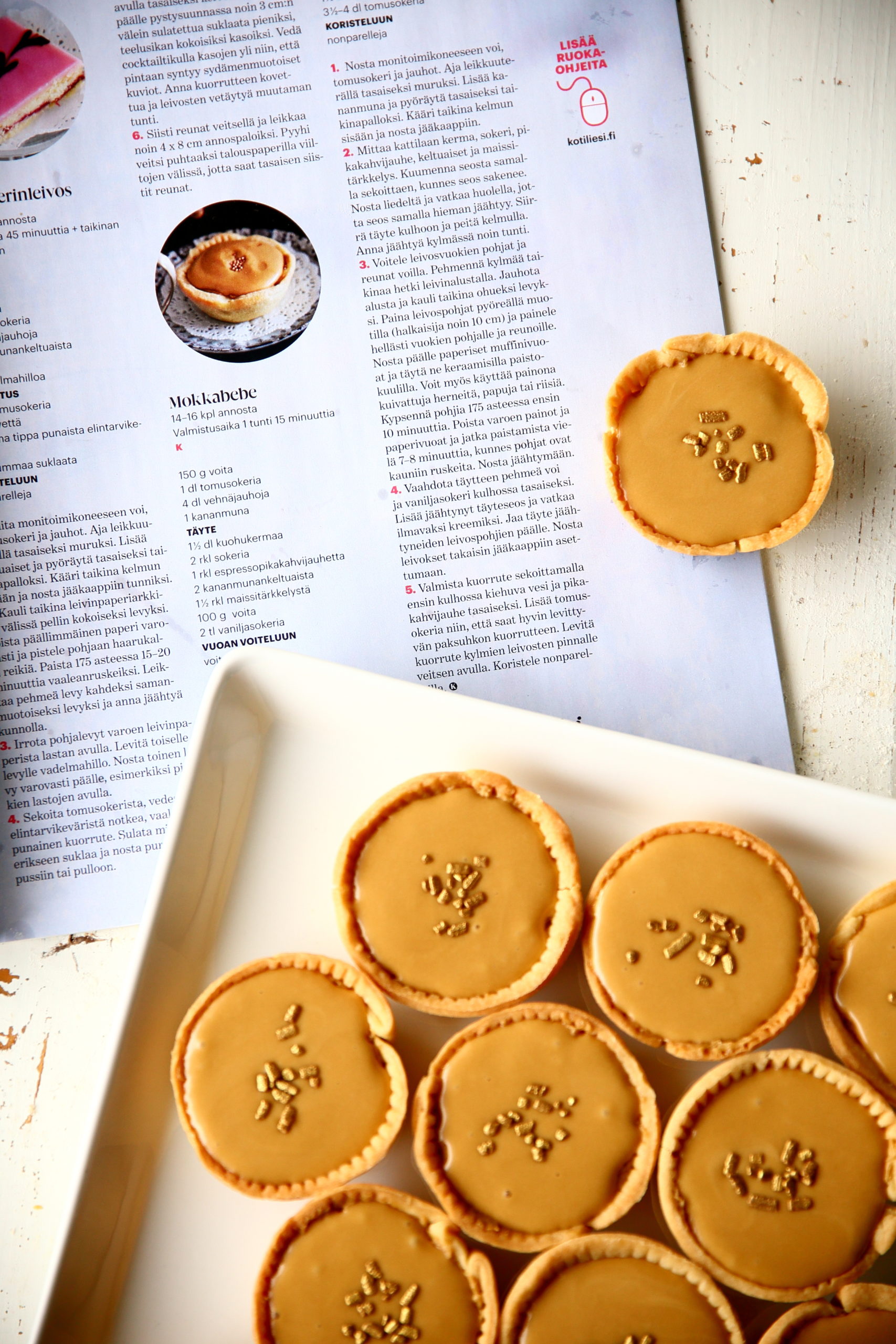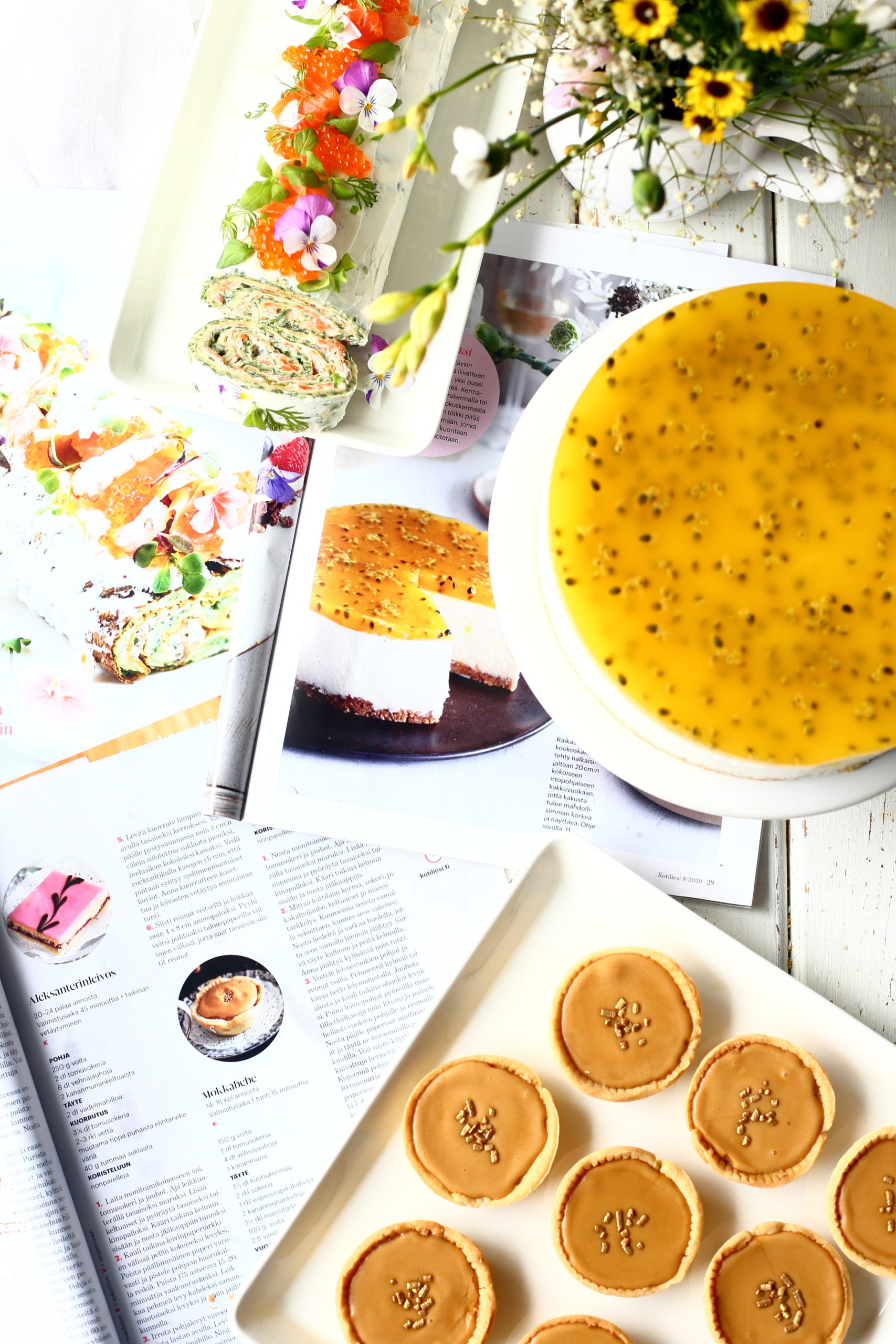 Kun suunnittelin leivonnaisia tuohon pieneen arkiseen juhlahetkeemme, plarasin läpi Kotiliesi-lehtiä. Niistä löytyy aina paljon erilaisia ohjeita, ja nuo ohjeet toimivat ideapankkina moneen hetkeen. Löysin lehdistä vaikka mitä ihanuuksia, mutta päädyin lopulta leipomaan lehden ohjeiden mukaan kolme herkullisen kuulloista, minulle täysin uutta ohjetta: Kookosjuustokakun appelsiini-passionkiilteellä, mokkabebejä ja suolaiseksi kylmäsavulohi-munakasrullan.