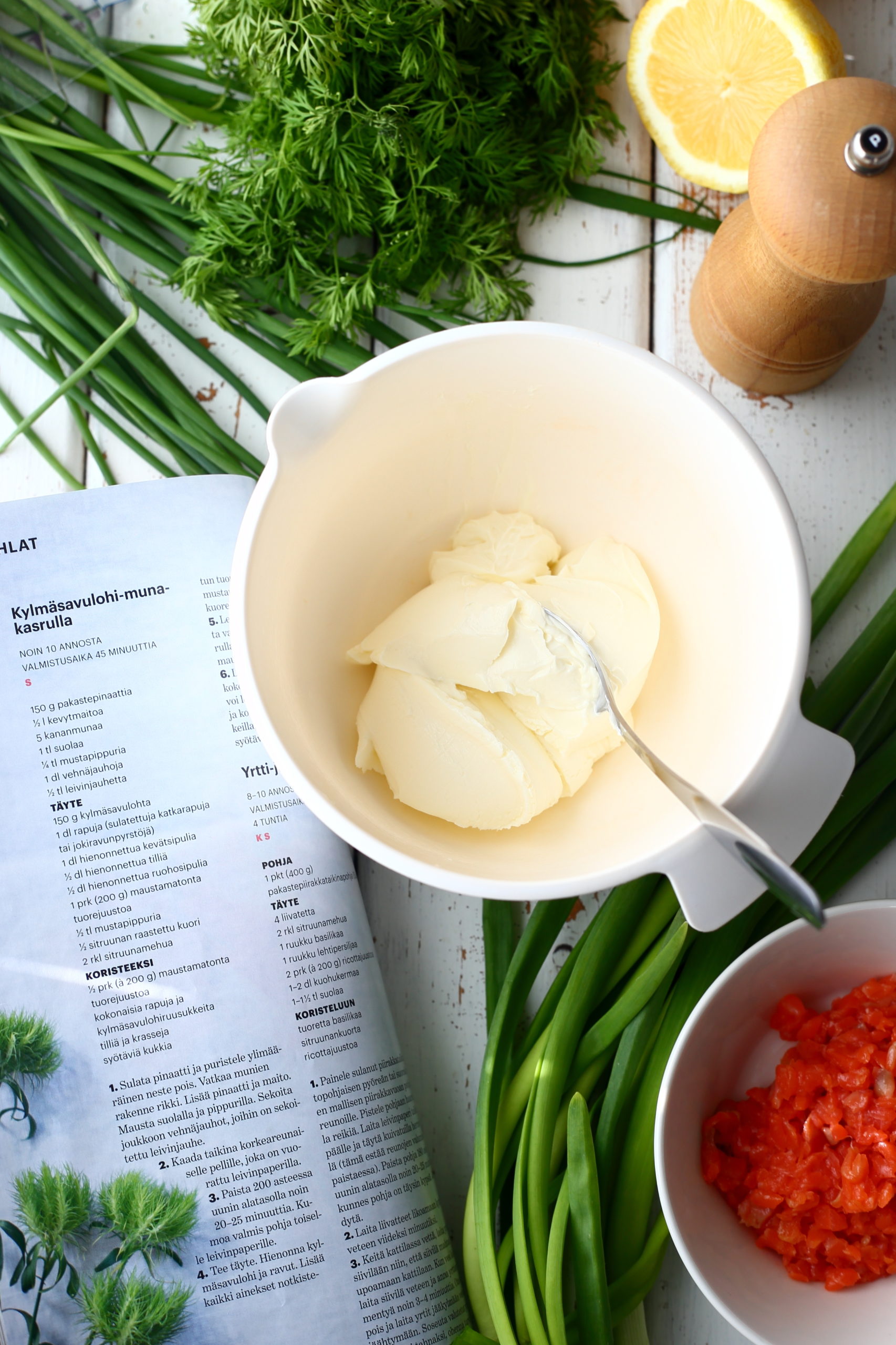 Tee täyte. Hienonna kylmäsavulohi.