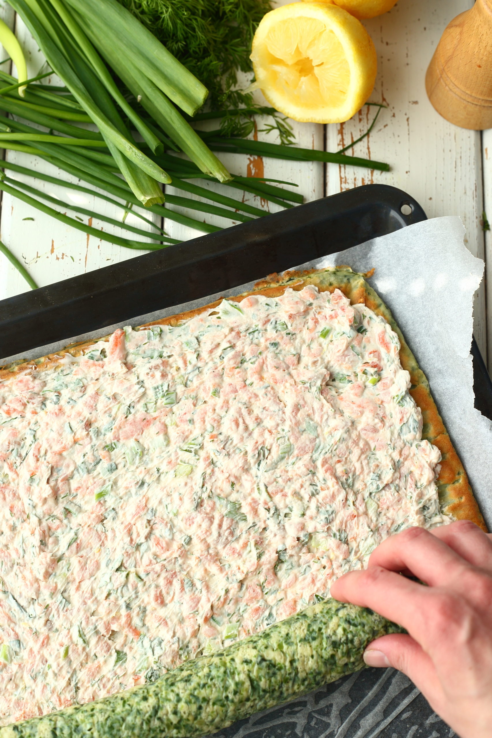 Tee munakas. Sulata pinaatti ja valuta ylimääräiset nesteet pois. Vatkaa munat rikki ja lisää joukkoon pinaatti, maito sekä suolaa ja pippuria. Sekoita joukkoon lopuksi vehnäjauhot, joihin on sekoitettu leivinjauhe. Kaadat taikina syvälle leivinpaperoidulle uunipellille. Paista 200 asteessa 20-25 minuuttia uunin alatasolla. Kumoa kypsä pohja toisen leivinpaperin päälle. Kumoa valmis pohja toiselle leivinpaperille ja anna jäähtyä.