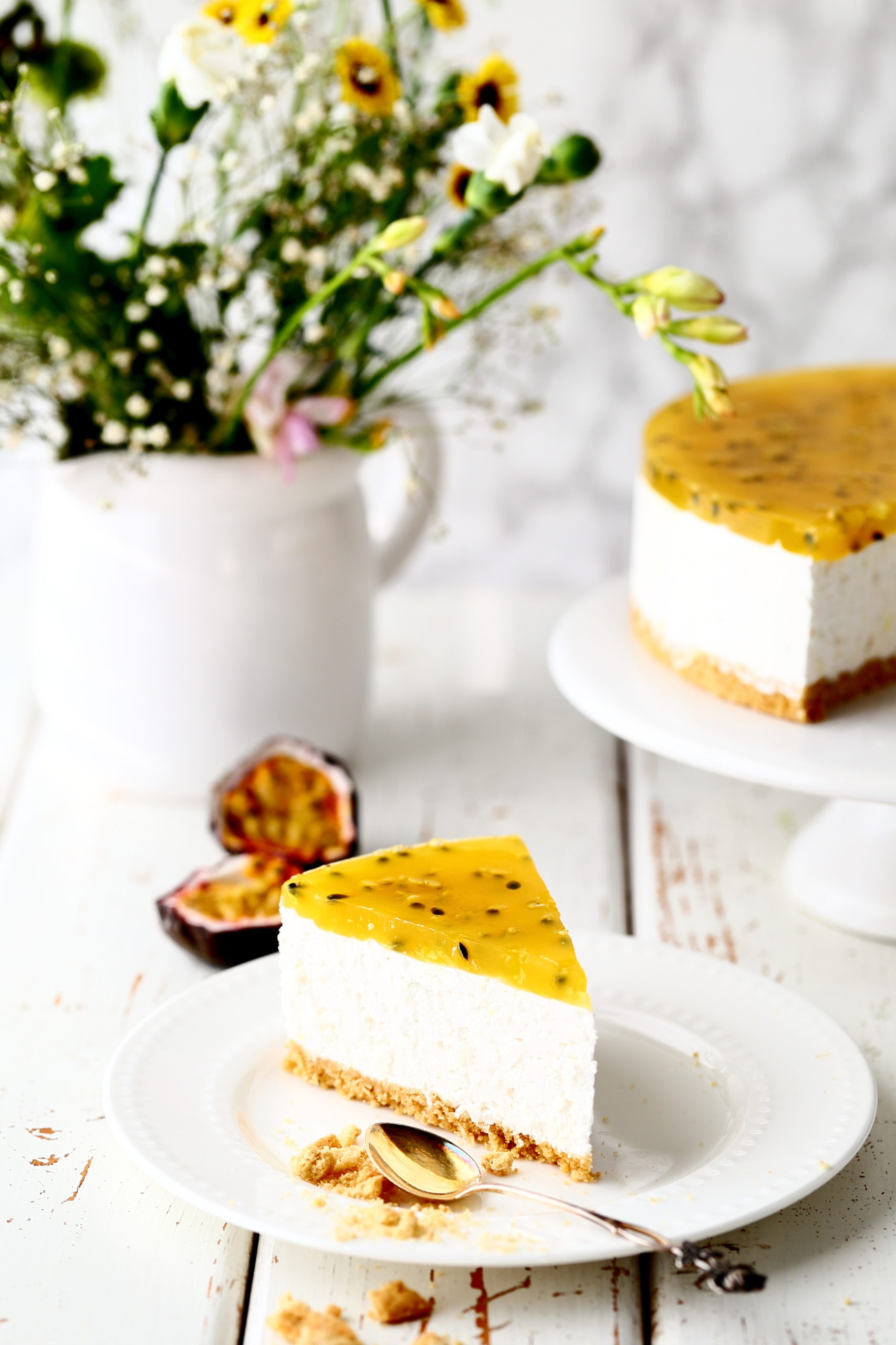 Raikas kookosjuustokakku passionkiilteellä (maidoton)