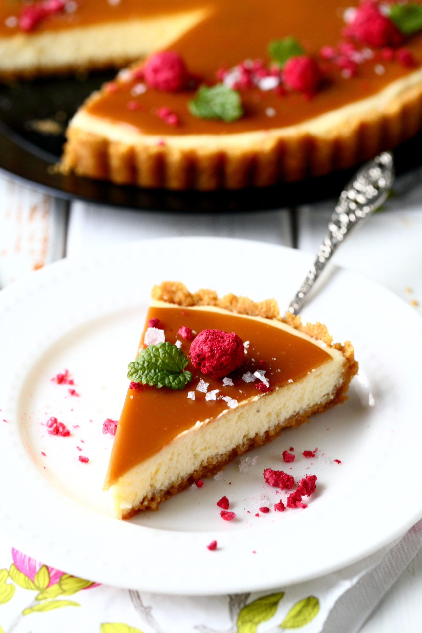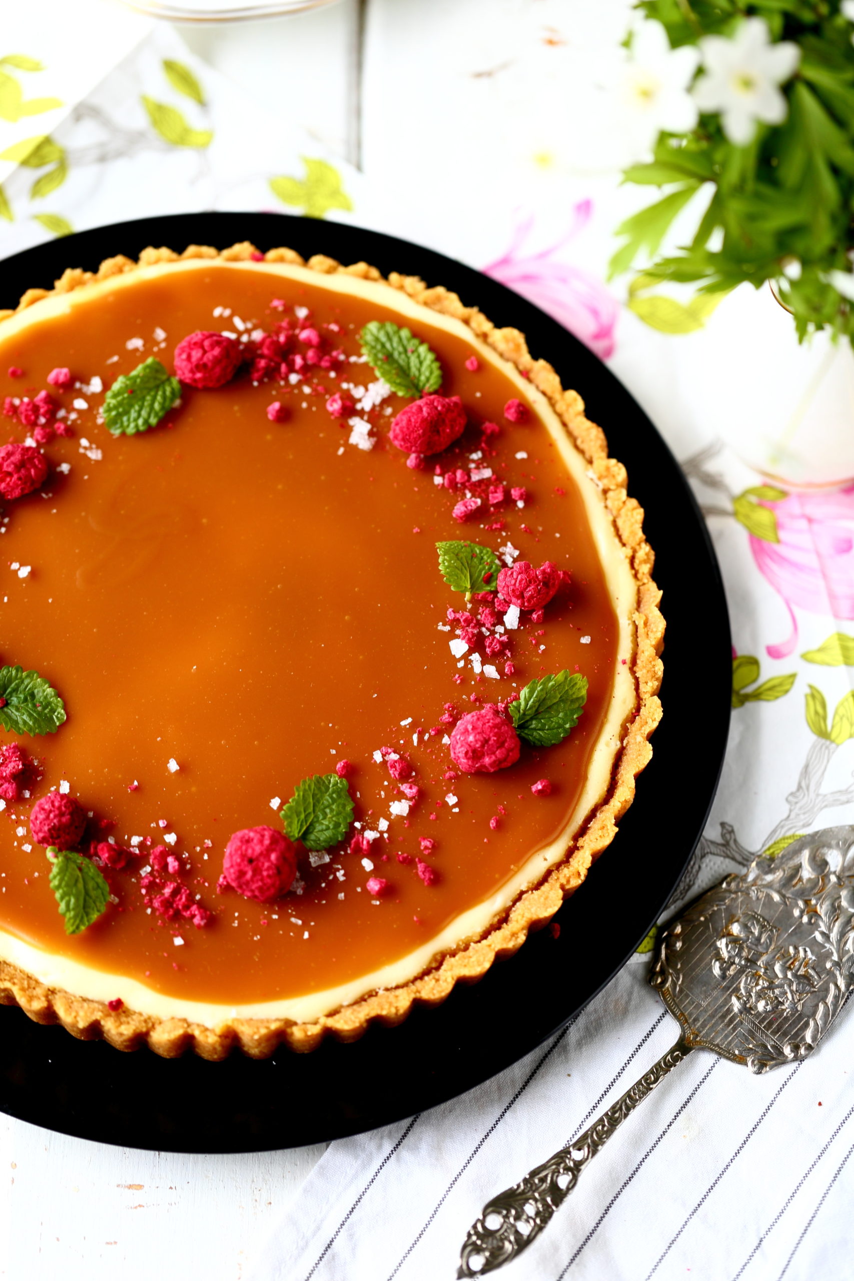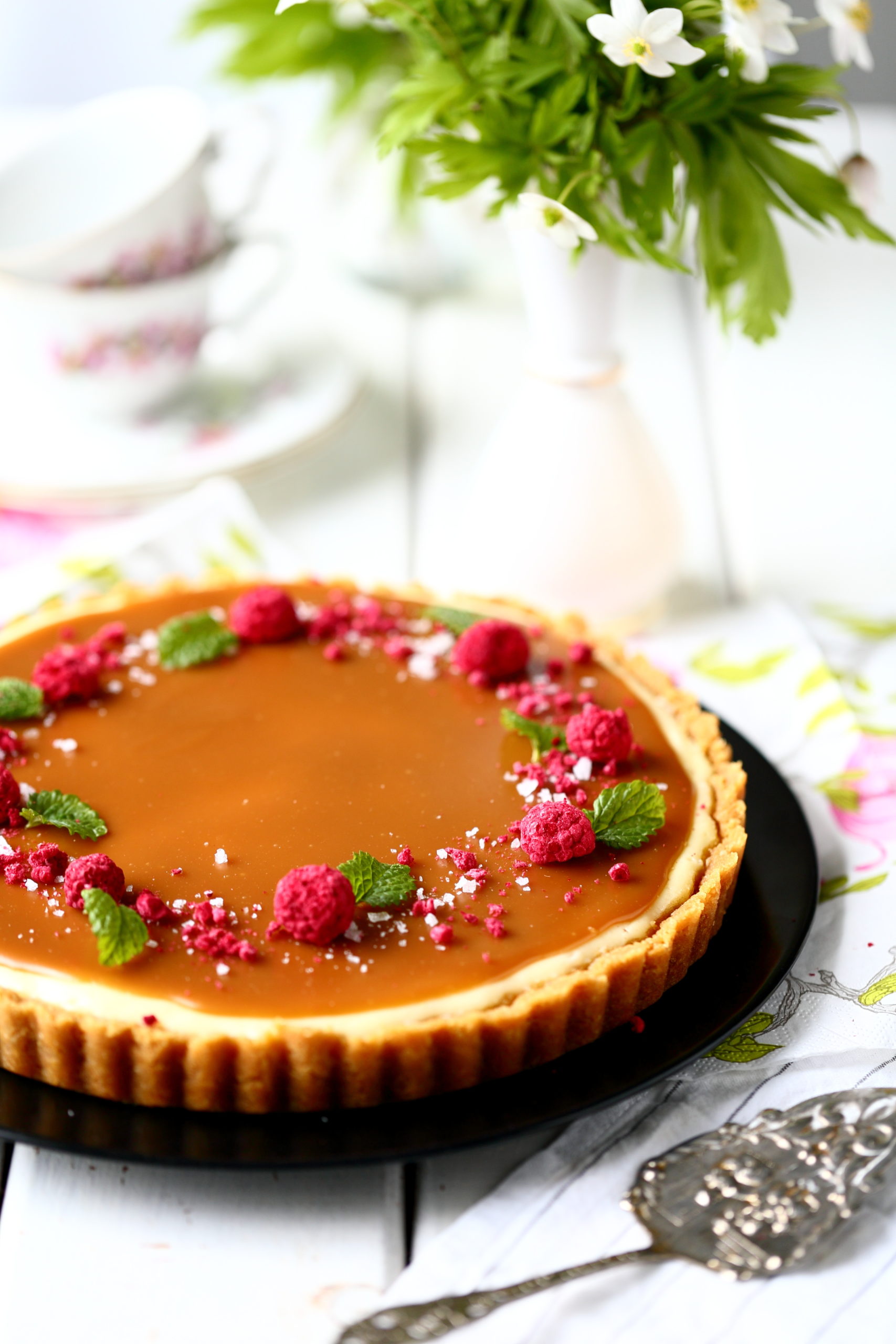 Yleensä salted caramel cheesecake -piirakat ovat koristelultaan hyvin yksinkertaisia eli niissä on kinuski päällä vain sormisuolaa. Juuri kun olin aloittamassa kuvaamista, kohnasin keittiönkaapissa ja sormiini osui pussillinen kuivattuja vadelmia. Päätin heittää niitä piirakan päälle tuomaan väriä. Myös sitruunamelissan lehdet olivat lähteneet niin hyvin kasvamaan talven jäljiltä, etten voinut vastustaa kiusausta laittaa myös niitä koristeeksi. Tästä tuli siis vähän normaalia koristellumpi versio, mutta tosiaan nuo vadelmat ja lehdet voi jättää halutessaan kokonaan pois.