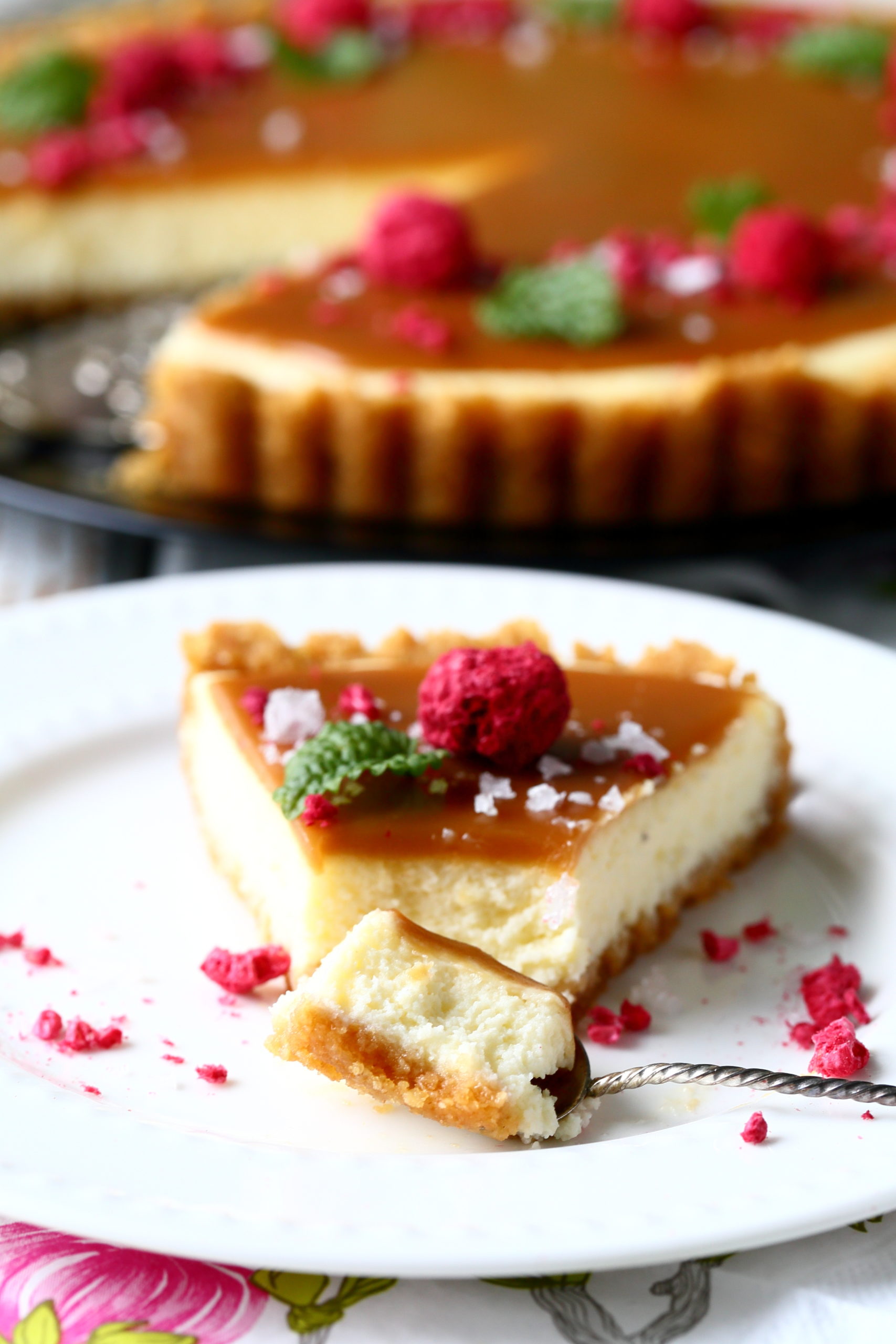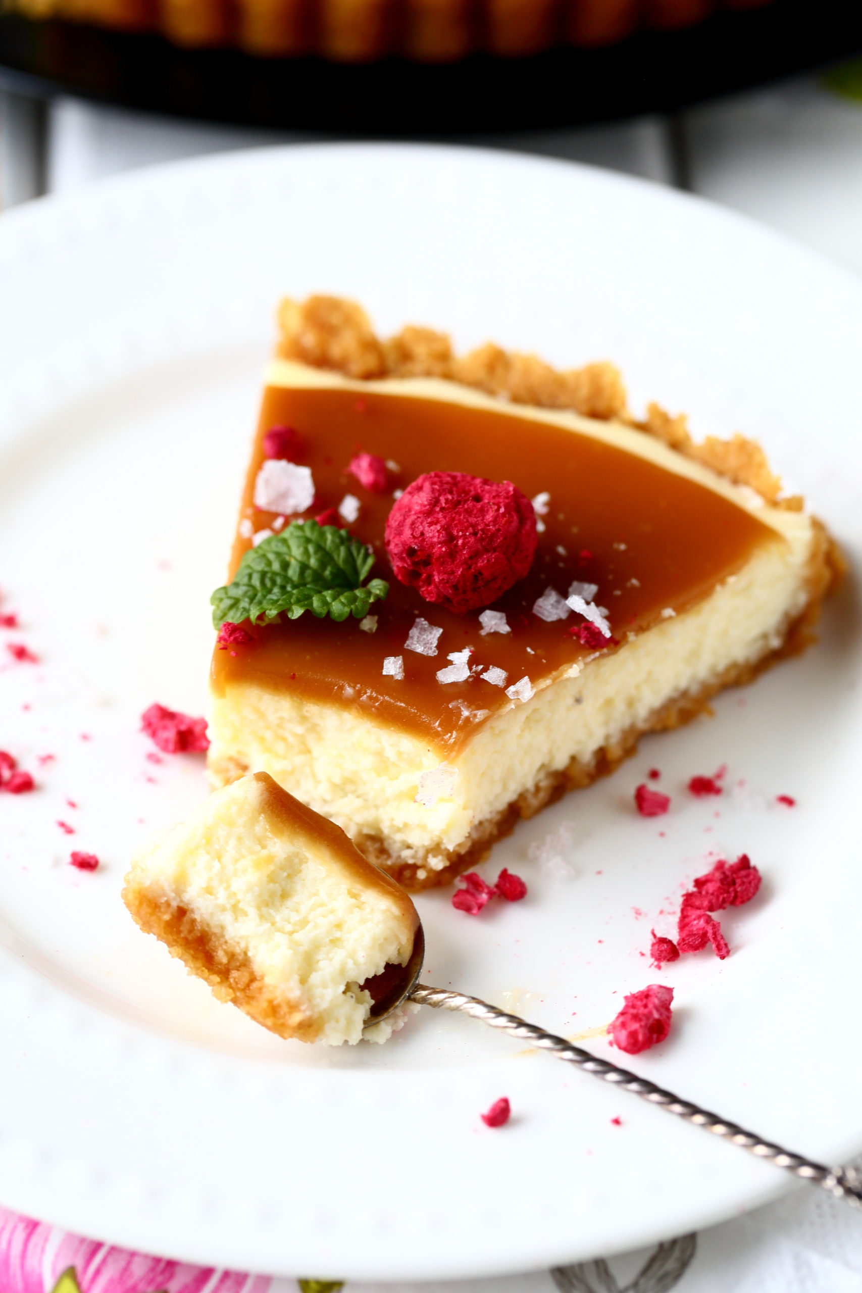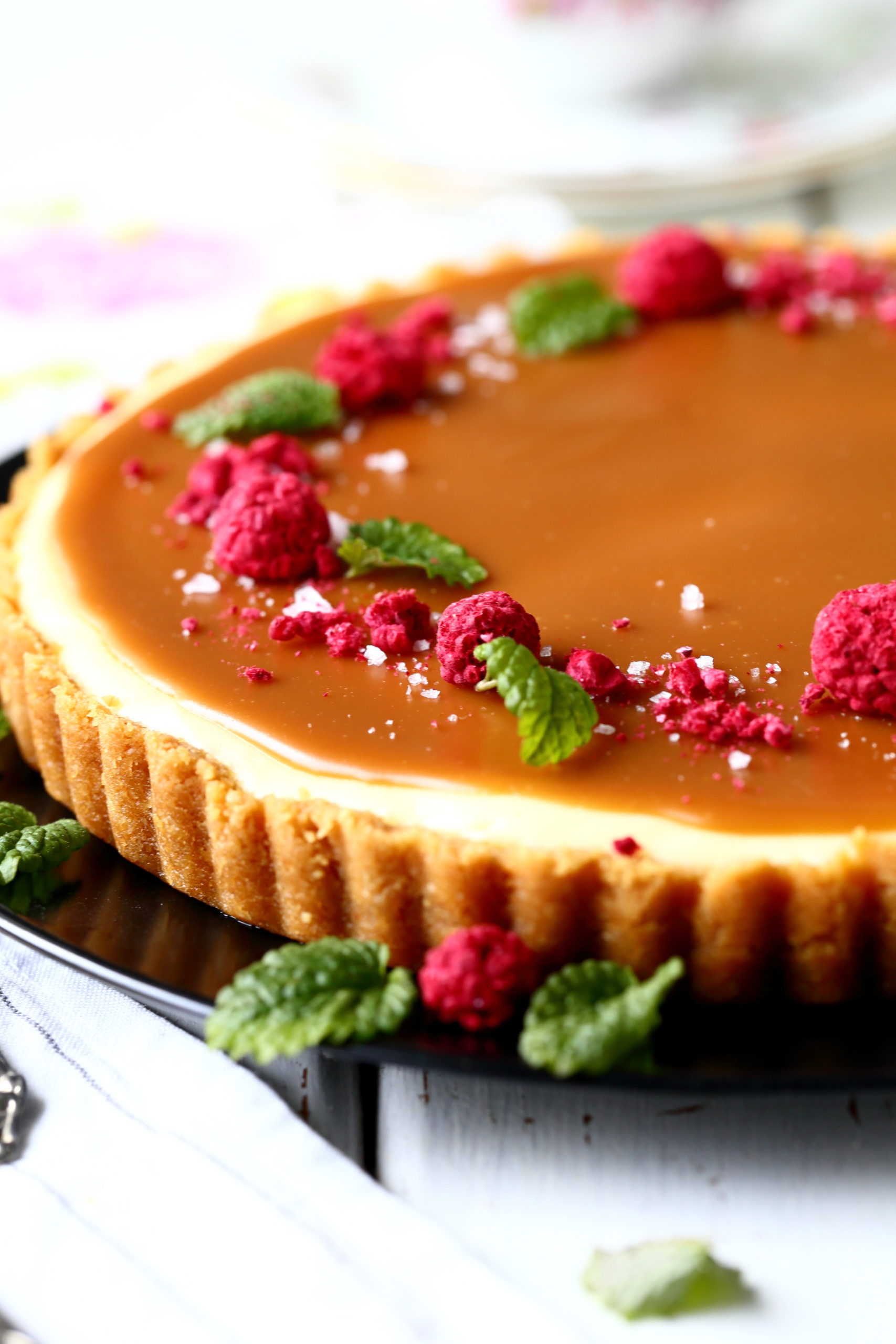 Yleensä salted caramel cheesecake -piirakat ovat koristelultaan hyvin yksinkertaisia eli niissä on kinuski päällä vain sormisuolaa. Juuri kun olin aloittamassa kuvaamista, kohnasin keittiönkaapissa ja sormiini osui pussillinen kuivattuja vadelmia. Päätin heittää niitä piirakan päälle tuomaan väriä. Myös sitruunamelissan lehdet olivat lähteneet niin hyvin kasvamaan talven jäljiltä, etten voinut vastustaa kiusausta laittaa myös niitä koristeeksi. Tästä tuli siis vähän normaalia koristellumpi versio, mutta tosiaan nuo vadelmat ja lehdet voi jättää halutessaan kokonaan pois.