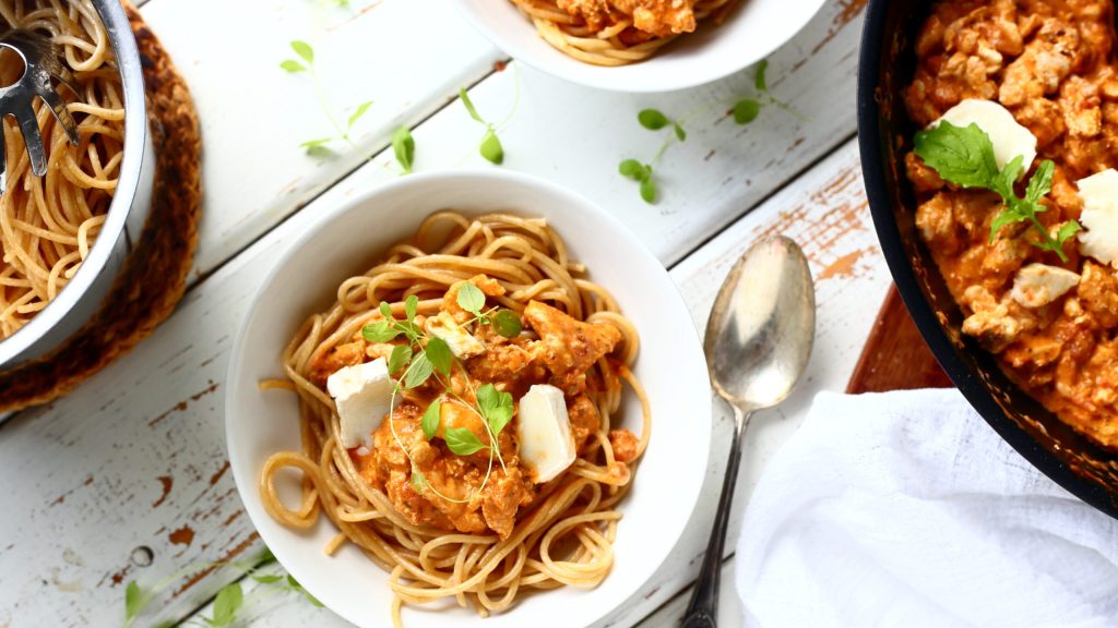 Helppo ja nopea broileri-pesto -pasta vuohenjuustolla