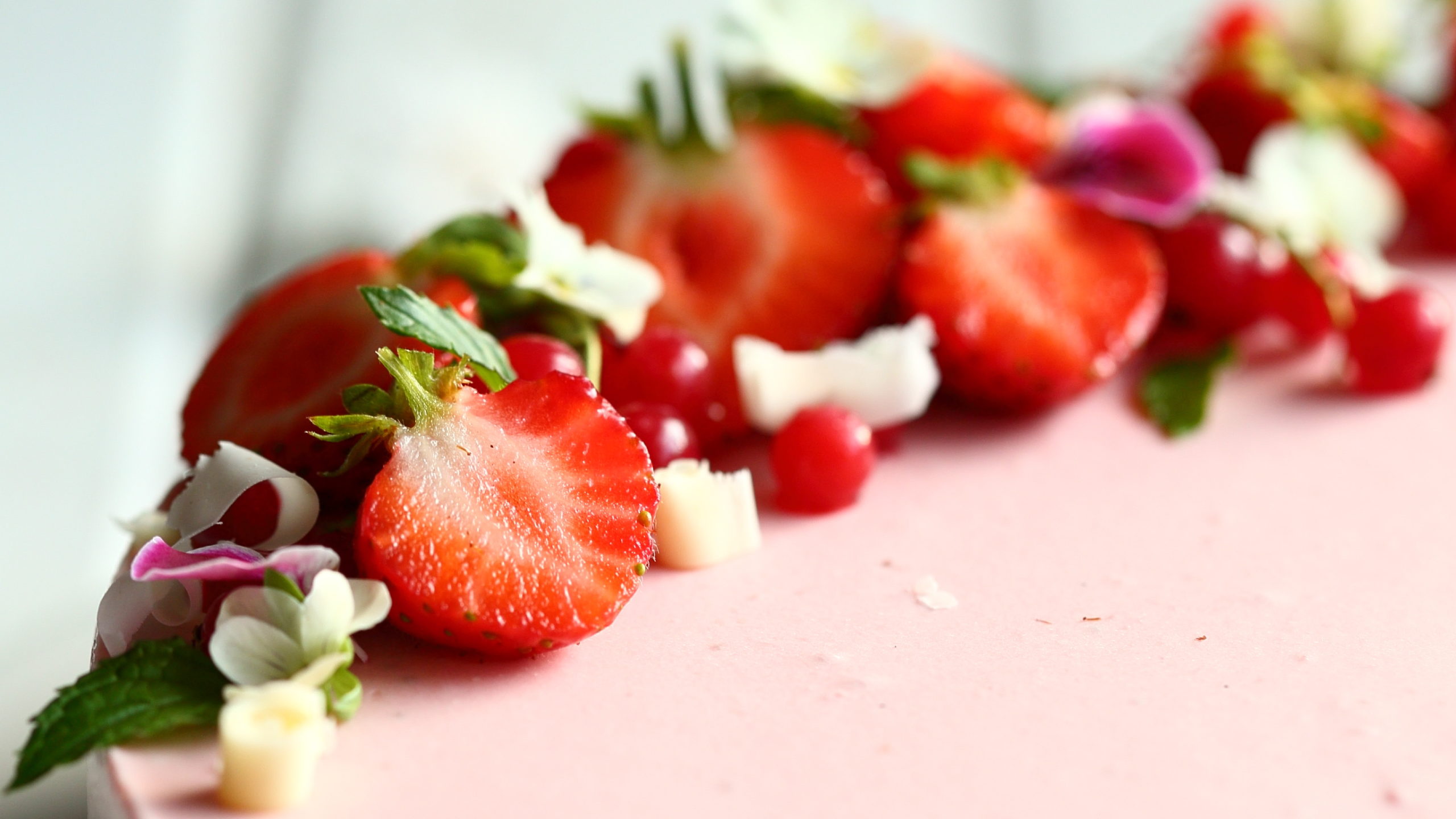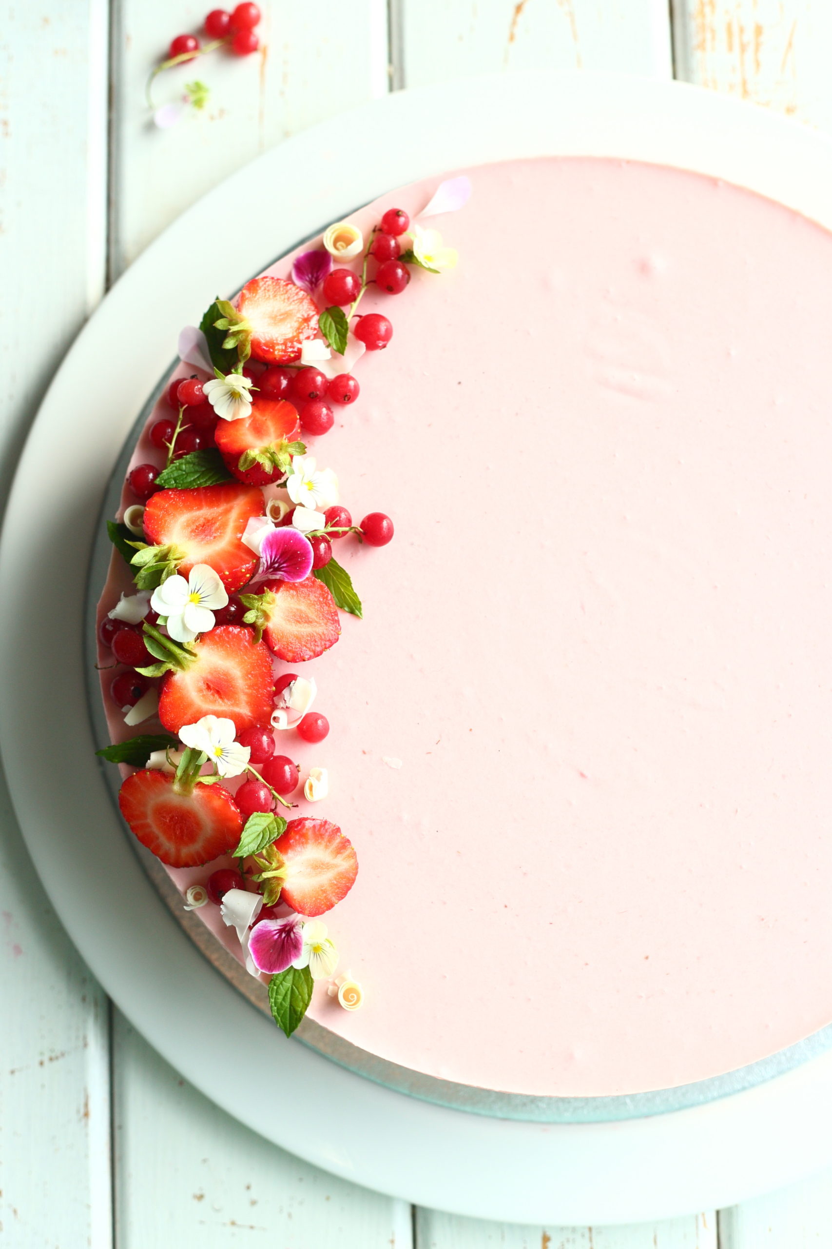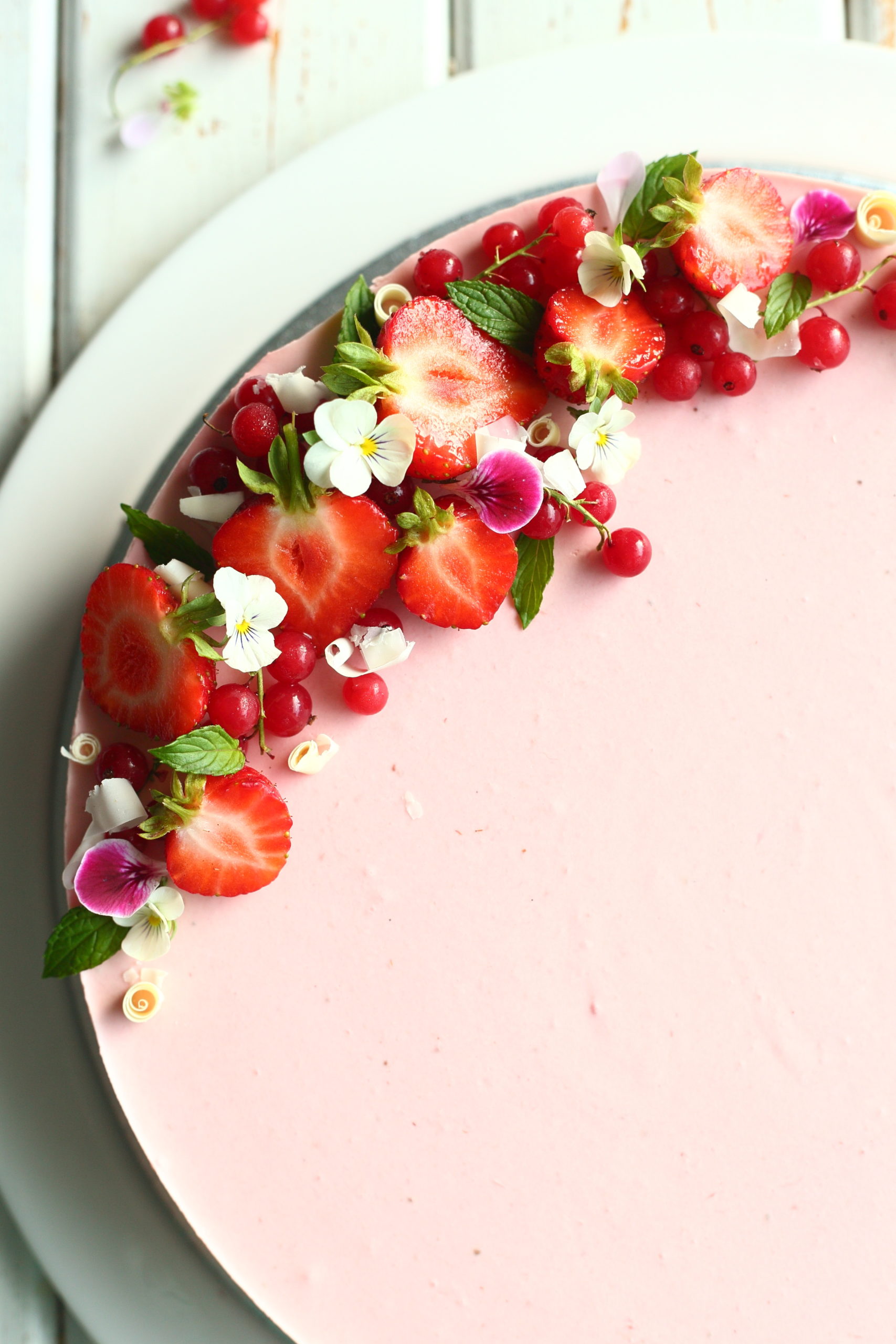 Mielettömän mehevä suklaakakkupohja on aivan ihanan juustokakun pohjana, joten myös tästä kakusta löytyy sellainen. Jätin pohjan tuonne vaaleanpunaisen moussen alle piiloon. Koska punaherukkacurdia oli jääkaapissa vielä hieman jäljellä, se päättyi tuon suklaakakkupohjan päälle ohueksi kerrokseksi tuomaan lisäraikkautta kokonaisuuteen. Moussemaista täytettä varten kaivoin myös pakkasen kätköistä jäljellä olevat mansikat esille ja tein niistä miedon mansikkaisen juustokakkutäytteen.