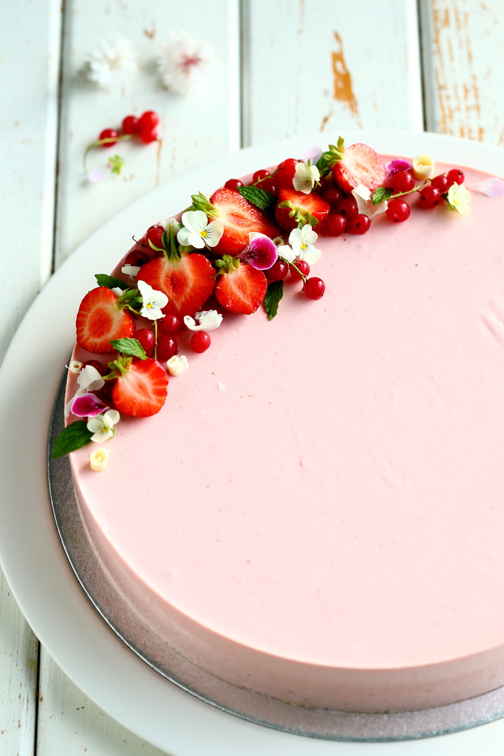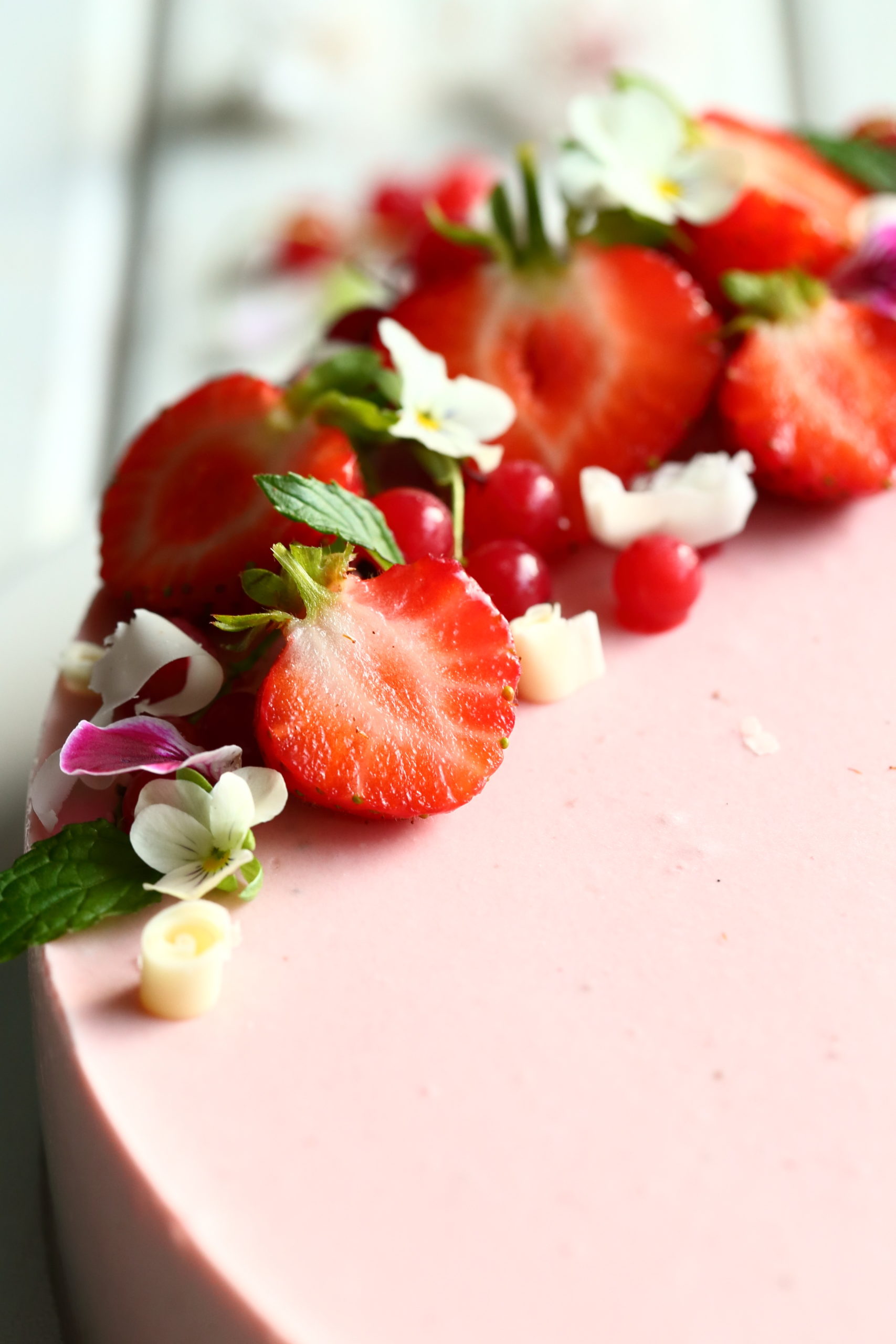 Olin alunperin kuvitellut ehtiväni keskittymään koristeluun enemmän, mutta lopulta, muuttolaatikoiden keskellä kävin hakemassa koristeita eli mansikat, syötävät kukat ja mintun lehtiä pikaisesti pihaltamme juuri ennen kuin kakku lähti tarhaan. Suunnittelemattomuudesta ja mielestäni vajaasta koristelusta huolimatta kakku sai kehuja sekä ulkonäöstään että ihanasta maustaan.