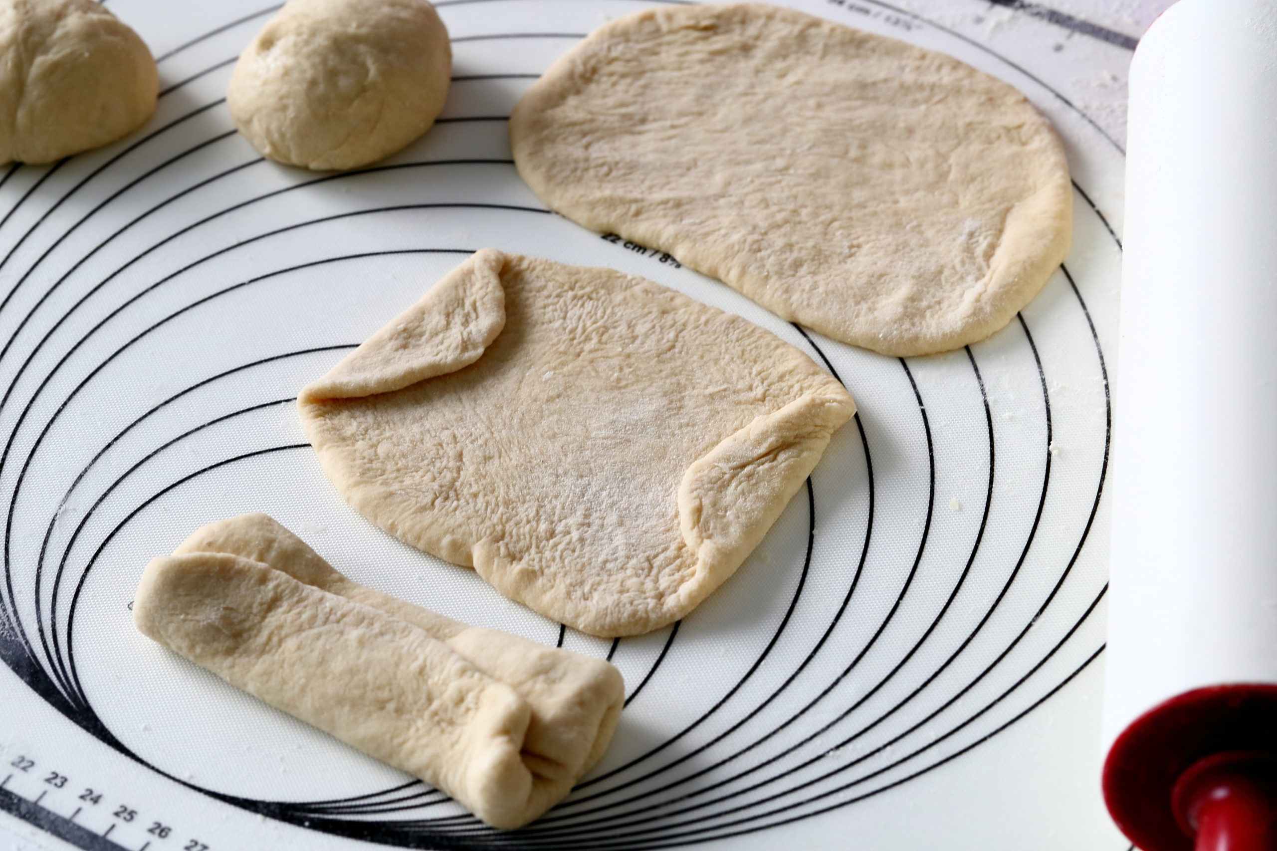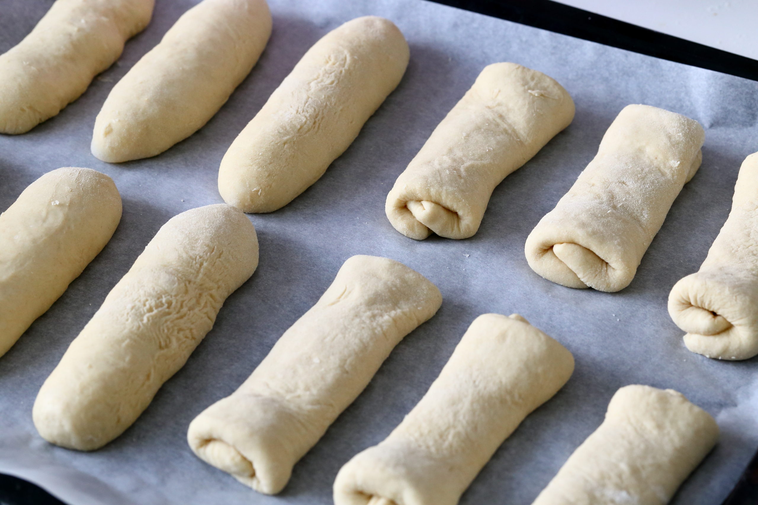 Kaada kohonnut taikina kevyesti jauhotetulle tasolle. Jos haluat isoja hot dogeja, jaa taikina 12 osaan ja kaulitse kukin osa noin 17 cm soikeaksi lätyksi (ks. vinkkiosiosta alempaa toisenlainen tapa tehdä muotoilu). Pienempiä hodareita varten ja taikina 16 osaan ja kaulitse taikinat n. 15 cm pituisiksi lätyiksi. Jos taikina on kovin tarttuvaa, ripottele päälle lisää jauhoja. Taita soikioiden reunat sisäänpäin, jotta reunoista tulee tasaiset. Käännä pitkät sivut päällekkäin.