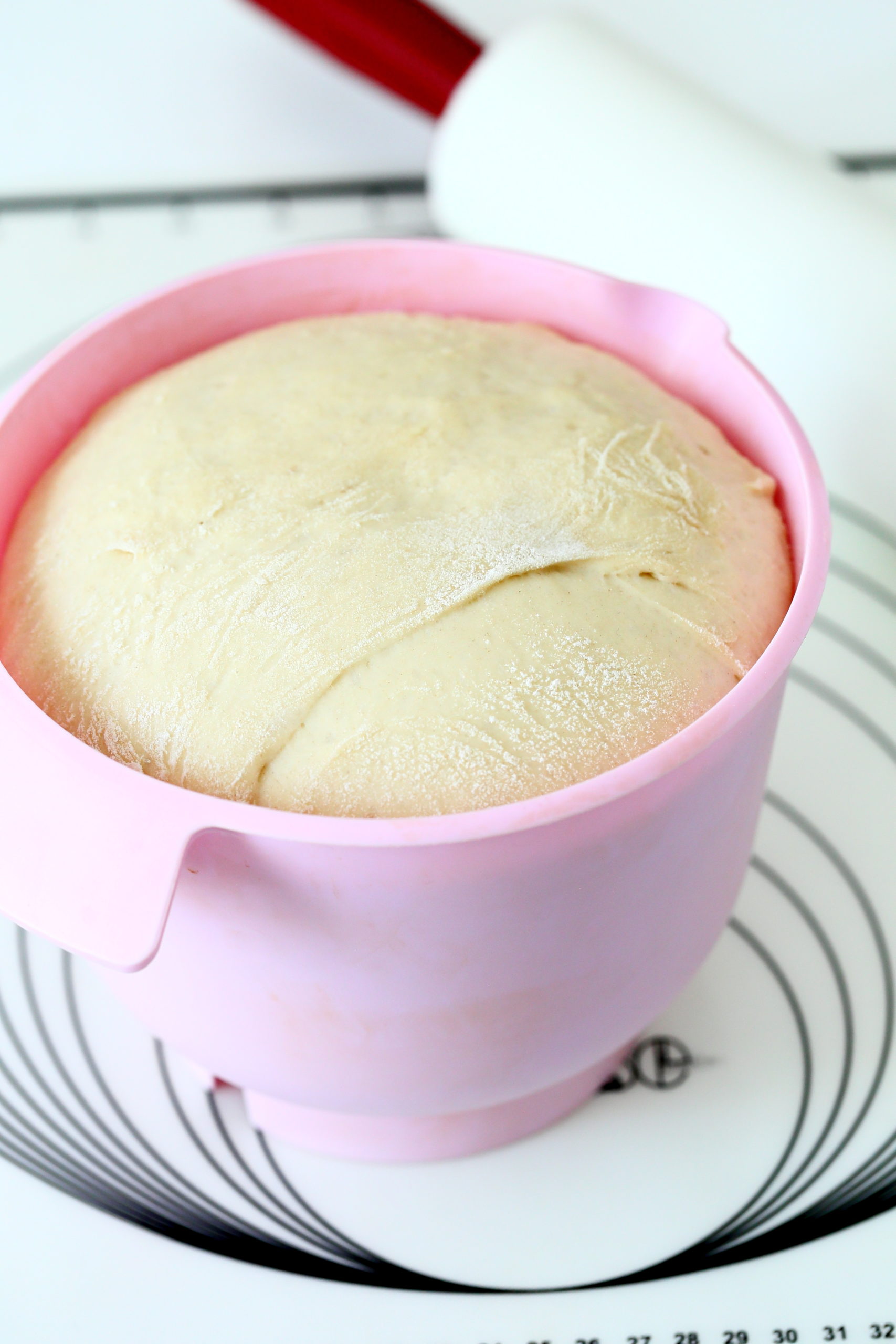 Sekoita tällä välin 9 dl jauhoja ja suola keskenään sekaisin. Nypi voi jauhojen joukkoon. Sekoita muna maito-hiivaseokseen ja lisää se jauhojen joukkoon. Vaivaa taikinaa yleiskoneella noin 20 minuuttia. Taikina saa jäädä hyvin pehmeäksi ja hieman tarttuvaksi. Jos taikina on kovin tarttuvaa, lisää joukkoon vielä n. 0.5 dl jauhoja ja jatka vaivaamista muutama minuutti. Kelmuta taikinakulho ja kohota taikinaa lämpimässä paikassa noin 1 tunti, kunnes se on suurin piirtein kaksinkertaistunut.