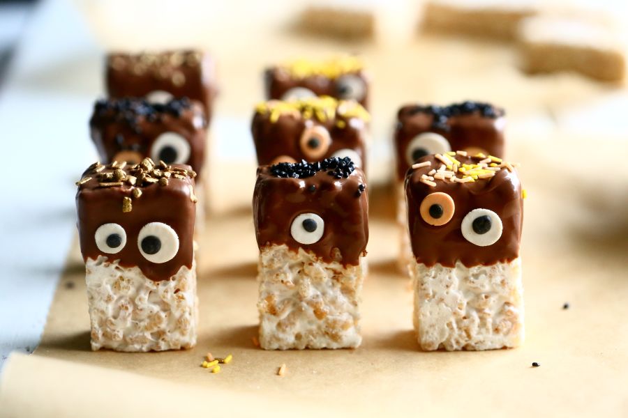 Kymmenes ohje liittyy Halloweeniin, joka lähestyy nyt kovaa vauhtia. Halloweenina maistuu vaikka Halloweenin riisimuroörkit. Riisimuromassa valmistuu vain muutamasta aineesta helposti mikrossa. Siitä voi muotoilla minkämuotoisia örkkejä tahansa. Kun örkit dippaa sulatettuun suklaaseen, kiinnittää suklaaseen silmät ja vähän nonparelleja, on erityisesti lapsille maistuvat herkkupalat valmiita. Toki näitä mutustelee mieluusti myös näin hieman vanhemmallakin iällä…