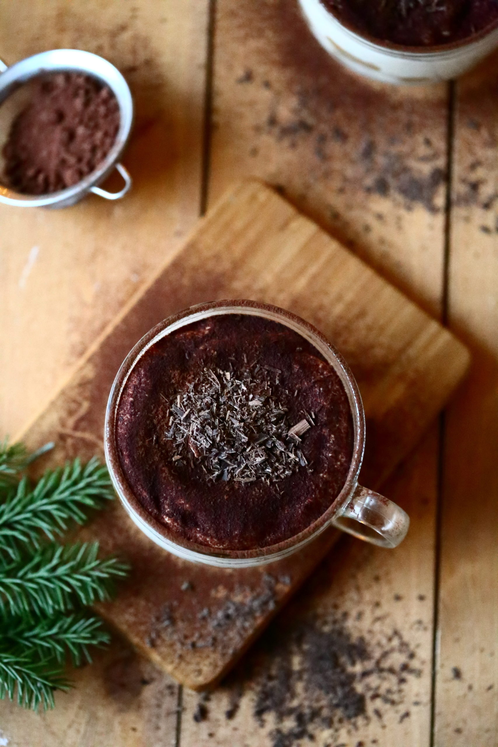Laita kulhot jääkaappiin vähintään mielellään seuraavaan päivään. Siivilöi päälle tummaa kaakaojauhetta ja höylää tummasta suklaasta esim. juustohöylällä suklaalastuja tiramisujen päälle juuri ennen tarjoilua.