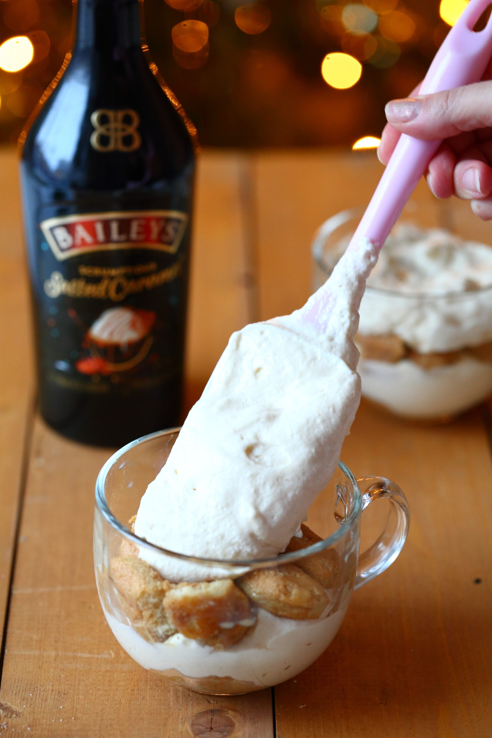 Kasta Savoiardi-keksit Baileys-kahvi -seoksessa kauttaaltaan. Laita annoskulhojen pohjalla keksejä niin, että se peittyy. Lusikoi keksien päälle mascarponevaahtoa. Lado tämän jälkeen uusi keksikerros vaahdon päälle. Jatka laittamalla vuorotellen vaahtoa ja keksejä. Päällimmäiseksi tulee kerros vaahtoa.