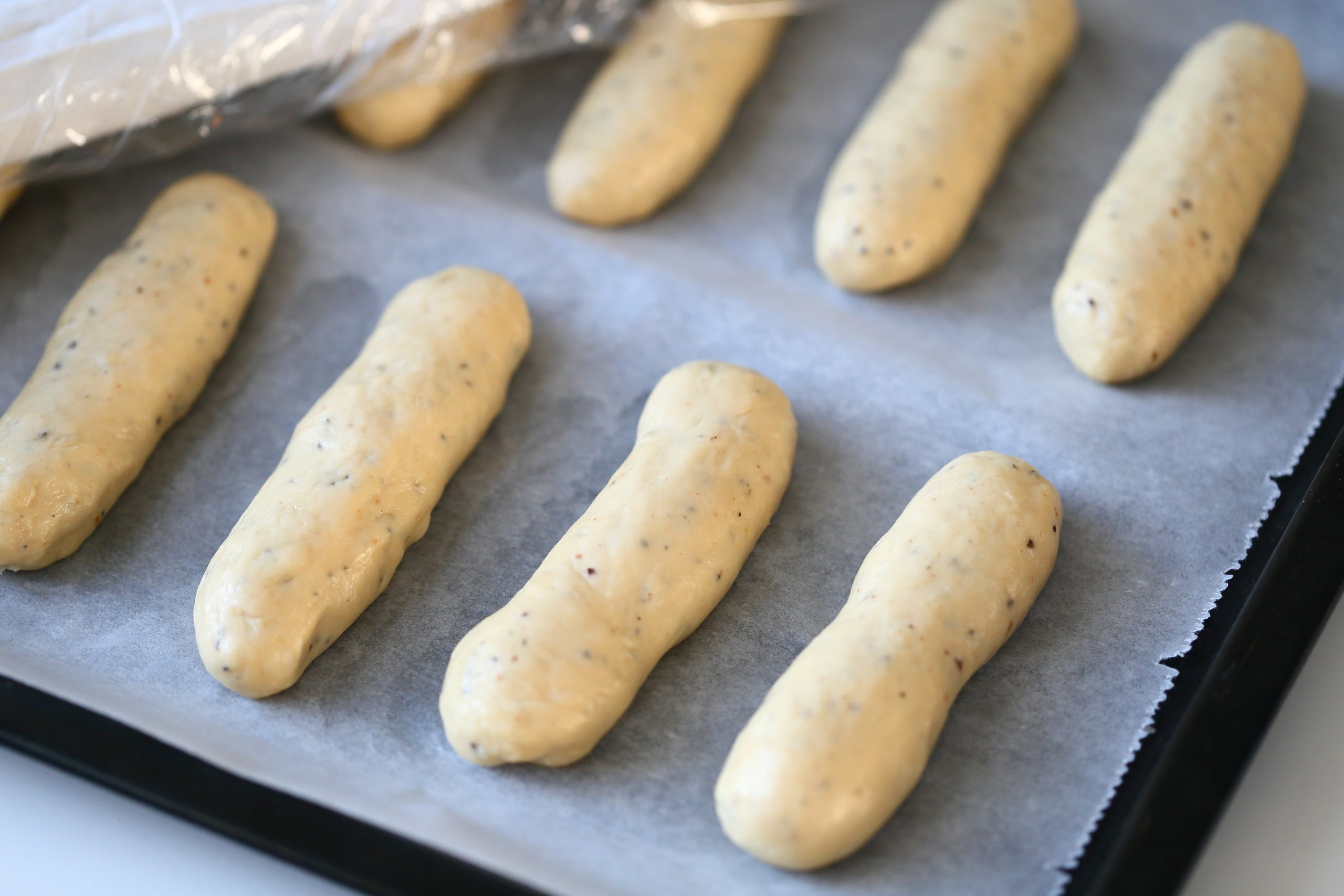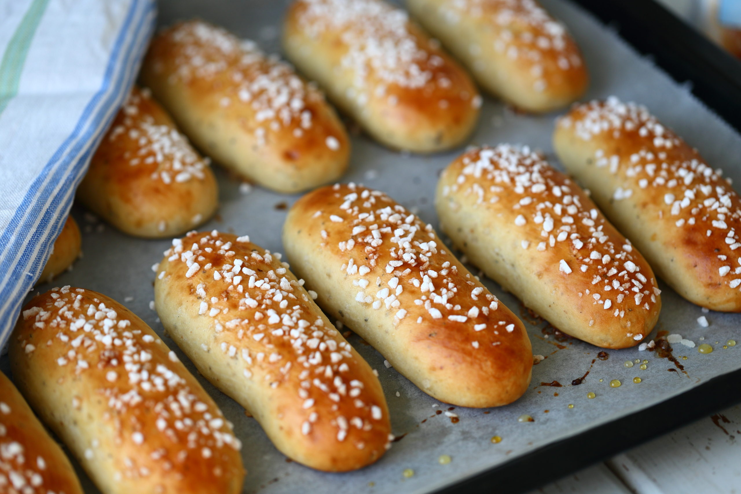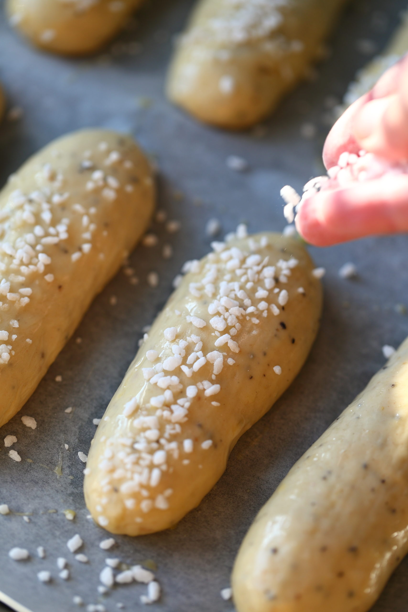 Pyörittele palat palloiksi ja sen jälkeen tee niistä noin 13 cm pituisia pötköjä. Vuoraa kaksi uunipeltiä leivinpaperilla. Nosta 12 pötköä kummallekin uunipellille. Laita pullien päälle kelmu löyhästi ja sen päälle vielä leivinliina. Jätä nousemaan huoneenlämpöön niin pitkäksi aikaa, että pullat ovat nousseet kaksinkertaisiksi. Tähän kuluu aikaa huoneenlämmöstä riippuen noin 1-2 tuntia.