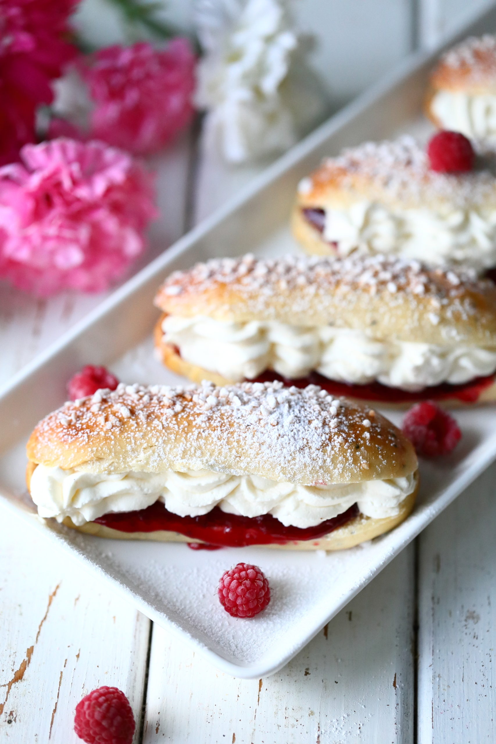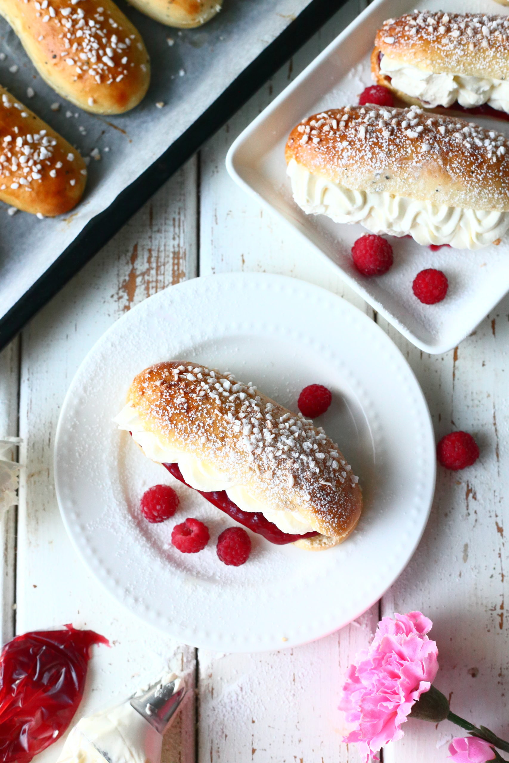 Olin jo tekemässä tähän mennessä parhaita syömiäni laskiaispullia eli kerroshampurilaisia muistuttavia kaksikerroksisia laskiaispullia, mutta yhtäkkiä päähäni pälkähti aiemmin tekemäni hotdog-sämpylät. Noissa sämpylöissä täytteet pysyvät hyvin sisällä, vaikka täytettä olisikin reilusti. Siksi halusin kokeilla, miten yleensä poskilla tursuava täyte pysyy hotdog-muotoisen pullan sisällä. Niin syntyivät nämä hot dog -laskiaispullat. Ja voi että kuinka ihania näistä tuli!