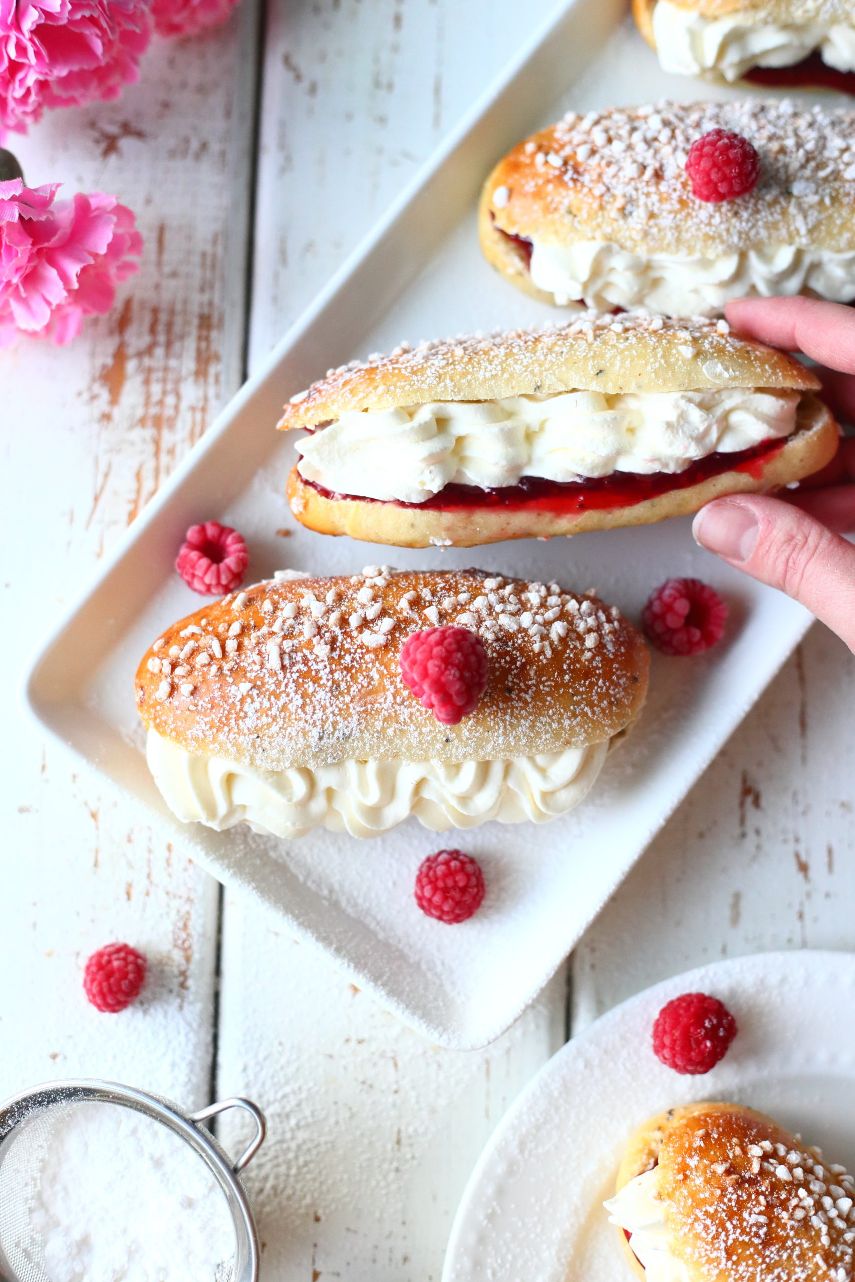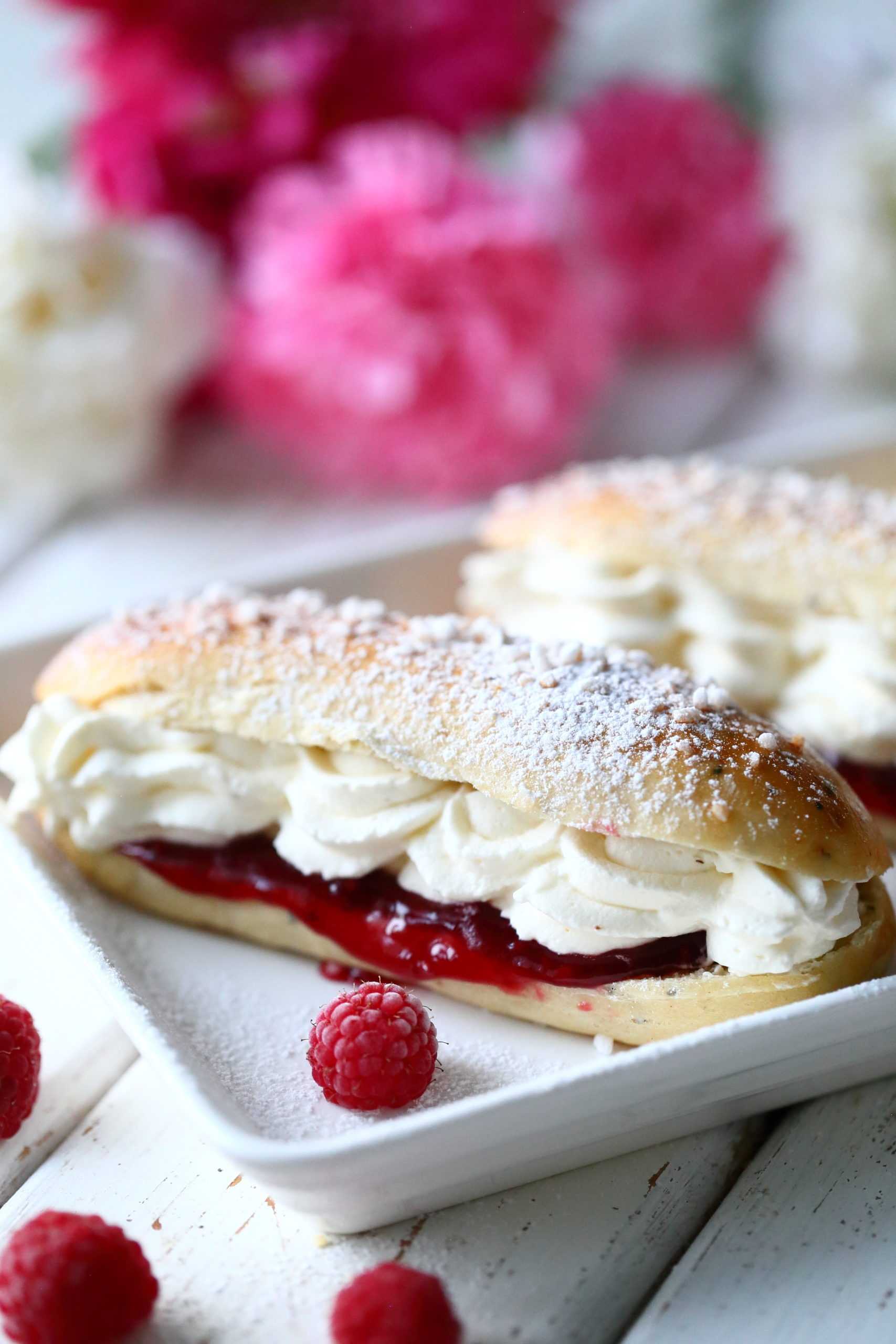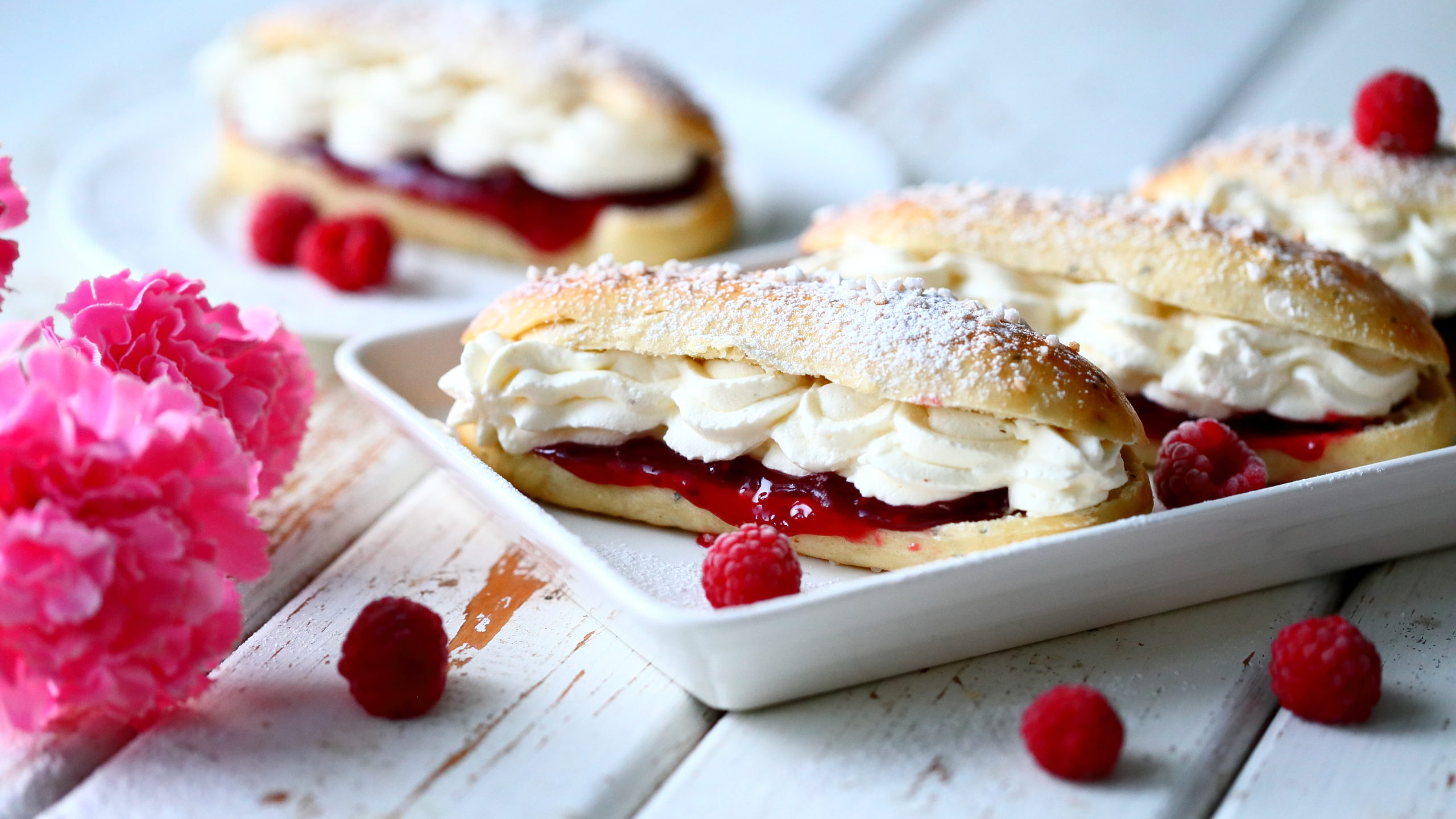 Jäähdytä kokonaan. Leikkaa pullan toinen sivu auki ja täytä esimerkiksi hillolla, mantelimassalla tai nutellalla sekä kermavaahdolla. Ei muuta kuin nauttimaan!