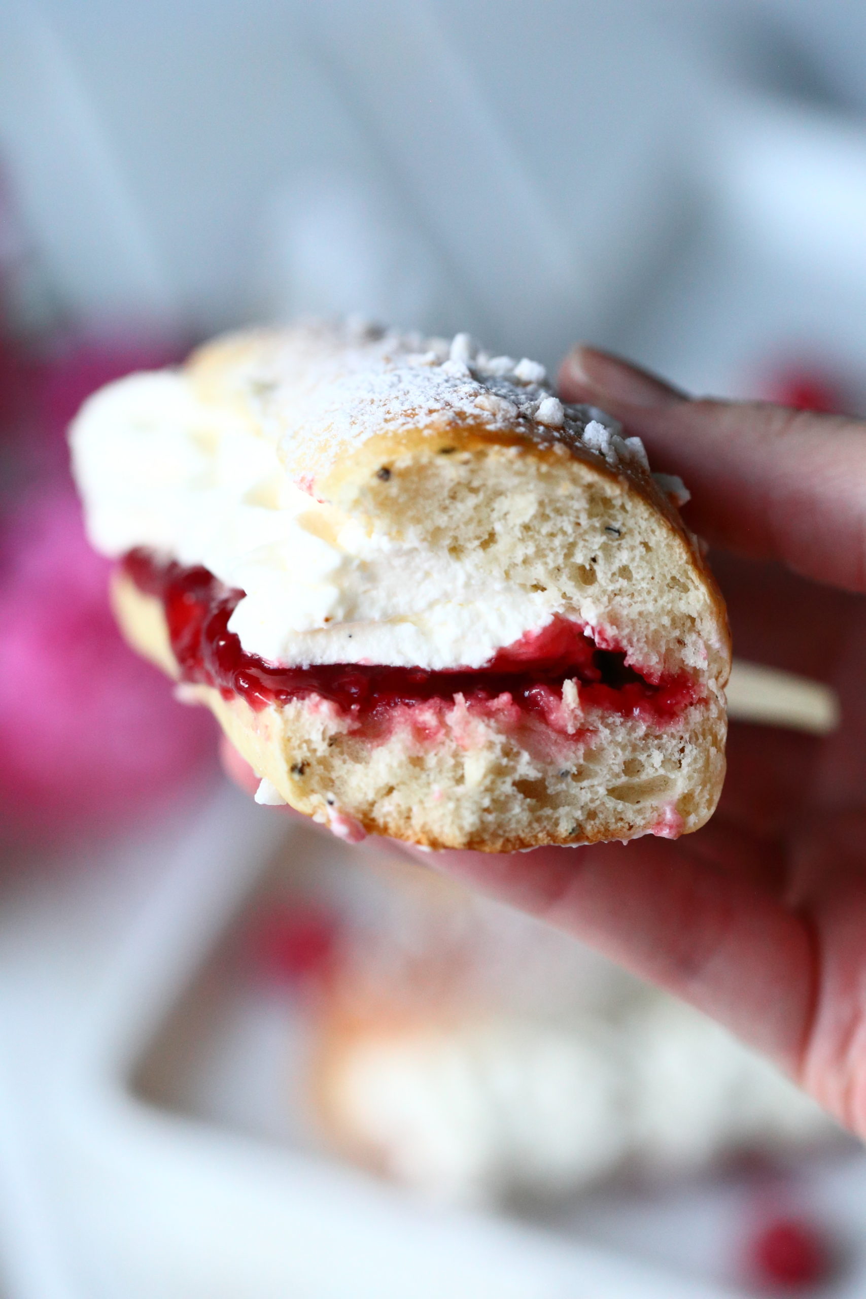 Näistä tuli niin hyviä, että meinasin lopettaa kuvaamisen heti kun maistoin ensimmäisen haukun. Täyte pysyi näissä hyvin ja sitä oli joka haukulla sopivasti. Paitsi jos erehtyi litistää pullaa liikaa ja kermavaahdot pursuivat pois. Paras tapa syödä näitä oli selvästi se, että piti laskiaispullahodaria kädessään niin, että täyte osoitti kattoa kohti. Näin välttyi suurimmalta suttaamiselta.