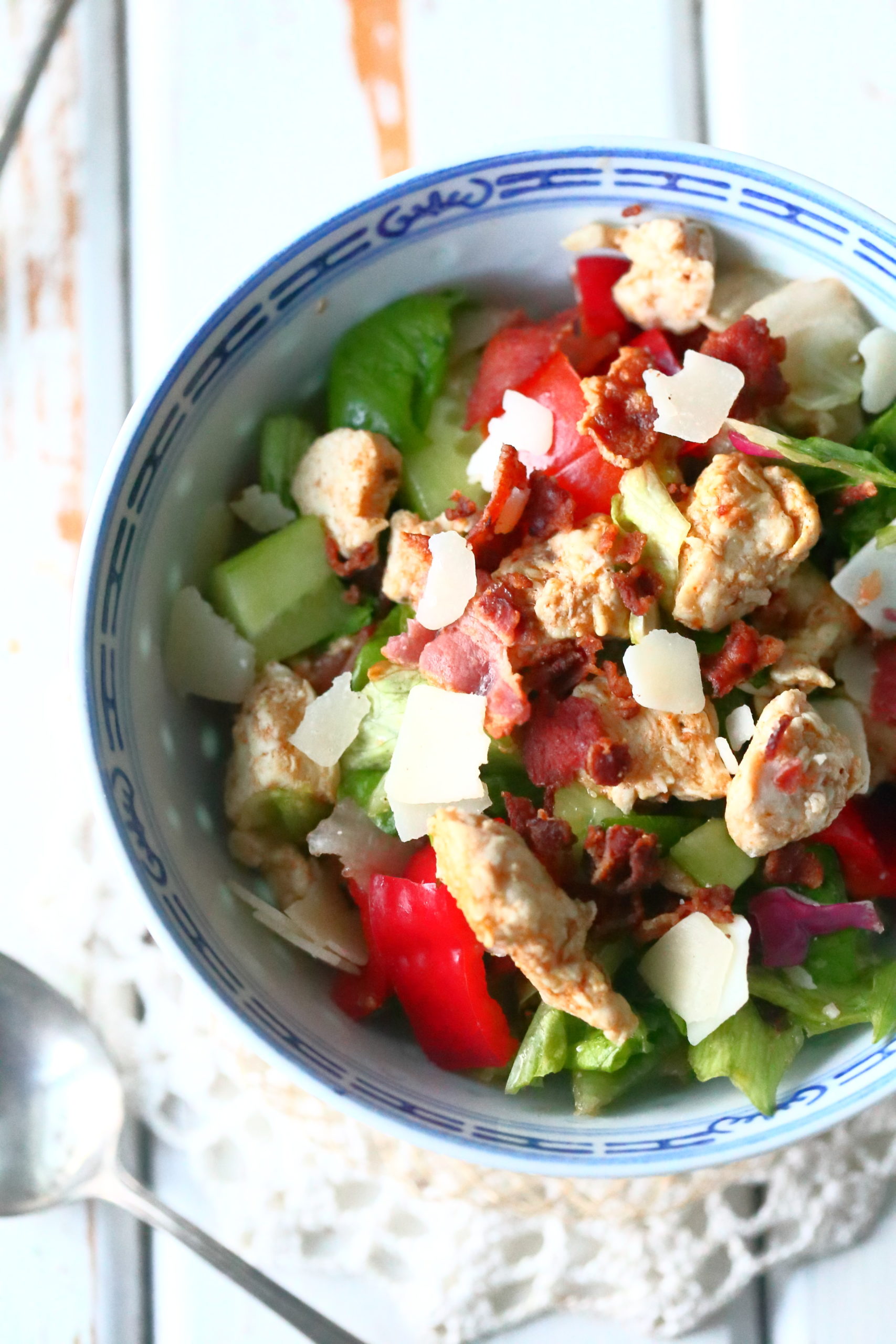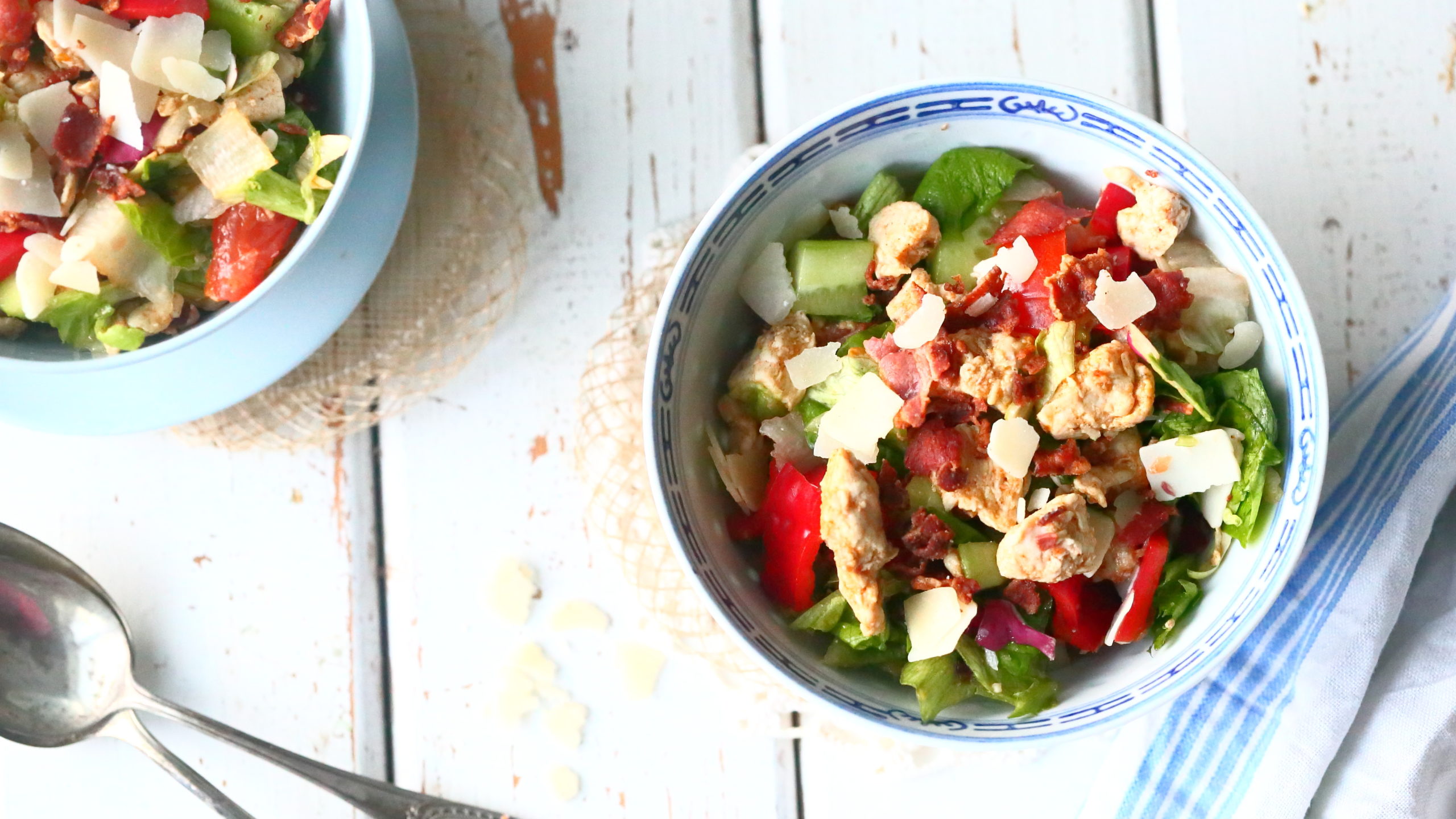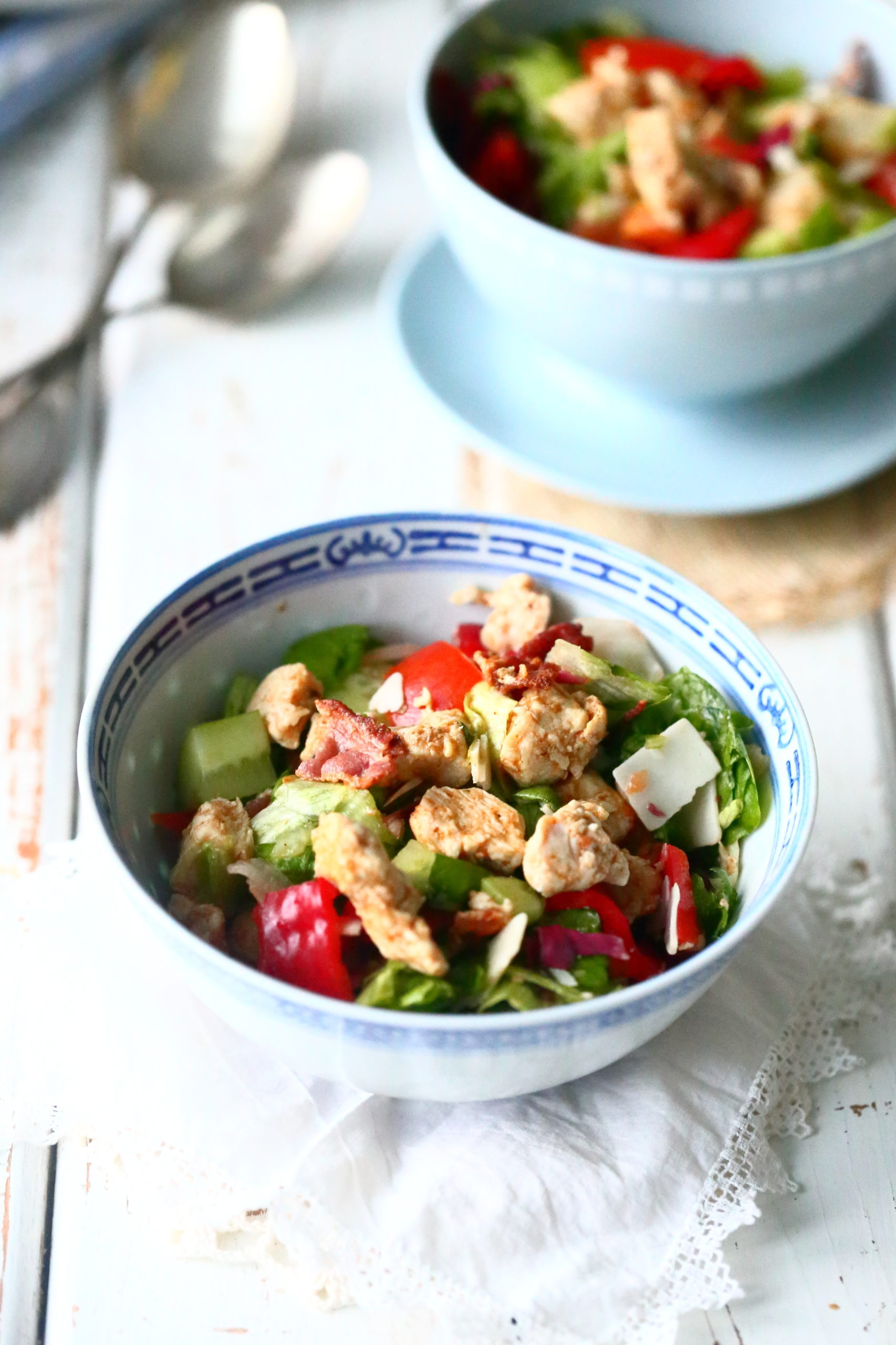 Ruokaisat salaatit ovat hyviä arkiruokia, sillä ne valmistuvat suht nopeasti, maistuvat hyviltä ja niitä on helppo muokata jääkaapin sisällön ja oman maun mukaan. Yleensä ruokaisan salaatin pohja syntyy meillä sillä ajatuksella, että siinä on lihan tai muun proteiinin lisäksi jokin toinen proteiininlähde, se sisältää vähintään kahta erilaista salaattia ja kahta tai kolmea erilaista kasvista. Tässä salaatissa, kuten usein muulloinkin, pohjana on broileri, joka saa lisämakua suolaisesta pekonista ja isosta määrästä kasviksia.