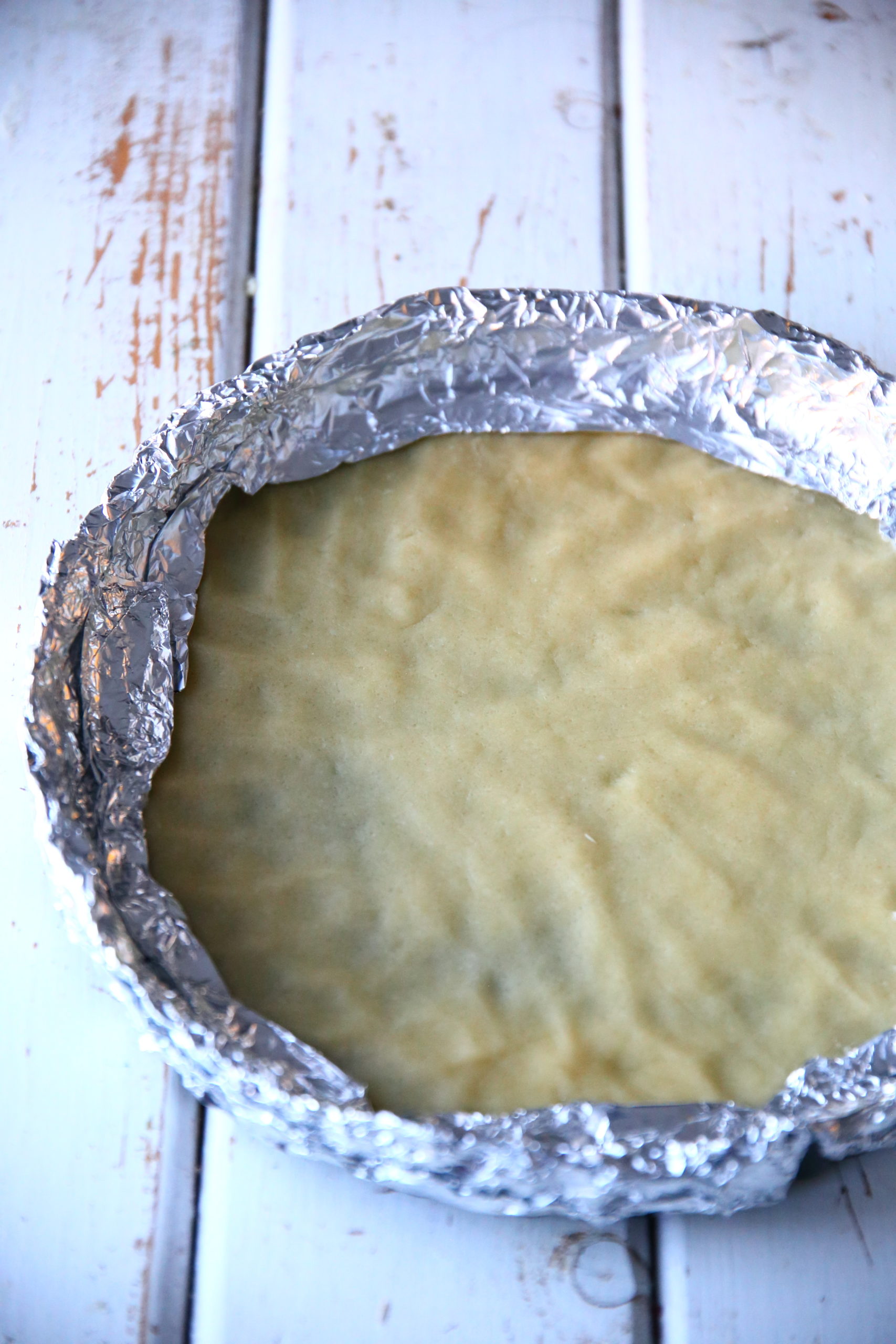 Tee pohja: Nypi keskenään kuivat aineet ja jääkaappikylmä rasva. Lisää vesi ja sekoita nopeasti tasaiseksi. Painele pohjataikina vuoan pohjalle ja reunoille. Nosta vuoka jääkaappiin tunniksi. Laita uuni lämpeämään 200 asteeseen. Laita vuoan sisäpuolelle folion suikaleet reunojen tueksi.