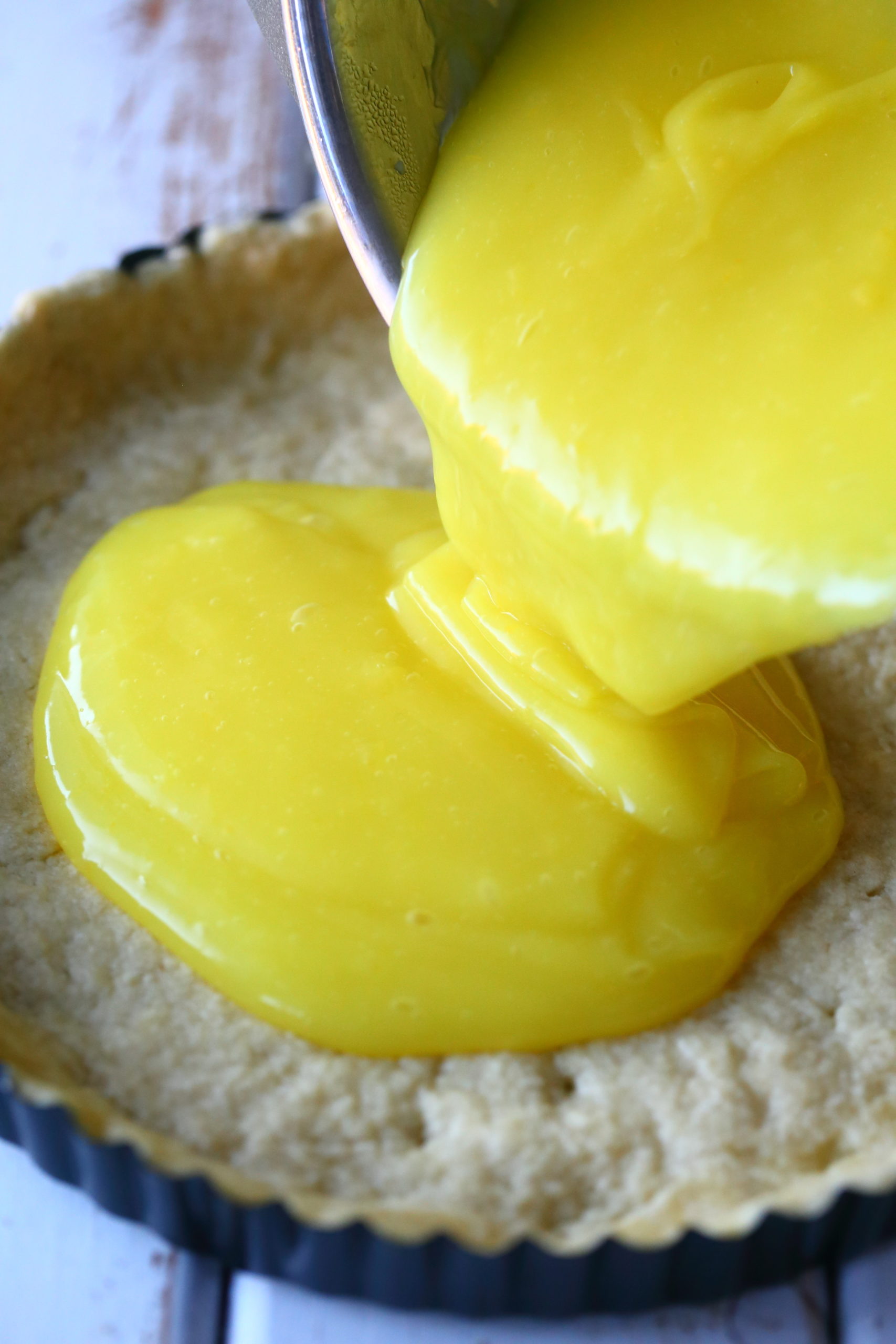 Tee täyte: Mittaa sitruunanmehu, sokeri, maissitärkkelys, vesi kattilaan. Keitä koko ajan kunnolla sekoittaen, kunnes seos paksenee ja jatka keittämistä noin minuutti. Ota pois levyltä ja lisää soijajogurtti ja sitruunan raastettu kuori. Lisää halutessasi 1-2 tippaa pastaväriä, jolloin saat täytteestä valkoisen sijasta sitruunan keltaisen. Kaada täyte pohjan päälle.