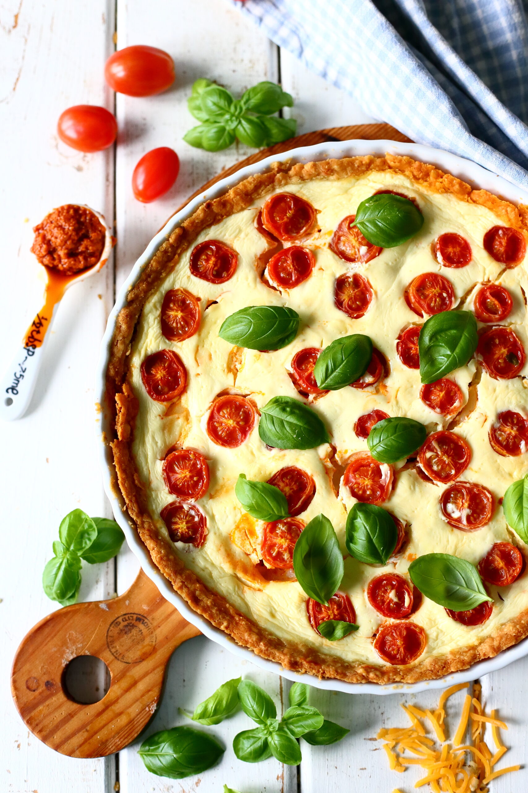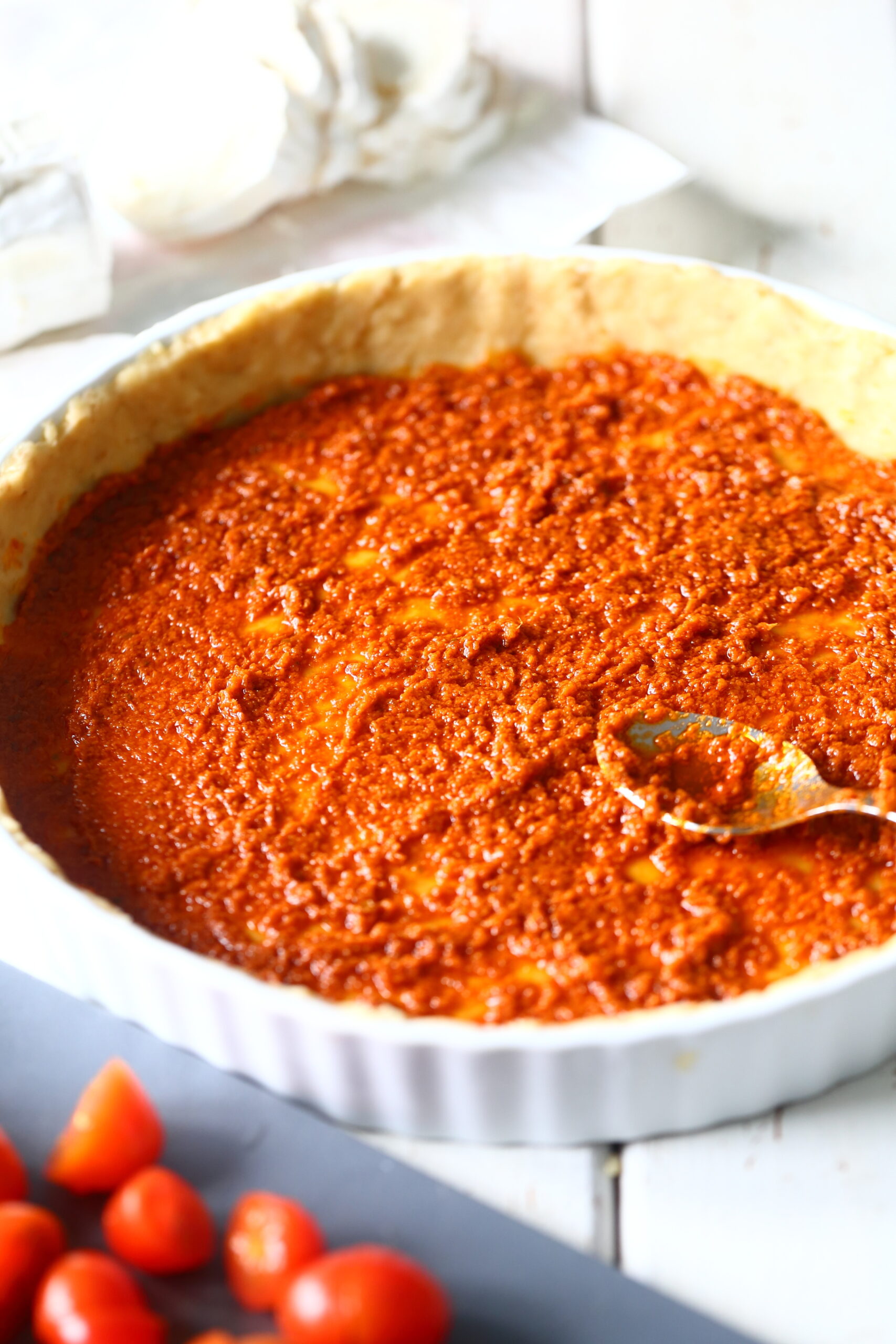 Halusin piiitkästä aikaa tehdä suolaisia piirakoita ja päädyin käyttämään piirakkaan uutta suosikkiainettani eli punaista pestoa. Punainen pesto sopii todella, siis todella moneen ruokaan ja vaikka sellaisenaan voileivän päälle. Punaisen peston ja vuohenjuuston yhdistelmä on kuitenkin sellainen, että se vie kielen mennessään. Sen takia tuo parivaljakko valikoitui pienten sattumusten kautta myös tämän piirakan täytteeksi. Ja voi että kuinka herkullista tästä tuli! Niin hyvää, että ensimmäisen palan jälkeen oli todella vaikea hillitä itseään ottamasta toista palaa. Nam!