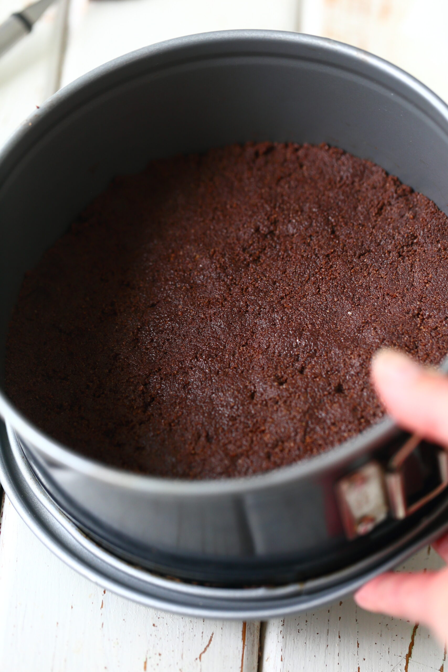 Murskaa keksit hienoksi jauheeksi ja lisää joukkoon kaakaojauhe. Sekoita joukkoon myös sulatettu voi. Painele keksimuruseos vuoan pohjalle. Nosta vuoka jääkaappiin täytteen teon ajaksi.