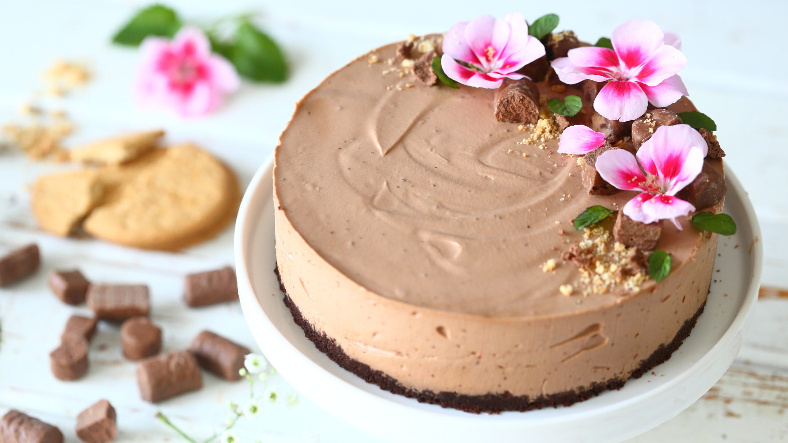 Poista vuoan reunaosa, nosta kakku tarjoilulautaselle ja koristele Pätkiksen paloilla ja vaikka syötävillä kukilla ja keksimuruilla.