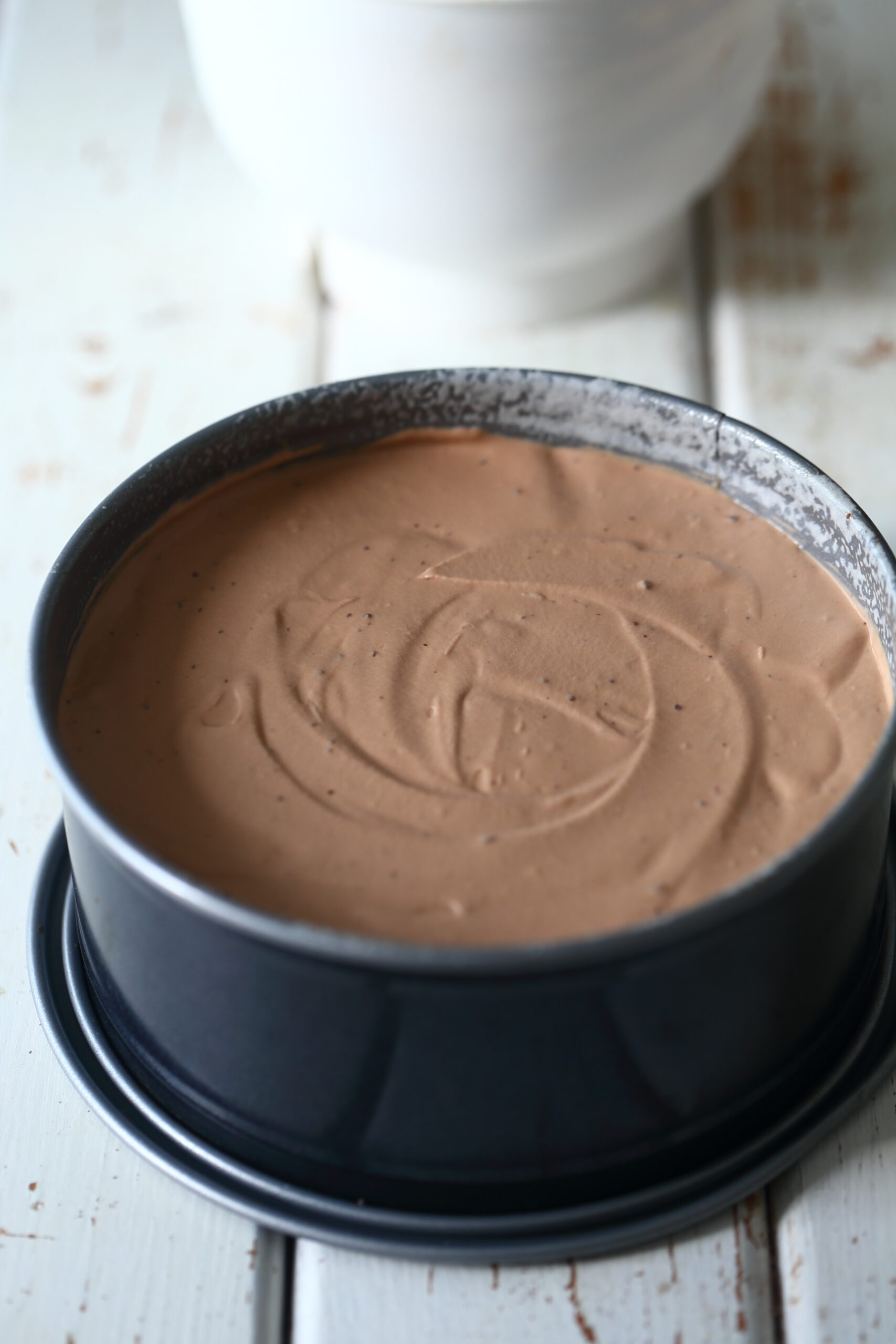 Myös pohjassa on kolme ainetta, vaikka sen olisi saanut yksinkertaisimmillaan tehtyä vain tummista kekseistä ja rasvasta. Käytin kuitenkin kakkuun kaapista löytyneitä digestivejä ja lisäsin joukkoon tummaa kaakaojauhetta. Se antoi keksipohjalle melko voimakkaan suklaisen maun jo pienellä määrällä.