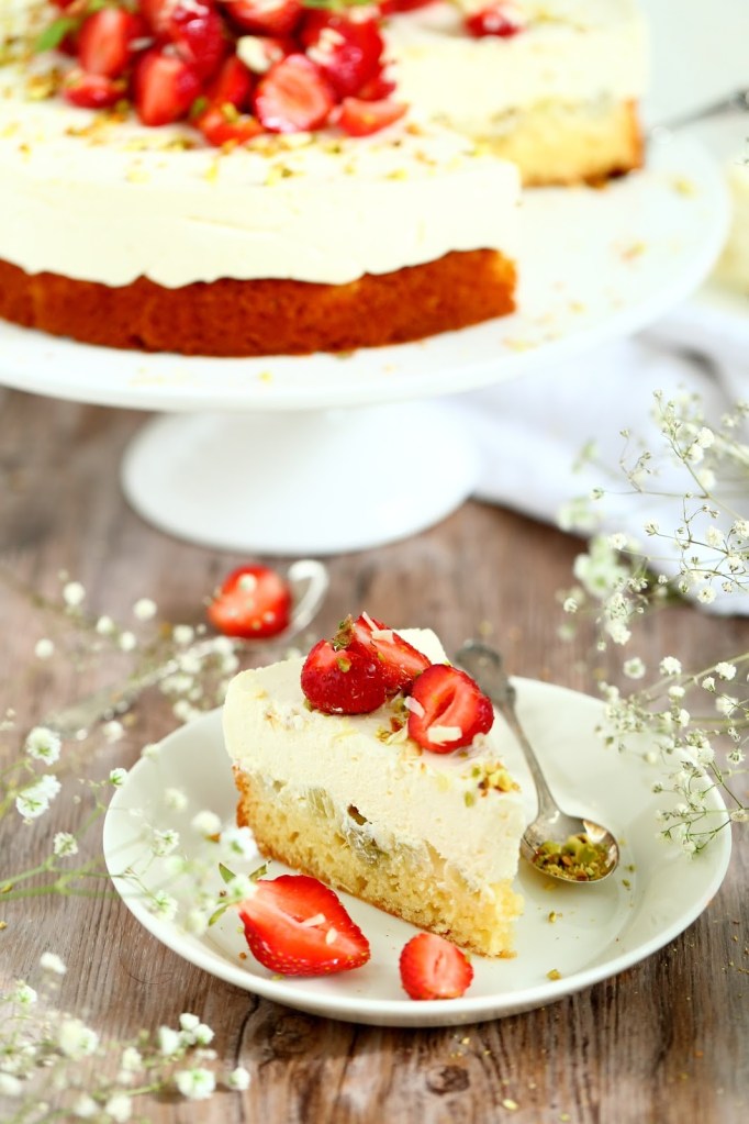 Raparperi-britakakussa on ihana makeankirpeä leivonnainen. Siinä maistuu rapea ja makea britakakku sekä kirpsakampi raparperi. Tässä britassa on vain yksi täytekerros, mutta kakun voi koota myös useampikerroksiseksi.