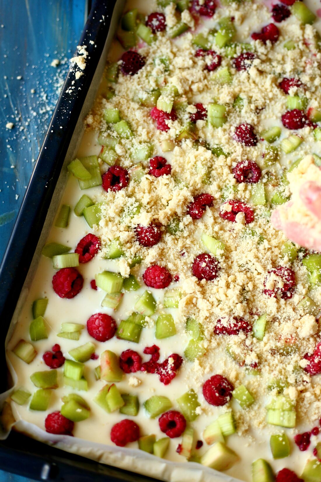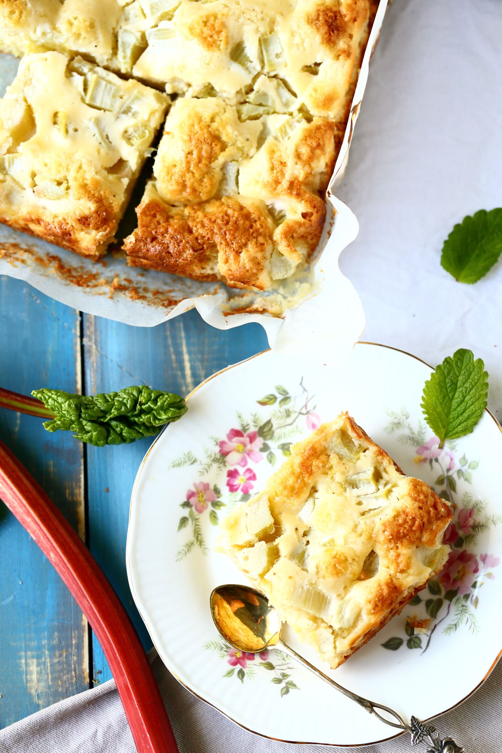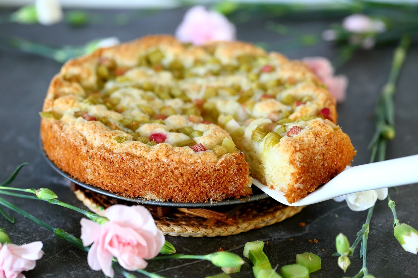 Helppo ja nopea raparperipiirakka syntyy ilman kananmunia. Se on siitä huolimatta (tai ehkä jopa sen takia) todella pehmeä ja mehevä.