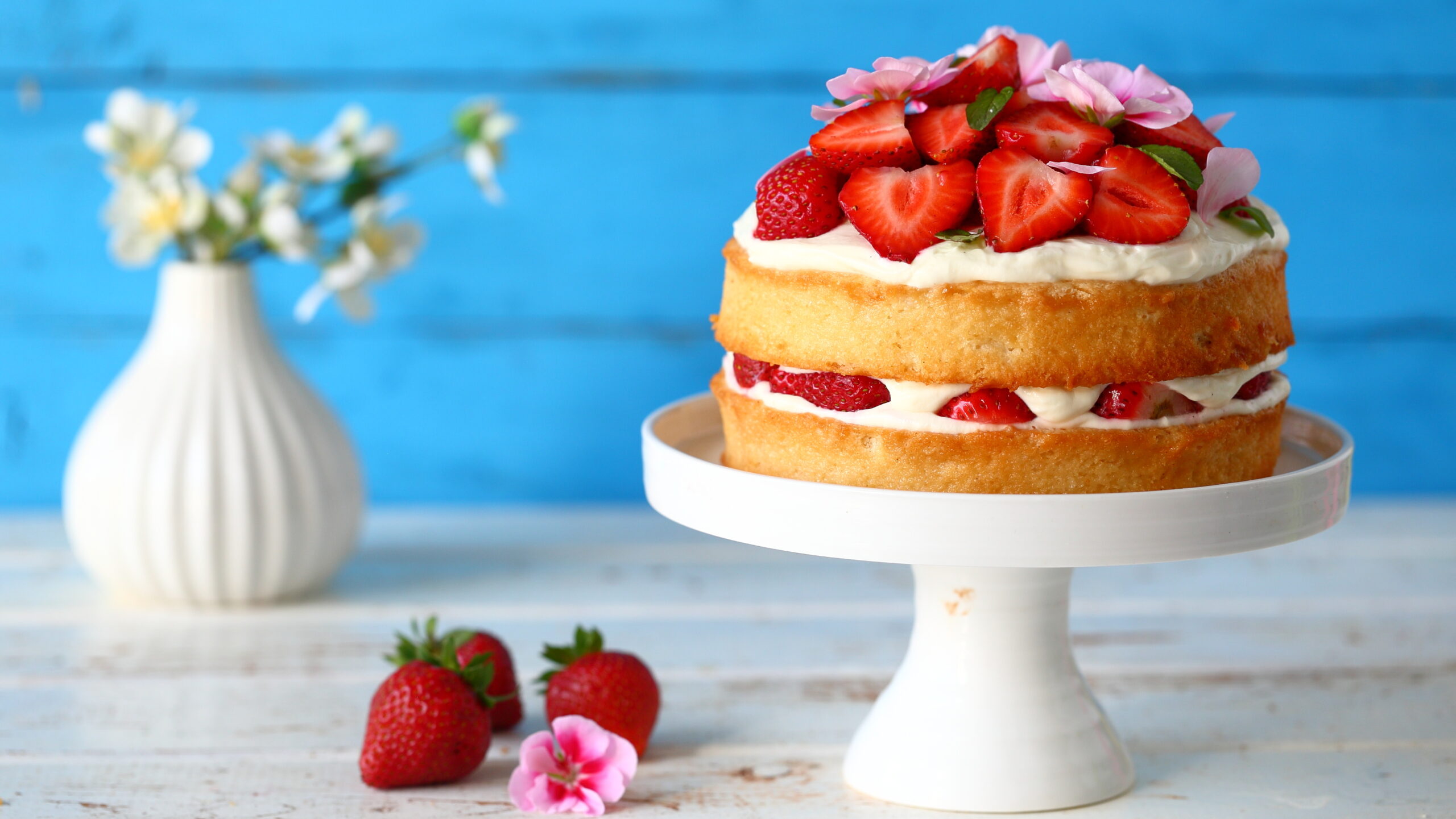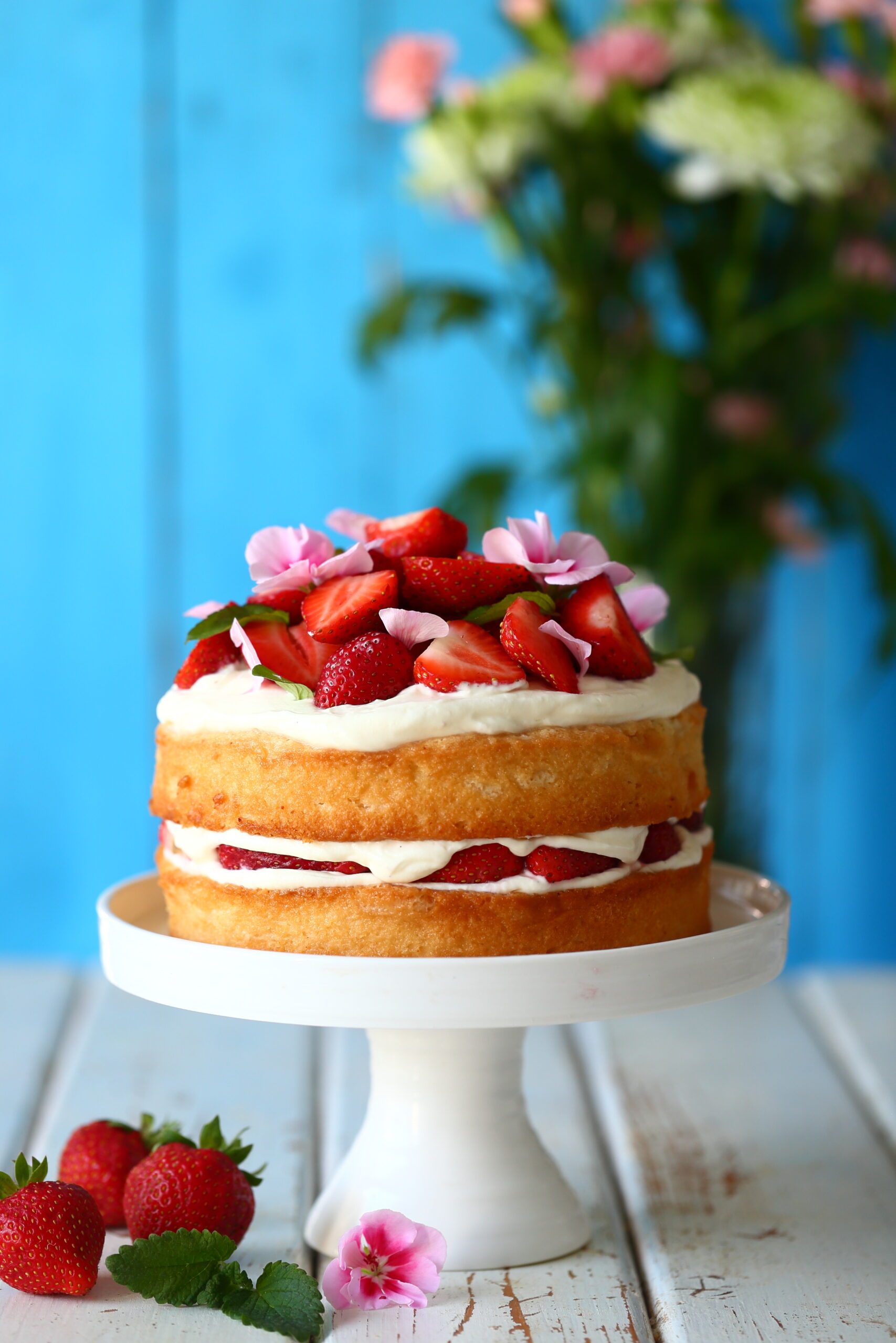 Asettele päällimmäiseksi kerros mansikoita. Koristele vielä esimerkiksi syötävillä kukilla ja sitruunamelissan lehdillä tai mintulla.